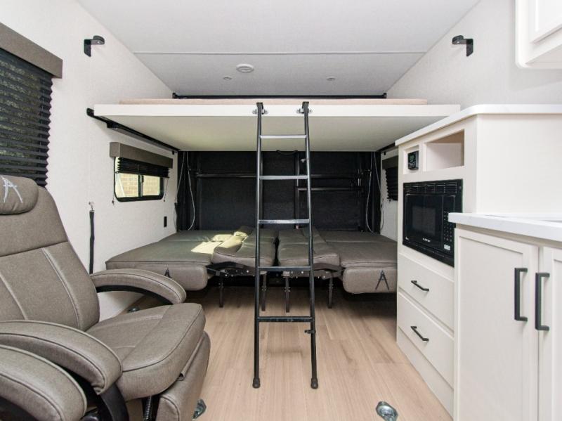 Bring your ATVs, motorcycles, kayaks, or gear—the 13' 6" garage gives you wide-open cargo space with no wheel wells to get in the way. Once unloaded, the rollover sofas and top bunk transform the area into a comfortable lounge or sleeping space for guests.