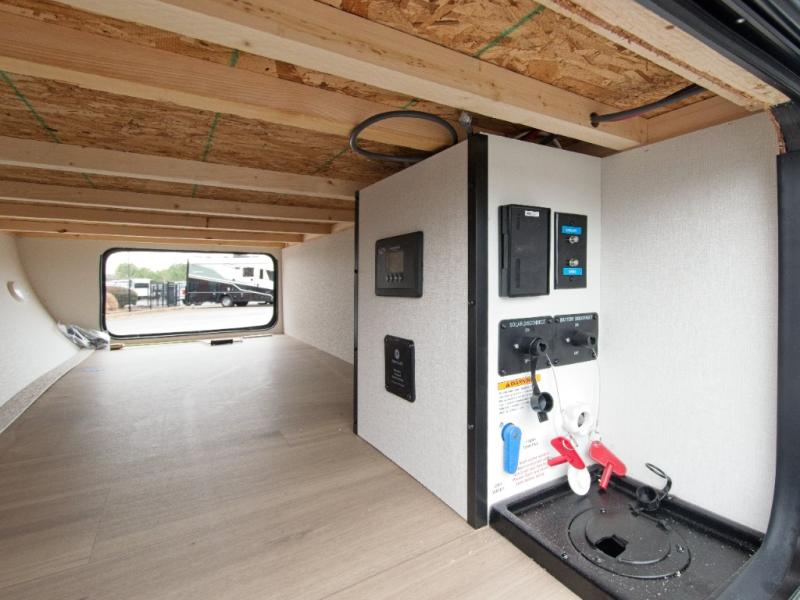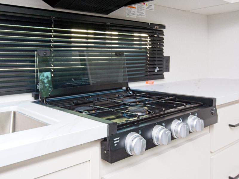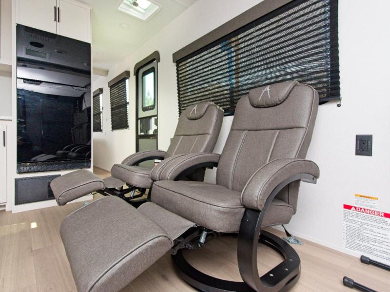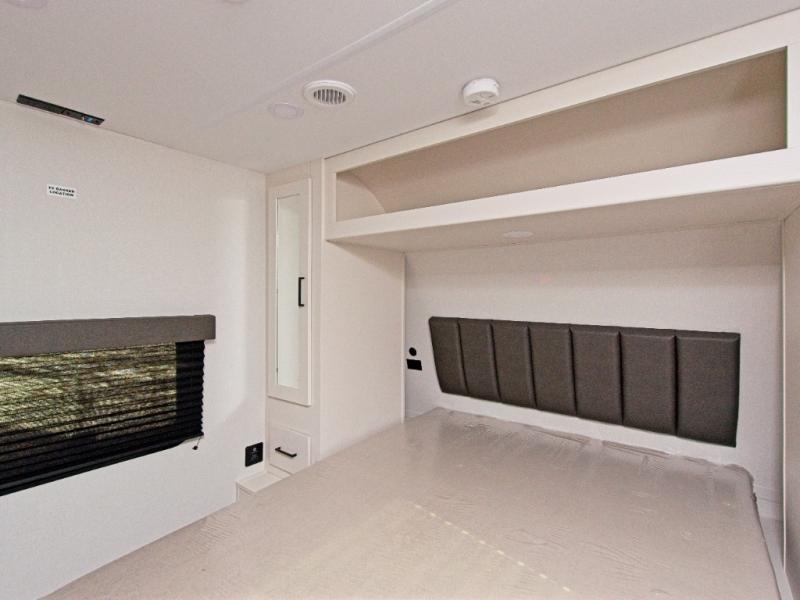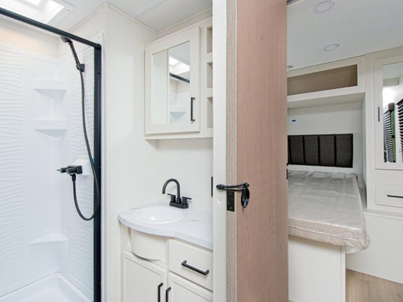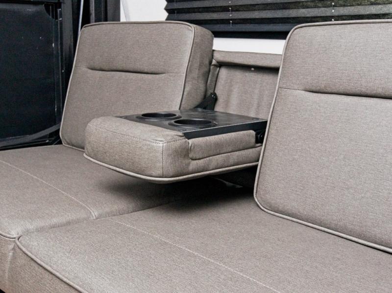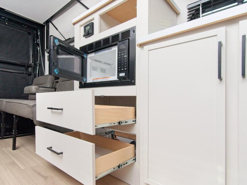 In the kitchen, you’ll find everything you need to fuel up for the day: a microwave, stainless steel sink, and an 8 cu. ft. 12V refrigerator to keep your food fresh on the go.