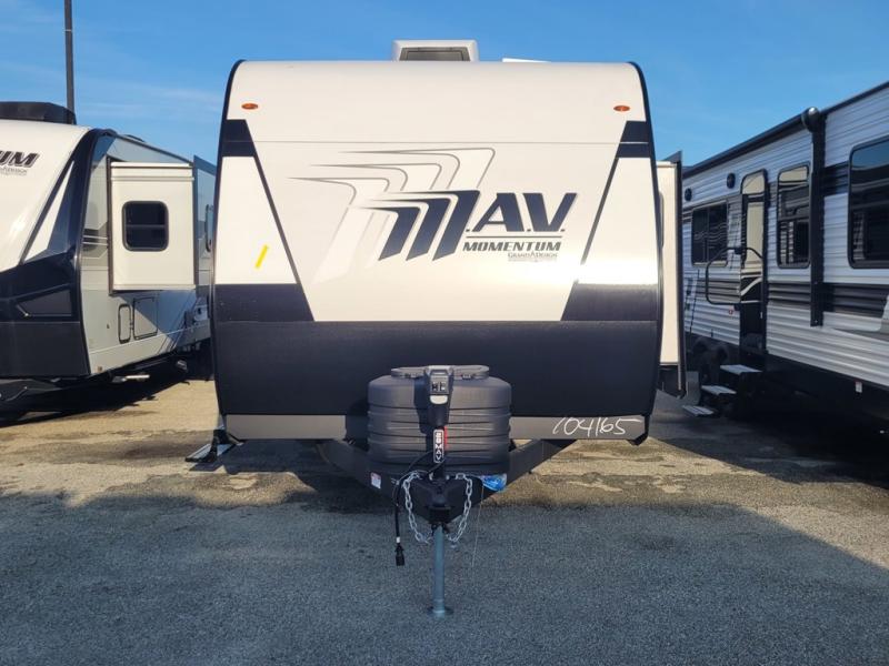 The Momentum MAV toy hauler travel trailers by Grand Design are designed to provide exactly what you need. The spacious garage provides tons of cargo space, with no wheel wells to get in the way. Additional storage includes magnetic storage door catches, and overhead consoles throughout. Conveniences like motion sensor lights and USB outlets will make your life easier, and you will be comfortable in all seasons with the 30K BTU furnace plus 15K BTU ducted air conditioning. The standard Solar Package comes with a 180W solar panel, a 40 Amp charge controller with Bluetooth, and a 12V refrigerator so you can go off-grid when the adventure calls for it.