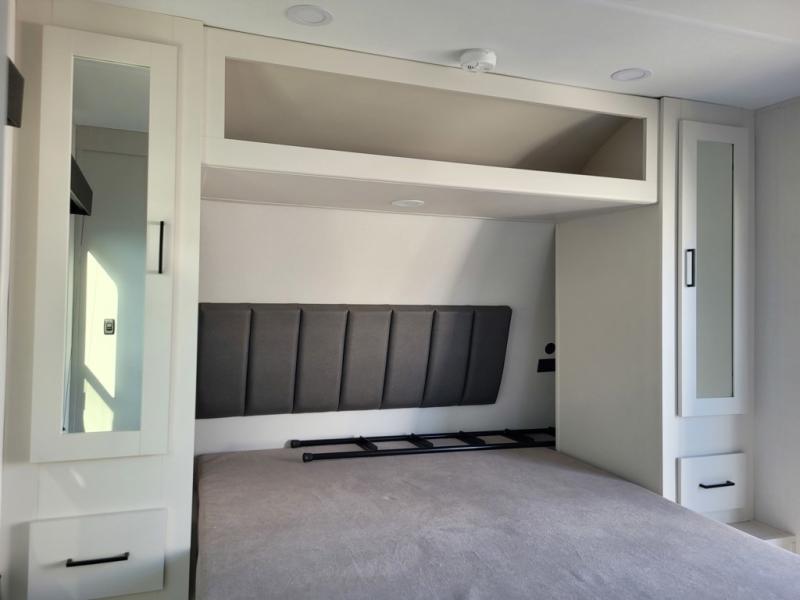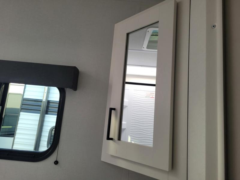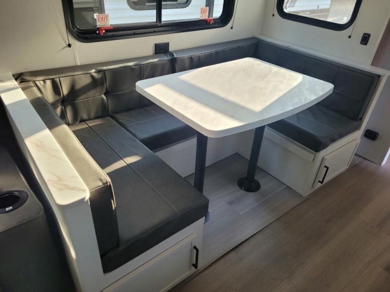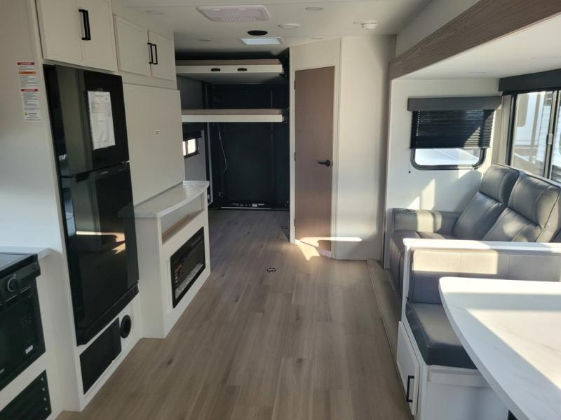 The spacious garage area is perfect for hauling your favorite toys, and the two entry/exit doors make it easy to get in and out. The front bedroom is a peaceful retreat, featuring a queen bed, wardrobes, and plenty of storage for your gear. Further in the heart of this unit, the U-shaped dinette is perfect for enjoying meals or game nights, and the pull-out trash makes cleanup a breeze. The kitchen is equipped with a microwave and 8 cu refrigerator, so you can fuel up for your next adventure. The theater seating is perfect for movie nights or catching up on your favorite shows, and the electric Happijac bunks provide a comfortable spot to rest. The full bathroom is a refreshing oasis, equipped with everything you need to start your day feeling revitalized.