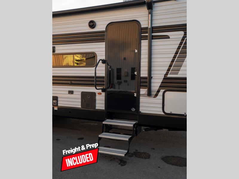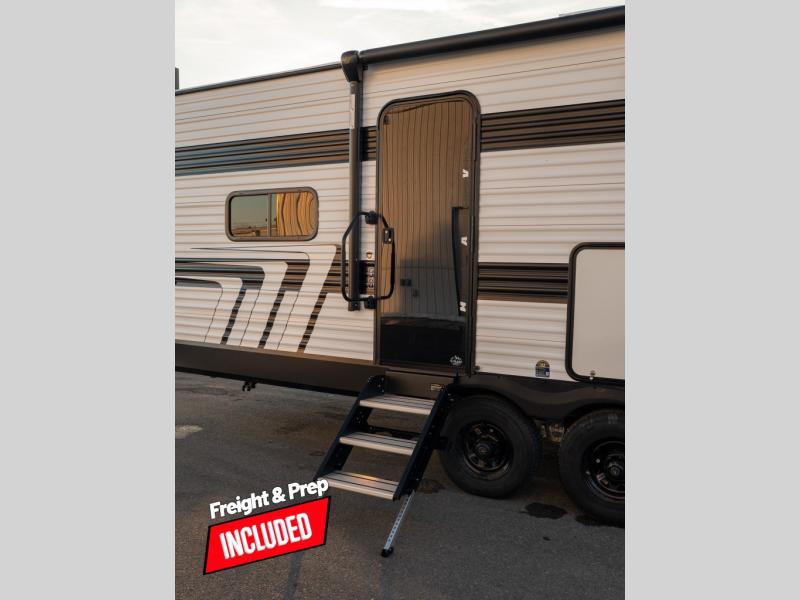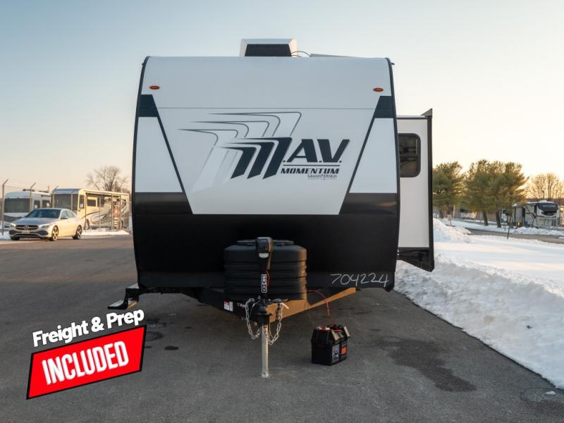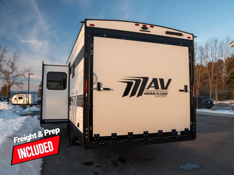 The Momentum MAV toy hauler travel trailers by Grand Design are designed to provide exactly what you need. The spacious garage provides tons of cargo space, with no wheel wells to get in the way. Additional storage includes magnetic storage door catches, and overhead consoles throughout. Conveniences like motion sensor lights and USB outlets will make your life easier, and you will be comfortable in all seasons with the 30K BTU furnace plus 15K BTU ducted air conditioning. The standard Solar Package comes with a 180W solar panel, a 40 Amp charge controller with Bluetooth, and a 12V refrigerator so you can go off-grid when the adventure calls for it.