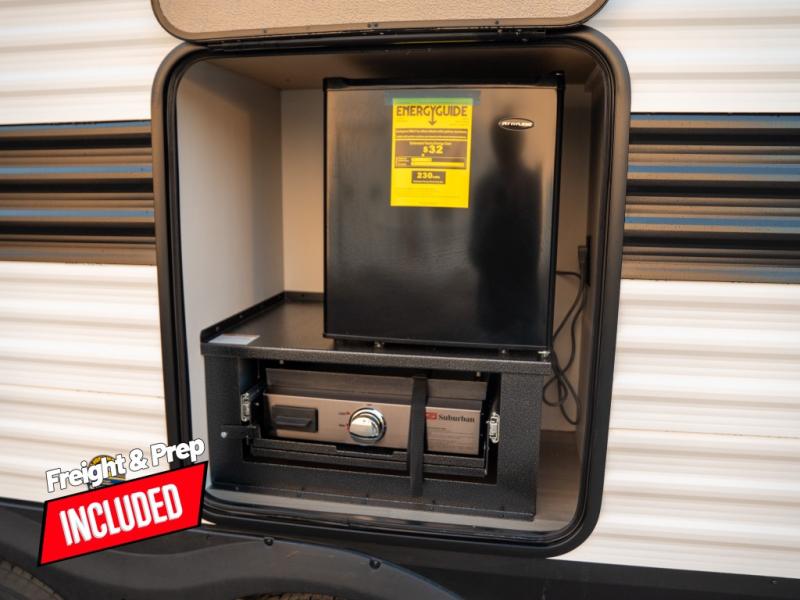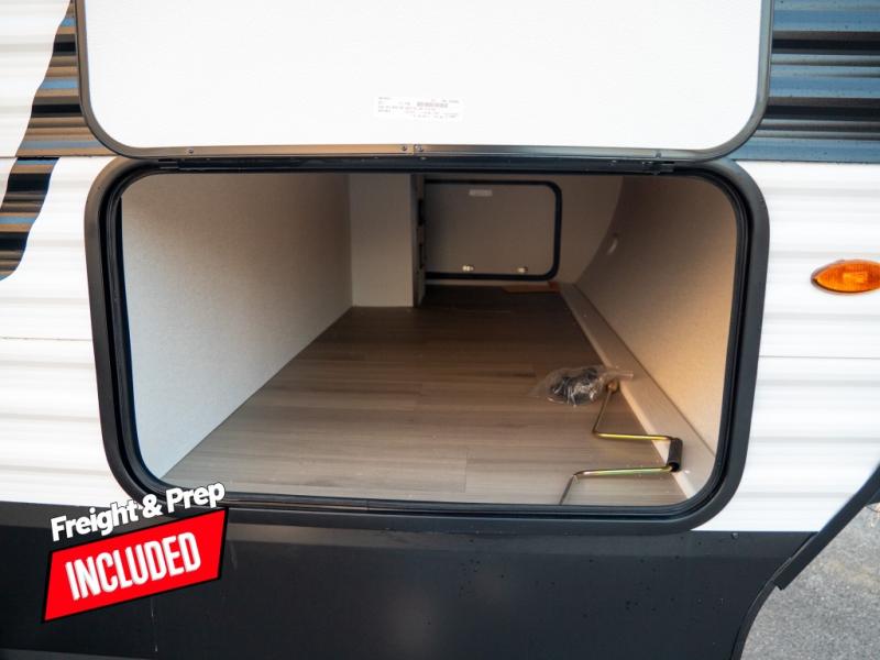 The spacious garage area is perfect for hauling your favorite toys, and the two entry/exit doors make it easy to get in and out. The front bedroom is a peaceful retreat, featuring a queen bed, wardrobes, and plenty of storage for your gear. Further in the heart of this unit, the U-shaped dinette is perfect for enjoying meals or game nights, and the pull-out trash makes cleanup a breeze. The kitchen is equipped with a microwave and 8 cu refrigerator, so you can fuel up for your next adventure. The theater seating is perfect for movie nights or catching up on your favorite shows, and the electric Happijac bunks provide a comfortable spot to rest. The full bathroom is a refreshing oasis, equipped with everything you need to start your day feeling revitalized.