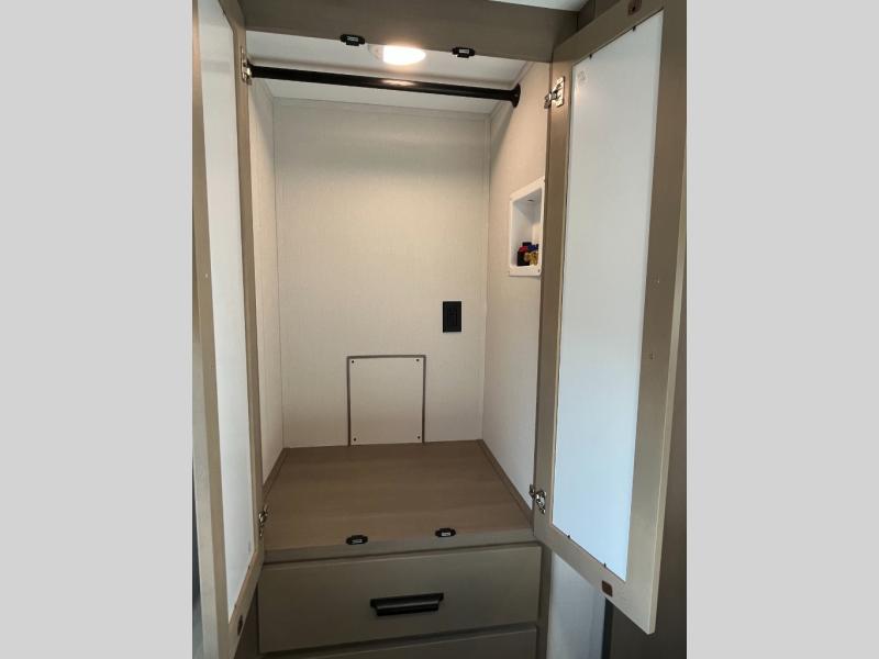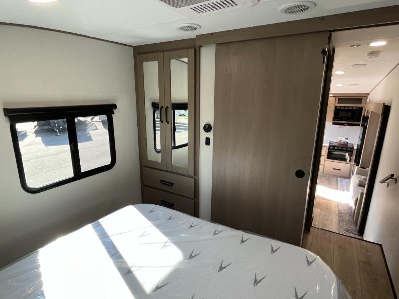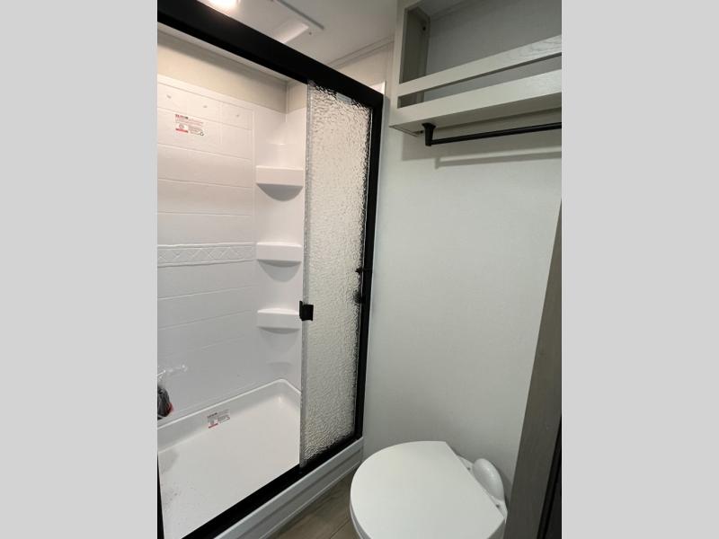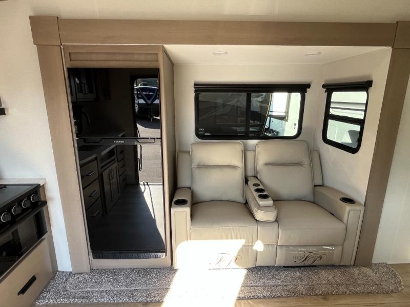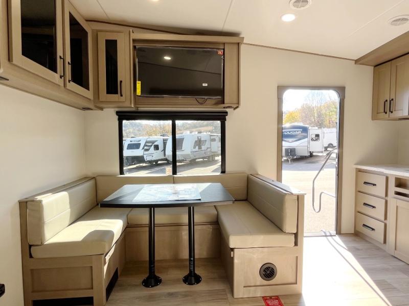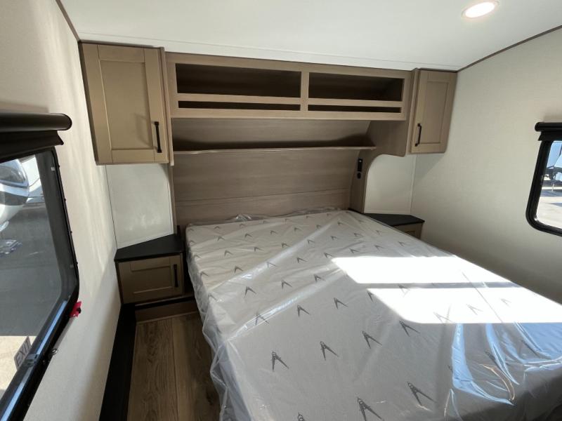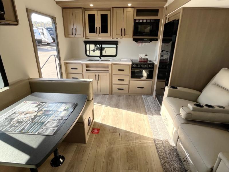 This rear kitchen fifth wheel is sure to meet all of your camping needs! Since the exterior length is only 26' 11", you can easily maneuver in and out of campgrounds. The rear kitchen includes ample counter space to prep meals, a three burner cooktop, and overhead storage for all your necessities. There is a 10 cu. ft. 12V refrigerator within the slide out that also includes the theater seating, and the U-shaped dinette provides a place to dine or play a card game. You will appreciate having convenient storage by the entry door, along with pull-out pet bowls, a functional wardrobe closet in the bedroom and an exterior pass-thru for belongings and camping gear. When you're ready to turn in for the night, the queen bed is sure to bring a great night's rest, while your guests sleep on the booth dinette or optional tri-fold sofa if you replace the theater seating!