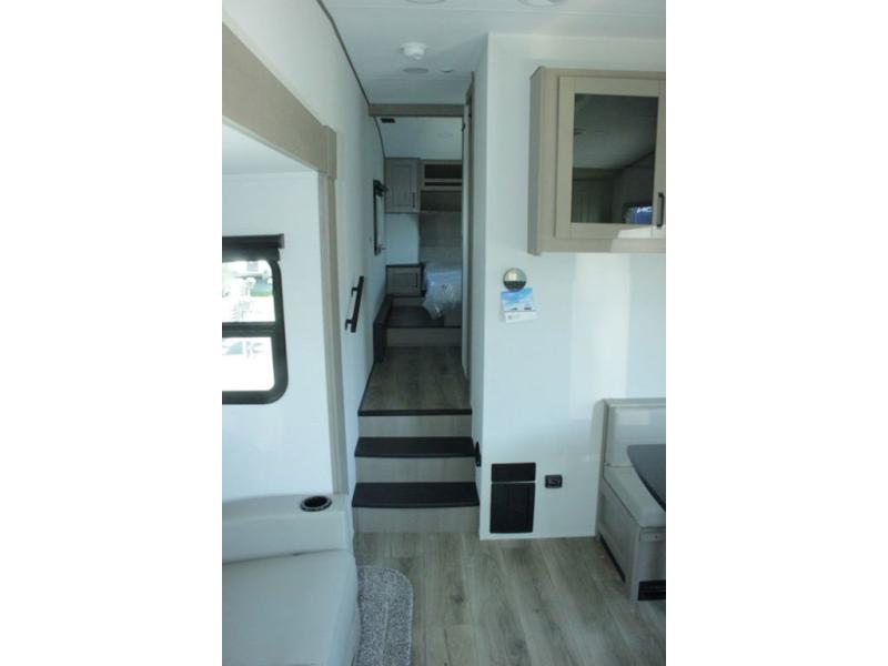 This rear kitchen fifth wheel is sure to meet all of your camping needs! Since the exterior length is only 26' 11", you can easily maneuver in and out of campgrounds. The rear kitchen includes ample counter space to prep meals, a three burner cooktop, and overhead storage for all your necessities. There is a 10 cu. ft. 12V refrigerator within the slide out that also includes the theater seating, and the U-shaped dinette provides a place to dine or play a card game. You will appreciate having convenient storage by the entry door, along with pull-out pet bowls, a functional wardrobe closet in the bedroom and an exterior pass-thru for belongings and camping gear. When you're ready to turn in for the night, the queen bed is sure to bring a great night's rest, while your guests sleep on the booth dinette or optional tri-fold sofa if you replace the theater seating!