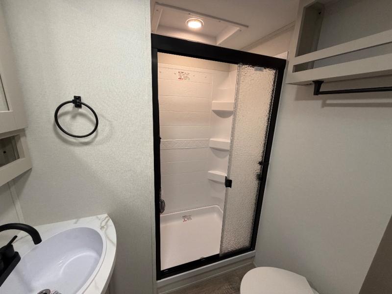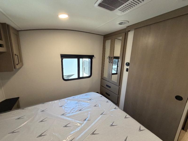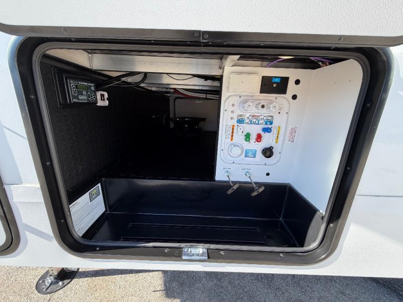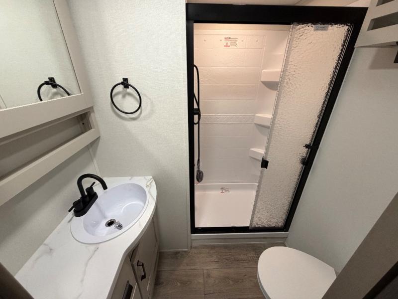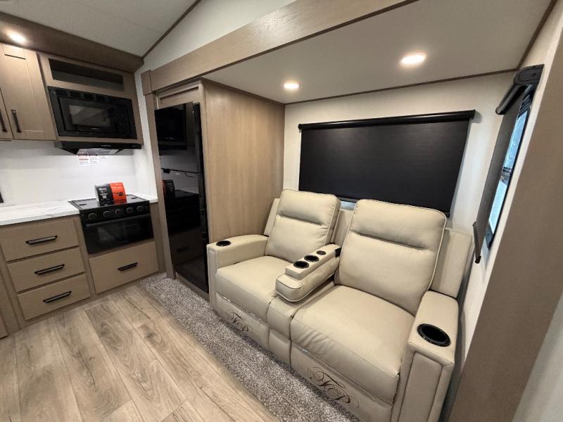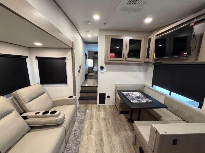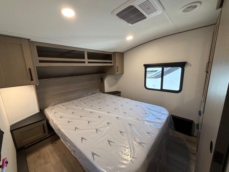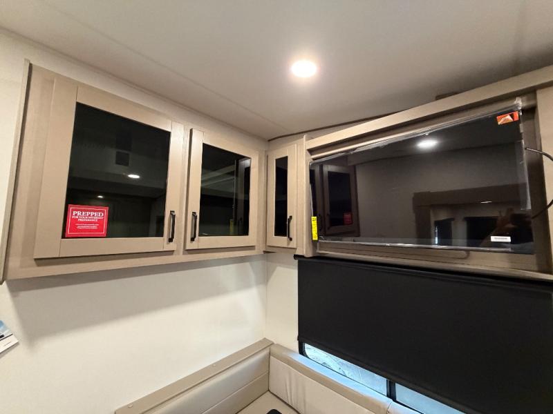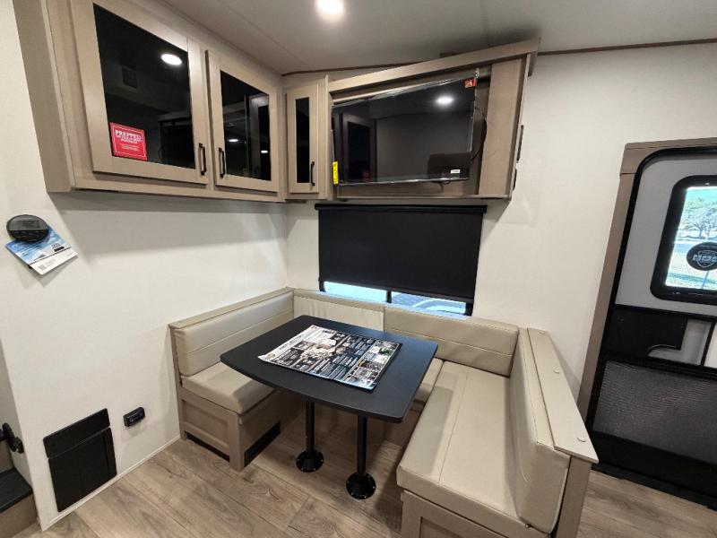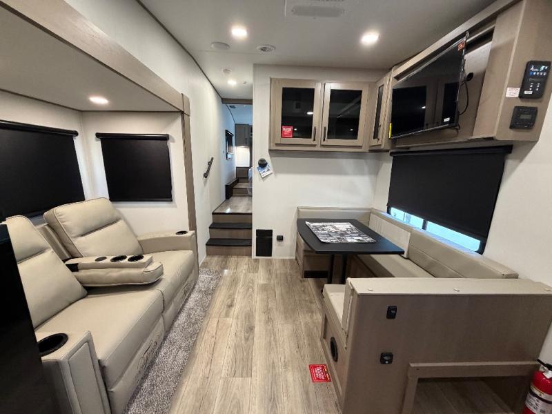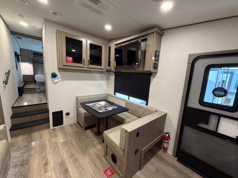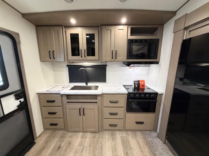 This rear kitchen fifth wheel is sure to meet all of your camping needs! Since the exterior length is only 26' 11", you can easily maneuver in and out of campgrounds. The rear kitchen includes ample counter space to prep meals, a three burner cooktop, and overhead storage for all your necessities. There is a 10 cu. ft. 12V refrigerator within the slide out that also includes the theater seating, and the U-shaped dinette provides a place to dine or play a card game. You will appreciate having convenient storage by the entry door, along with pull-out pet bowls, a functional wardrobe closet in the bedroom and an exterior pass-thru for belongings and camping gear. When you're ready to turn in for the night, the queen bed is sure to bring a great night's rest, while your guests sleep on the booth dinette or optional tri-fold sofa if you replace the theater seating!