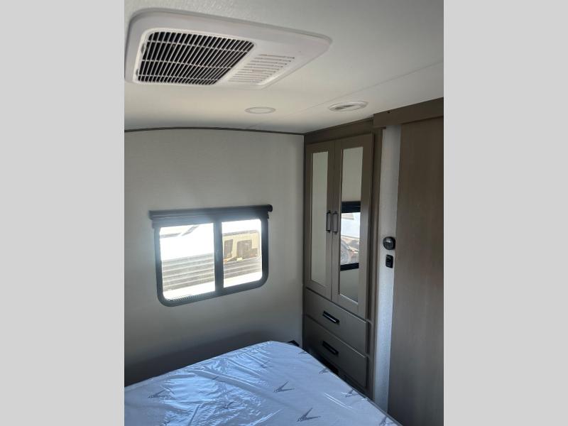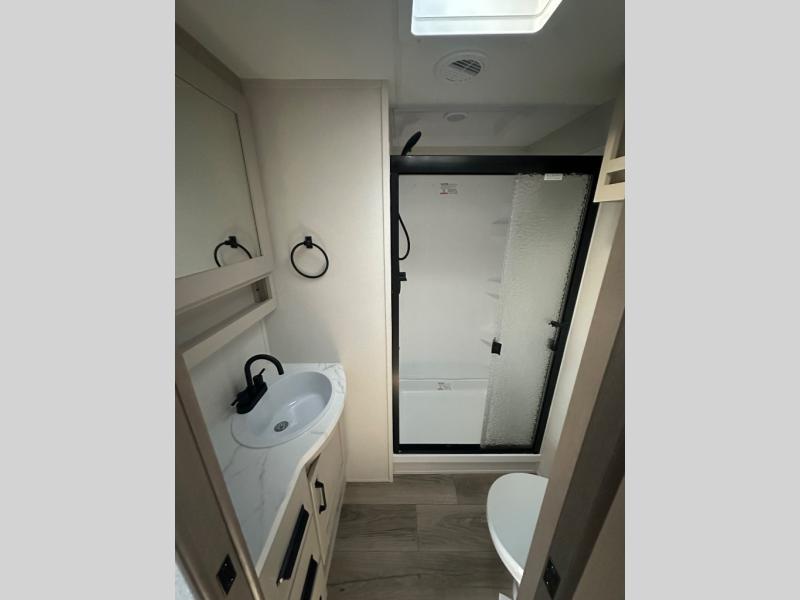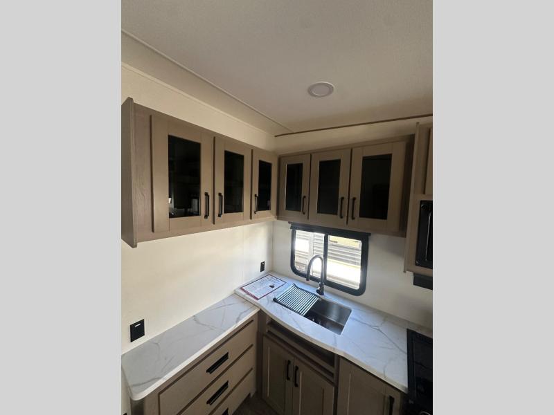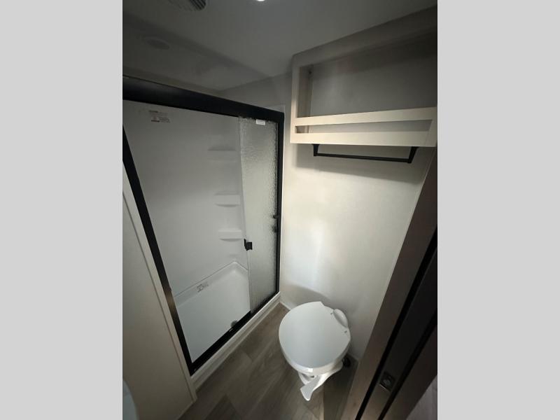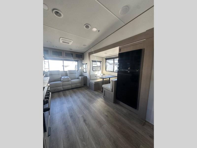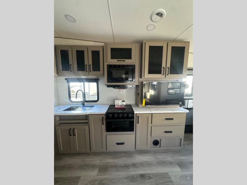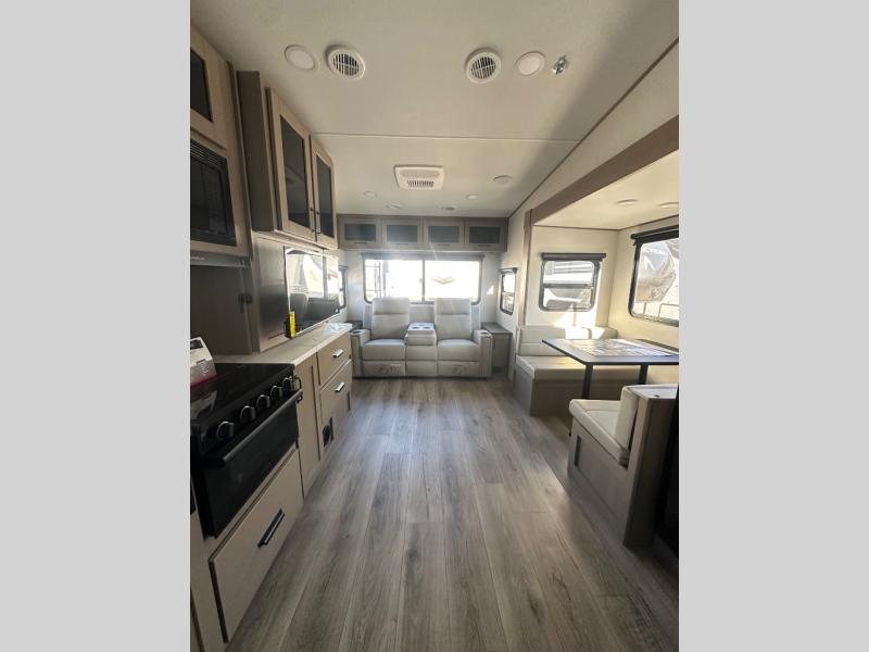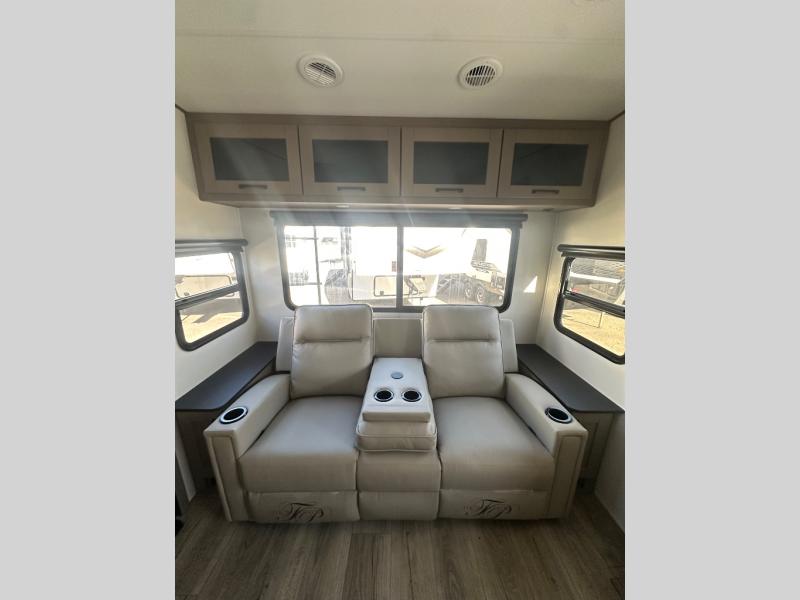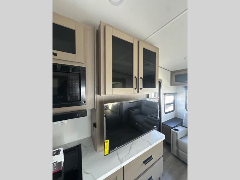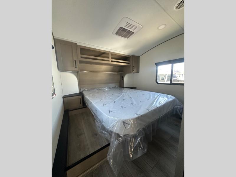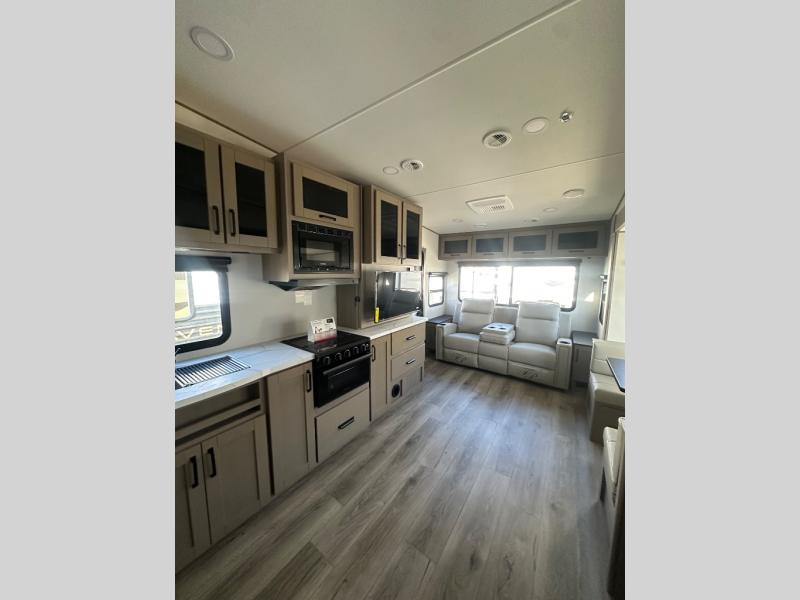 This is the perfect couple's trailer with a space for an overnight guest or two little ones on the booth dinette. You can switch out this dinette for an optional swivel dinette as well, and the standard theater seating can be replaced by an optional trundle bed if you need more sleeping space. A 40" HDTV will keep you entertained when the weather isn't cooperating, and you can whip up your best meals in the full kitchen. And a 19' power awning will provide shade if you choose to take your plate outdoors! The spacious full bath will let you clean up each day, and you'll feel right at home in the front private bedroom with a queen bed!