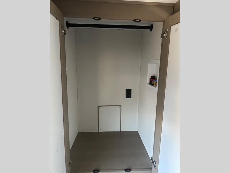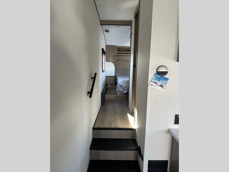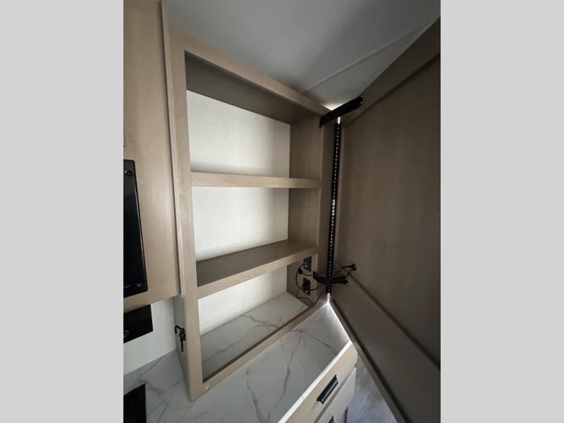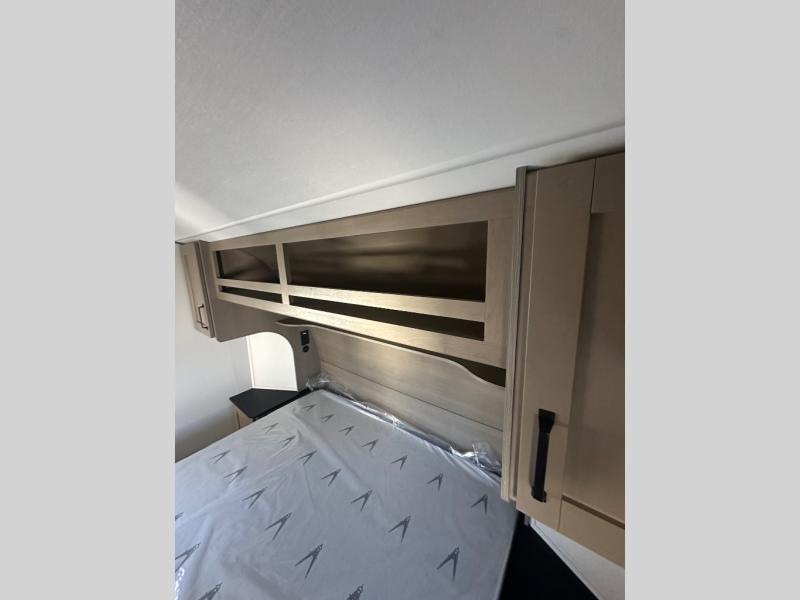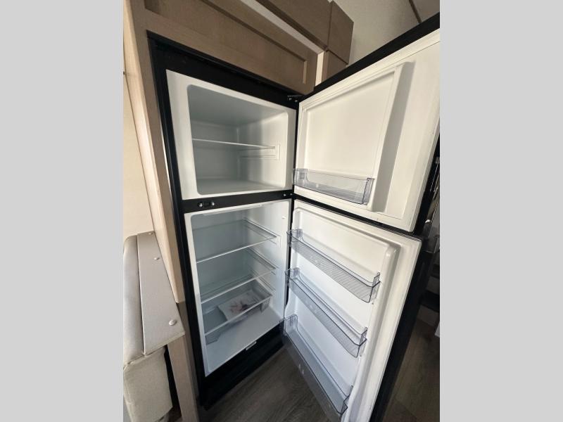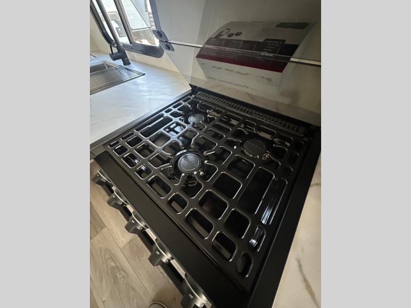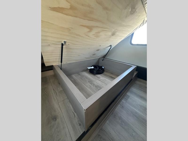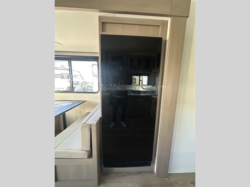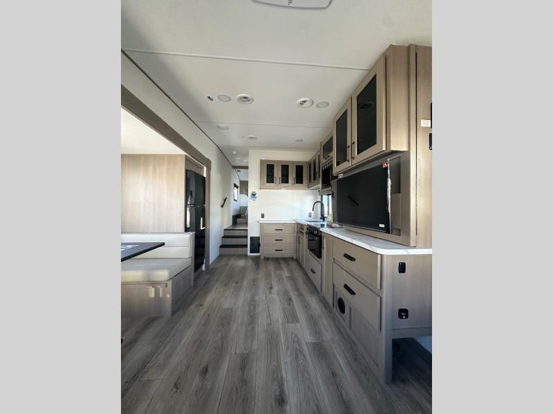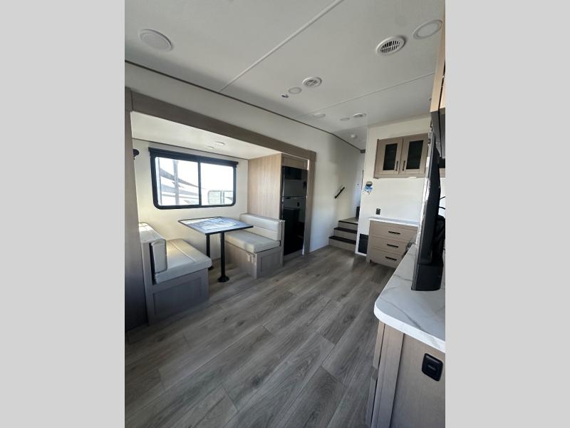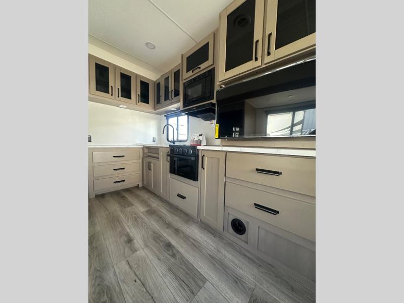 This is the perfect couple's trailer with a space for an overnight guest or two little ones on the booth dinette. You can switch out this dinette for an optional swivel dinette as well, and the standard theater seating can be replaced by an optional trundle bed if you need more sleeping space. A 40" HDTV will keep you entertained when the weather isn't cooperating, and you can whip up your best meals in the full kitchen. And a 19' power awning will provide shade if you choose to take your plate outdoors! The spacious full bath will let you clean up each day, and you'll feel right at home in the front private bedroom with a queen bed!