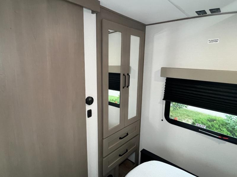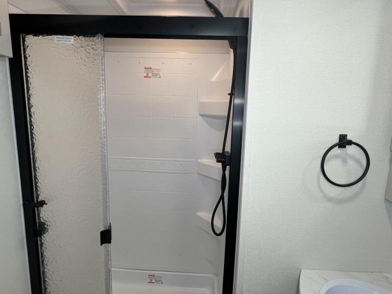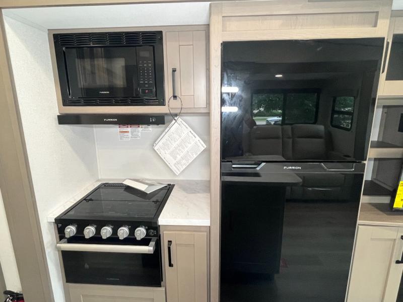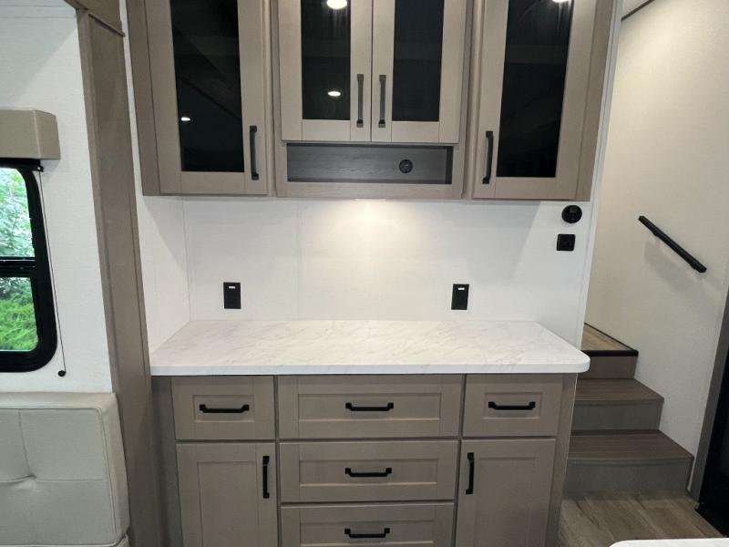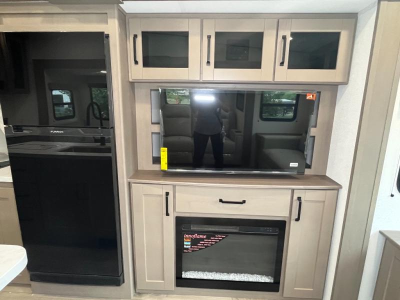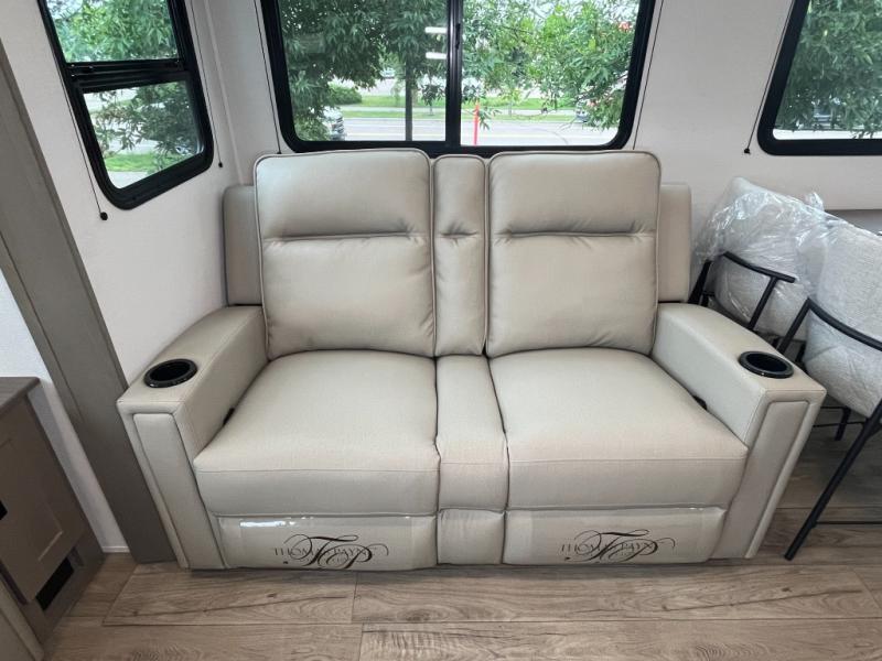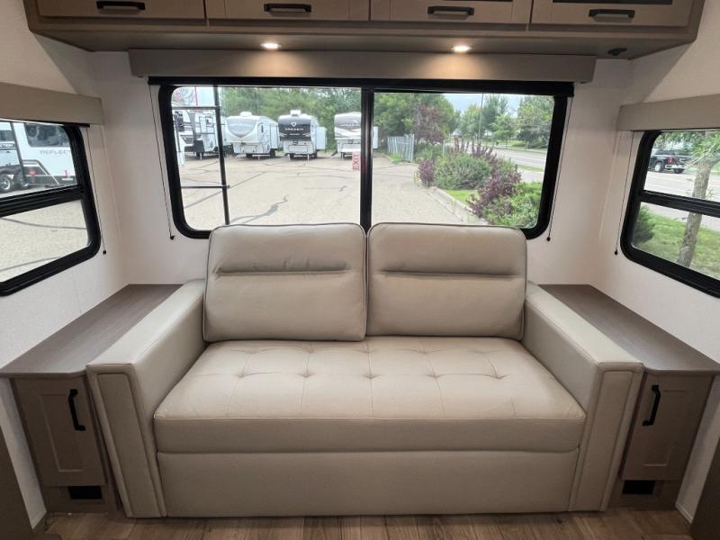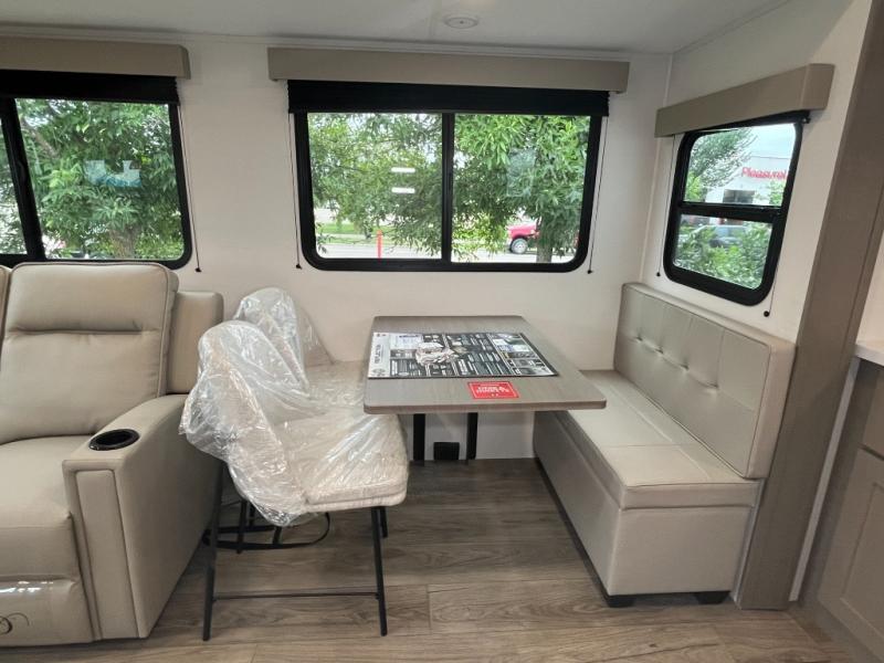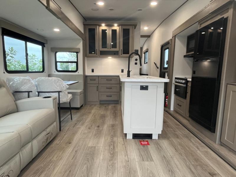 You'll love the amount of space you have in this fifth wheel thanks to the dual opposing slides in the rear living area/kitchen. Your friends and family can relax on the tri-fold sofa or theater seating across from the high-definition 40" LED TV. There is also a booth dinette or you can choose the optional swivel dinette if you prefer that seating. The chef of your group will appreciate having a kitchen island that will provide more counter space, plus there is a hutch with overhead cabinets for nice dishes. A full bath onboard lets you clean up each day and the front private bedroom includes a queen bed just like at home. You'll also love spending time outdoors under the electric awning, and there is an unobstructed pass-thru storage for fishing poles, hiking gear, and camp chairs!