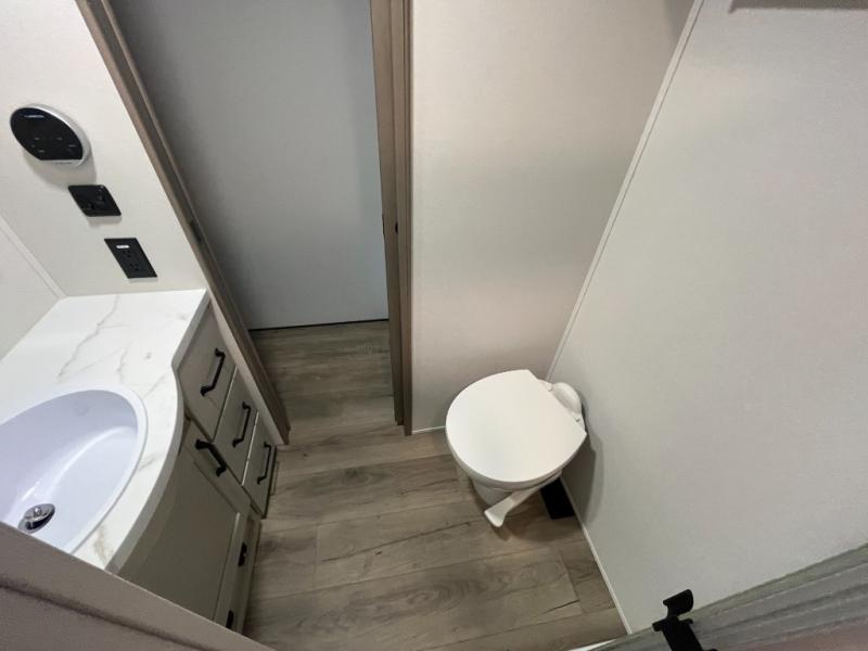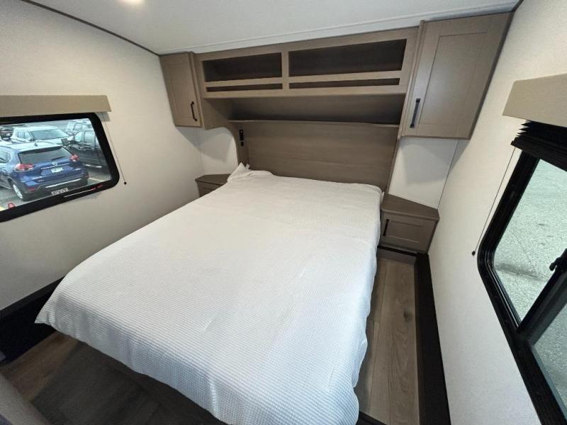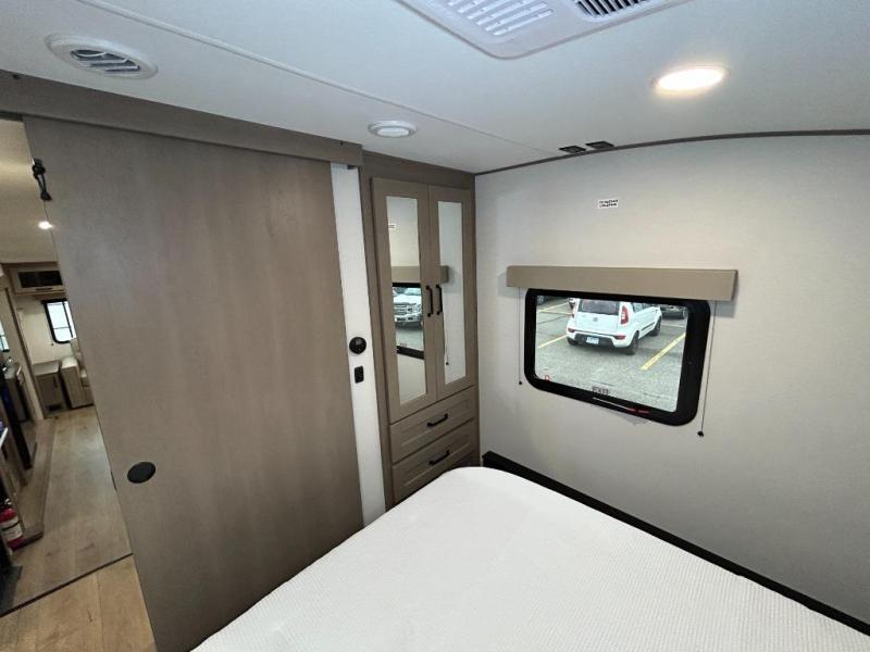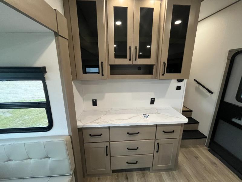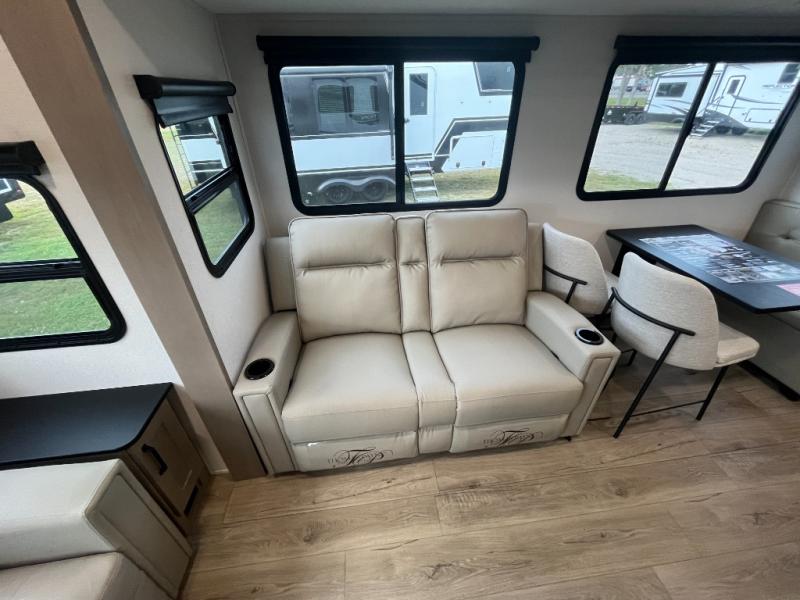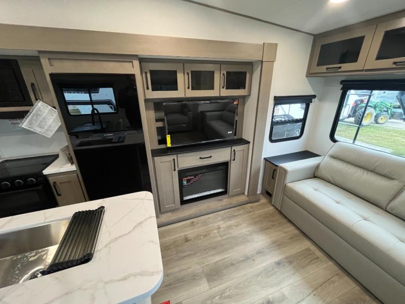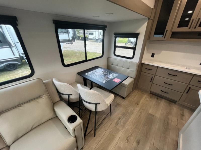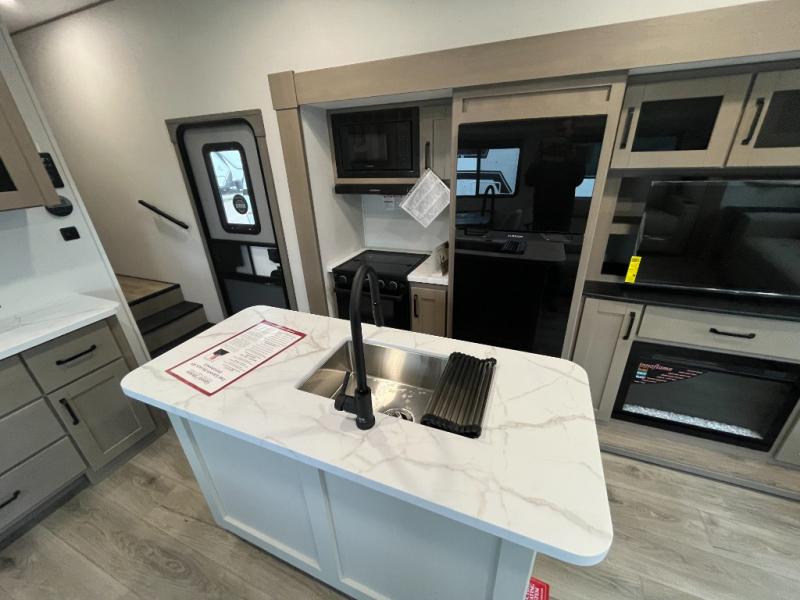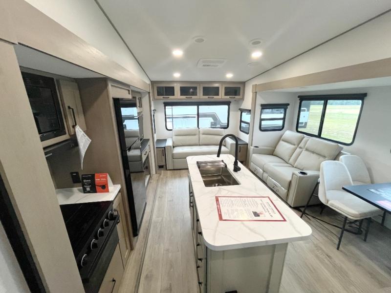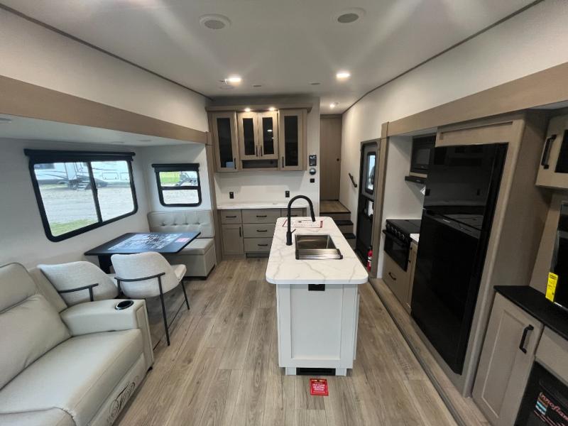 You'll love the amount of space you have in this fifth wheel thanks to the dual opposing slides in the rear living area/kitchen. Your friends and family can relax on the tri-fold sofa or theater seating across from the high-definition 40" LED TV. There is also a booth dinette or you can choose the optional swivel dinette if you prefer that seating. The chef of your group will appreciate having a kitchen island that will provide more counter space, plus there is a hutch with overhead cabinets for nice dishes. A full bath onboard lets you clean up each day and the front private bedroom includes a queen bed just like at home. You'll also love spending time outdoors under the electric awning, and there is an unobstructed pass-thru storage for fishing poles, hiking gear, and camp chairs!