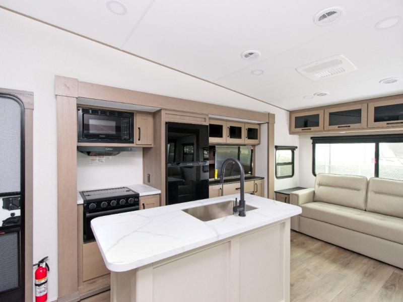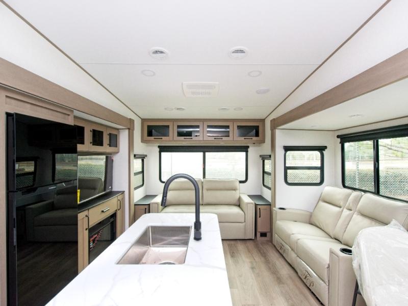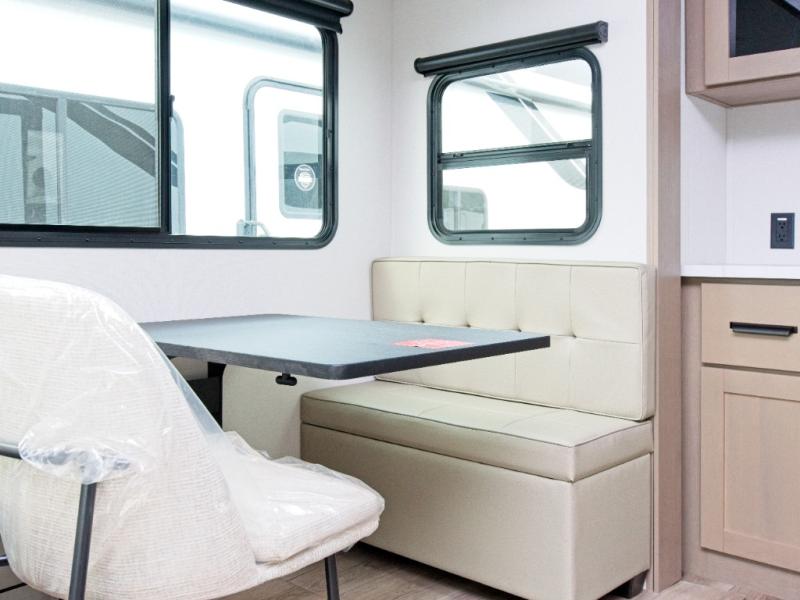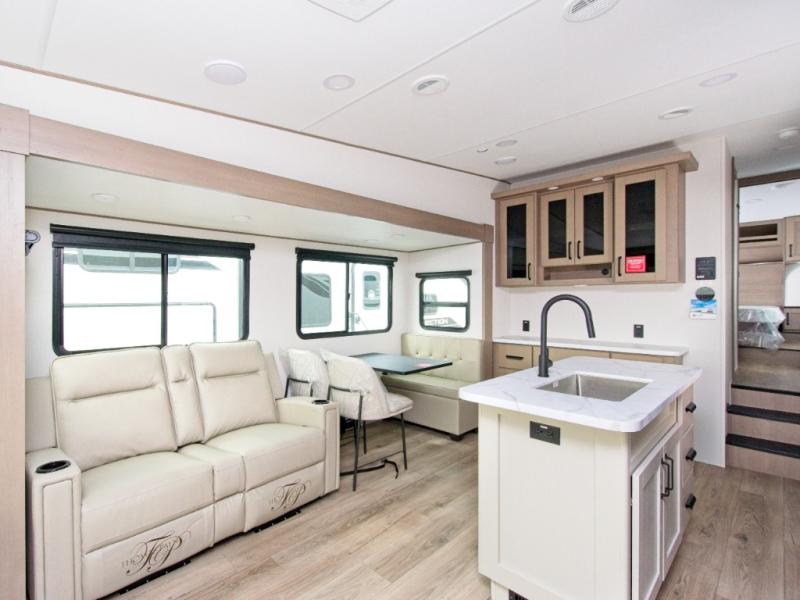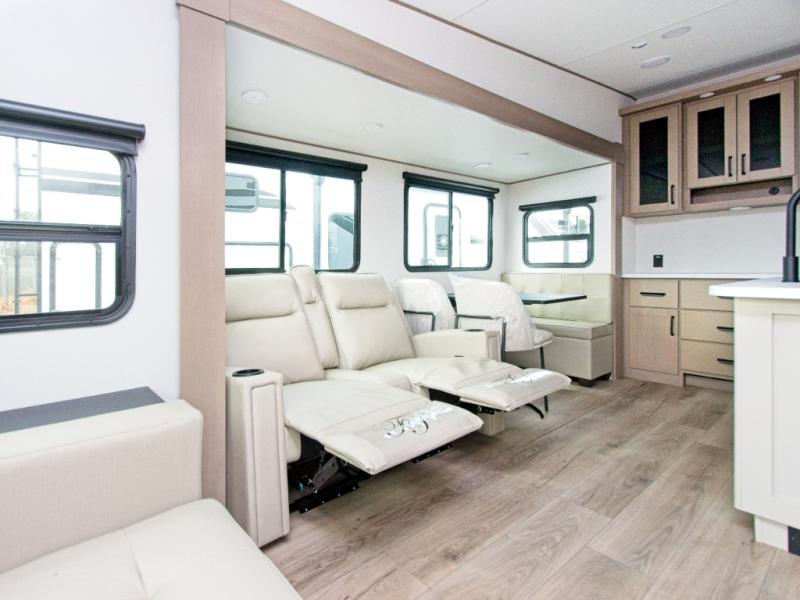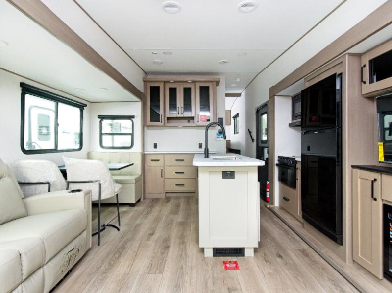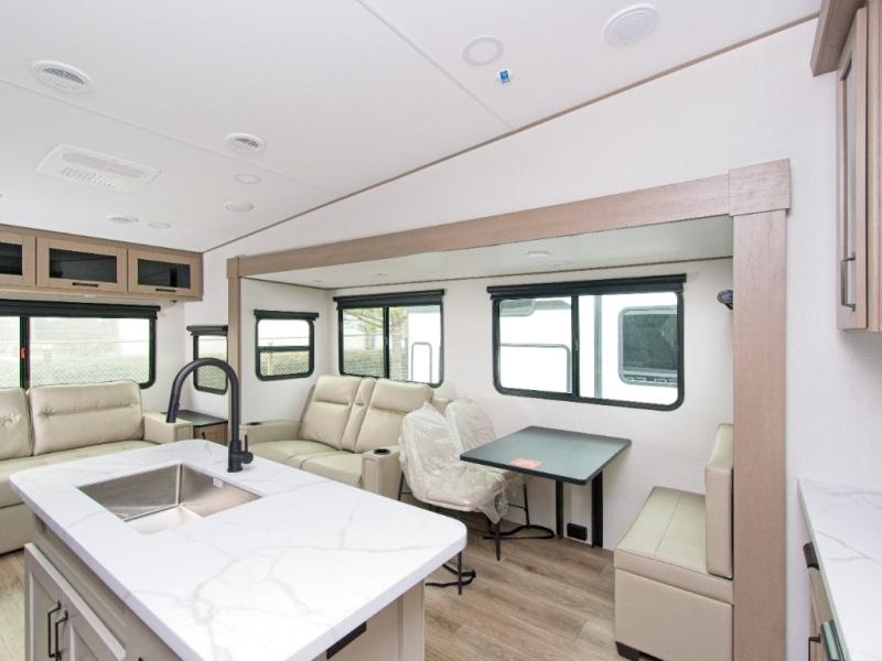 You'll love the amount of space you have in this fifth wheel thanks to the dual opposing slides in the rear living area/kitchen. Your friends and family can relax on the tri-fold sofa or theater seating across from the high-definition 40" LED TV. There is also a booth dinette or you can choose the optional swivel dinette if you prefer that seating. The chef of your group will appreciate having a kitchen island that will provide more counter space, plus there is a hutch with overhead cabinets for nice dishes. A full bath onboard lets you clean up each day and the front private bedroom includes a queen bed just like at home. You'll also love spending time outdoors under the electric awning, and there is an unobstructed pass-thru storage for fishing poles, hiking gear, and camp chairs!
