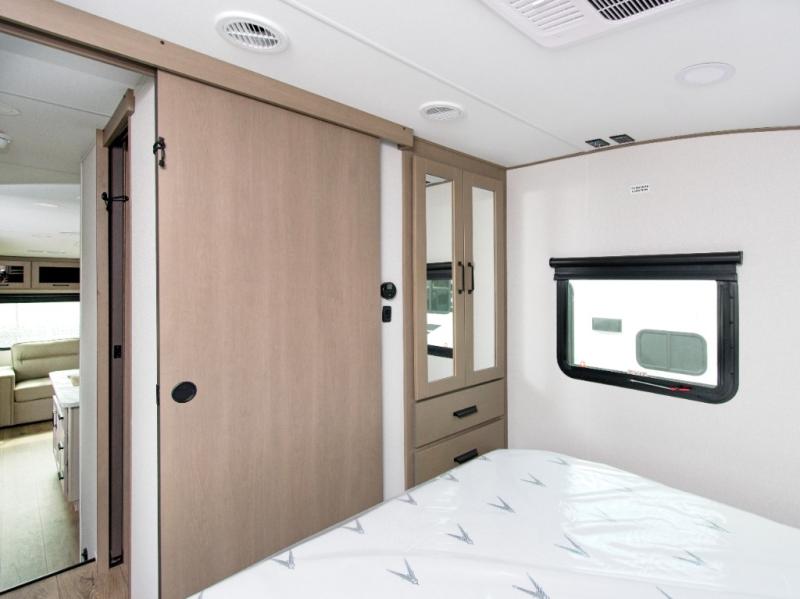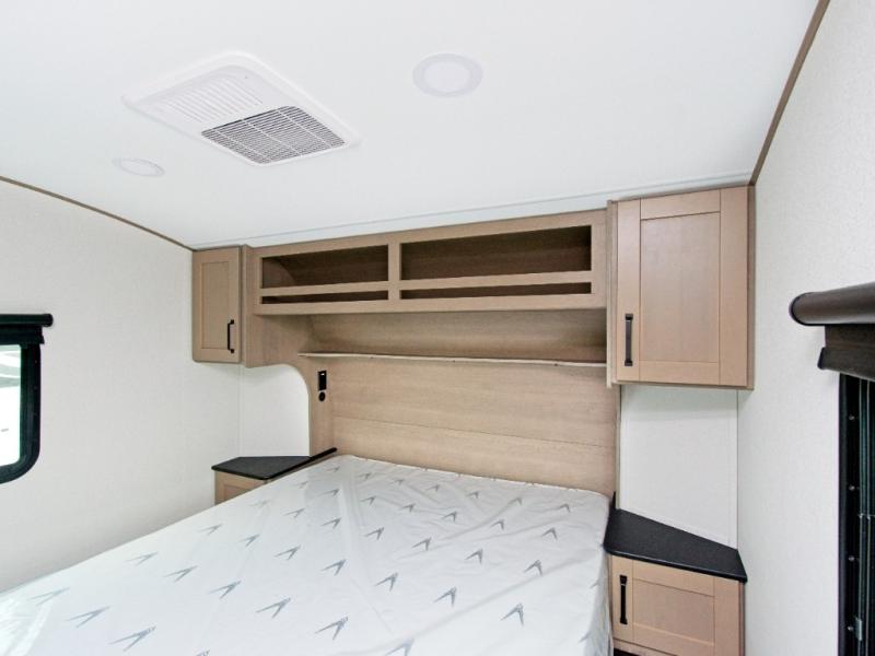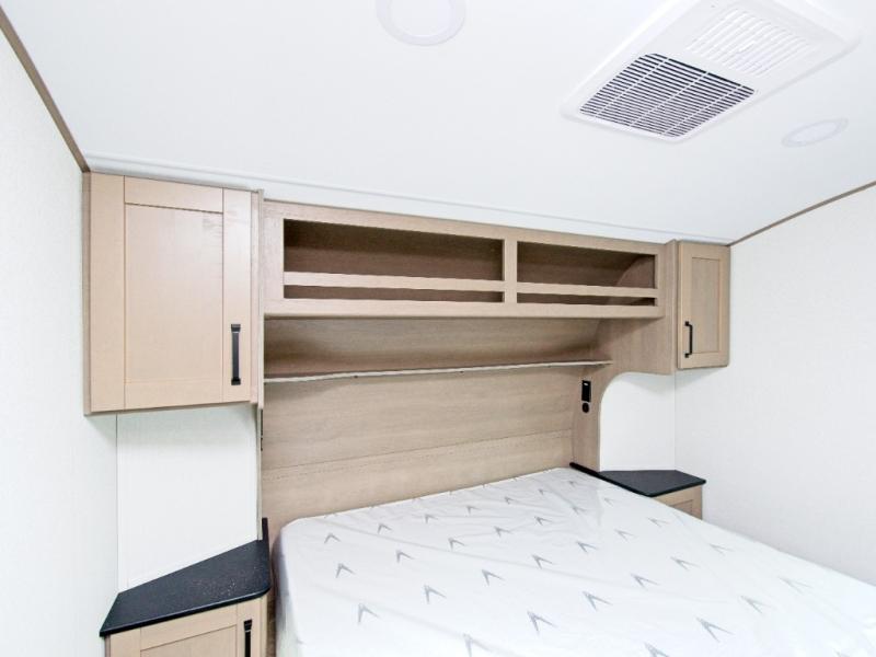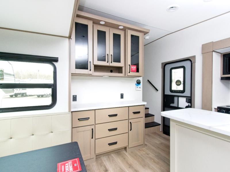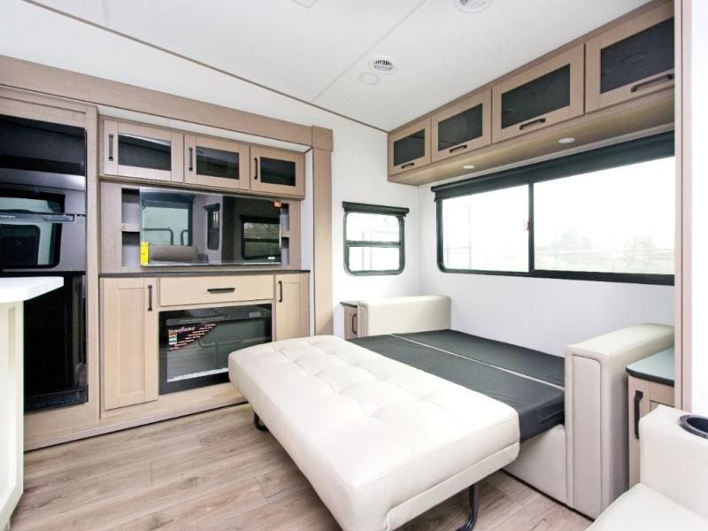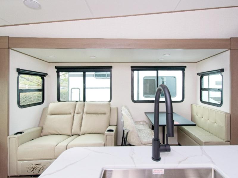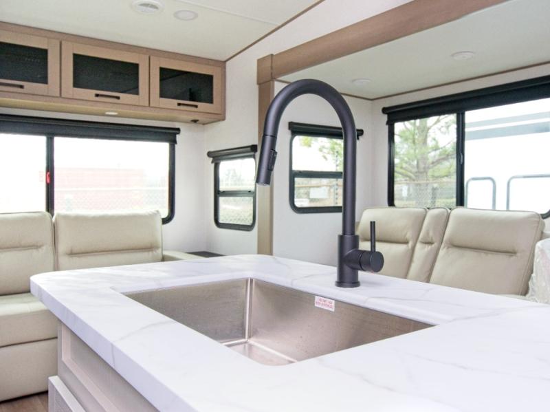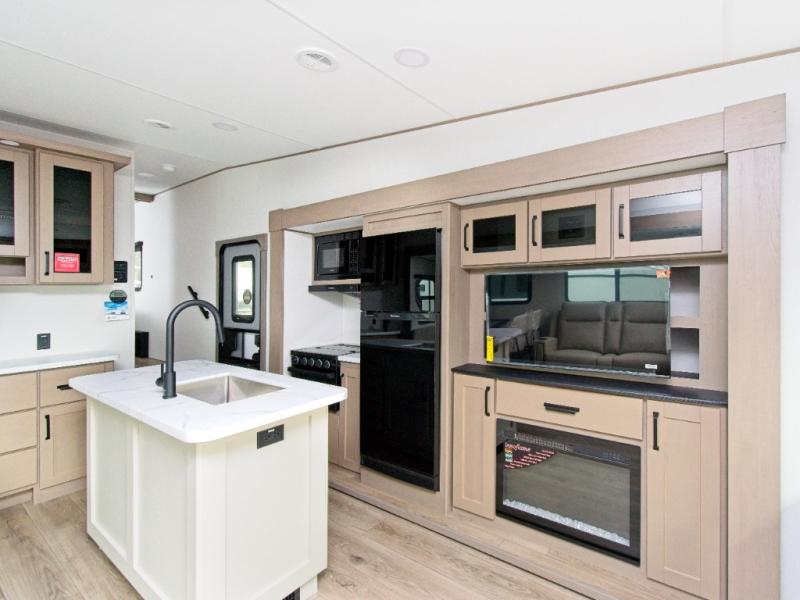 You'll love the amount of space you have in this fifth wheel thanks to the dual opposing slides in the rear living area/kitchen. Your friends and family can relax on the tri-fold sofa or theater seating across from the high-definition 40" LED TV. There is also a booth dinette or you can choose the optional swivel dinette if you prefer that seating. The chef of your group will appreciate having a kitchen island that will provide more counter space, plus there is a hutch with overhead cabinets for nice dishes. A full bath onboard lets you clean up each day and the front private bedroom includes a queen bed just like at home. You'll also love spending time outdoors under the electric awning, and there is an unobstructed pass-thru storage for fishing poles, hiking gear, and camp chairs!