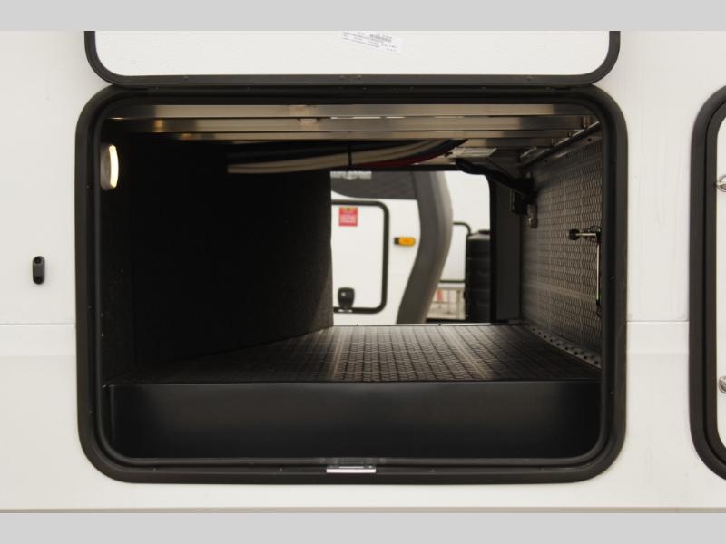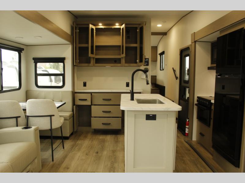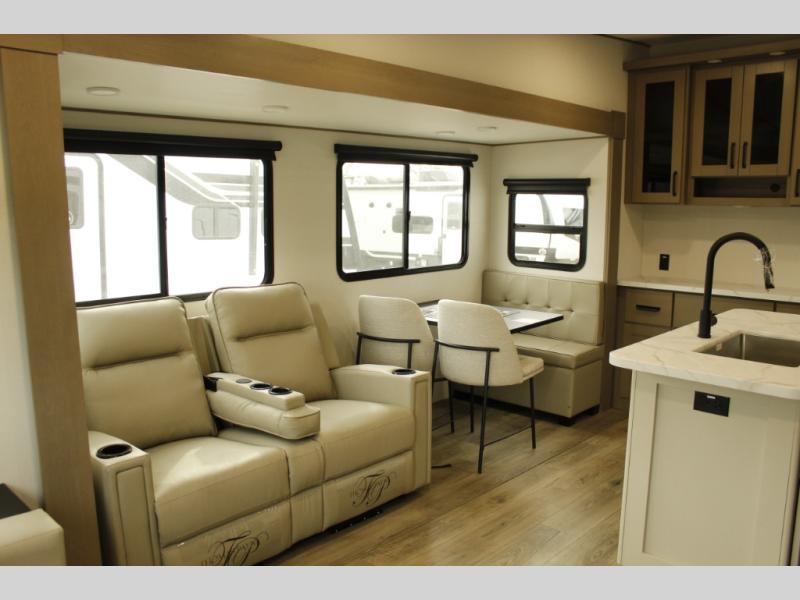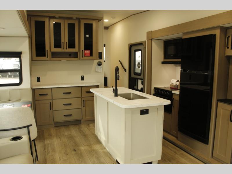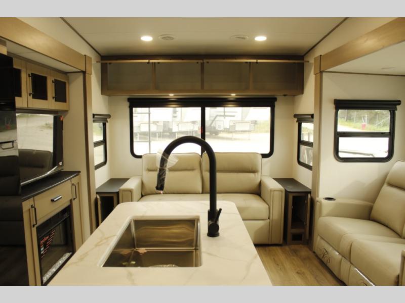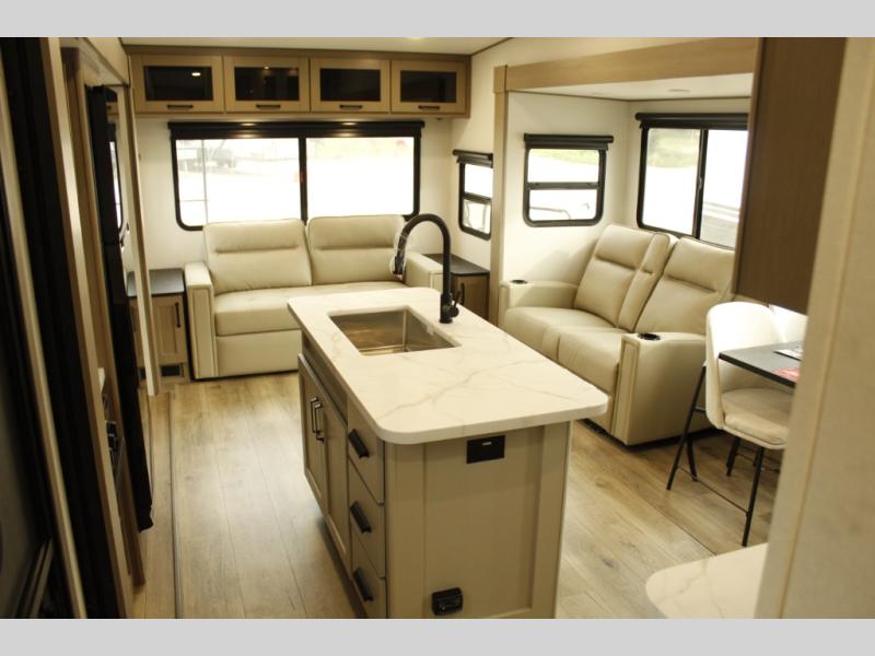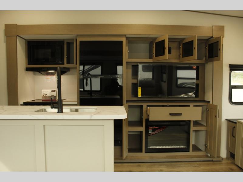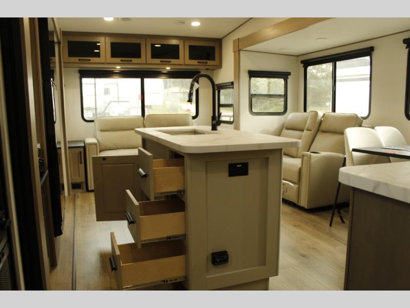 You'll love the amount of space you have in this fifth wheel thanks to the dual opposing slides in the rear living area/kitchen. Your friends and family can relax on the tri-fold sofa or theater seating across from the high-definition 40" LED TV. There is also a booth dinette or you can choose the optional swivel dinette if you prefer that seating. The chef of your group will appreciate having a kitchen island that will provide more counter space, plus there is a hutch with overhead cabinets for nice dishes. A full bath onboard lets you clean up each day and the front private bedroom includes a queen bed just like at home. You'll also love spending time outdoors under the electric awning, and there is an unobstructed pass-thru storage for fishing poles, hiking gear, and camp chairs!