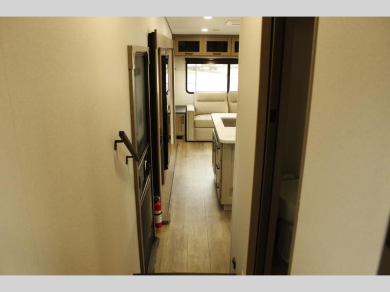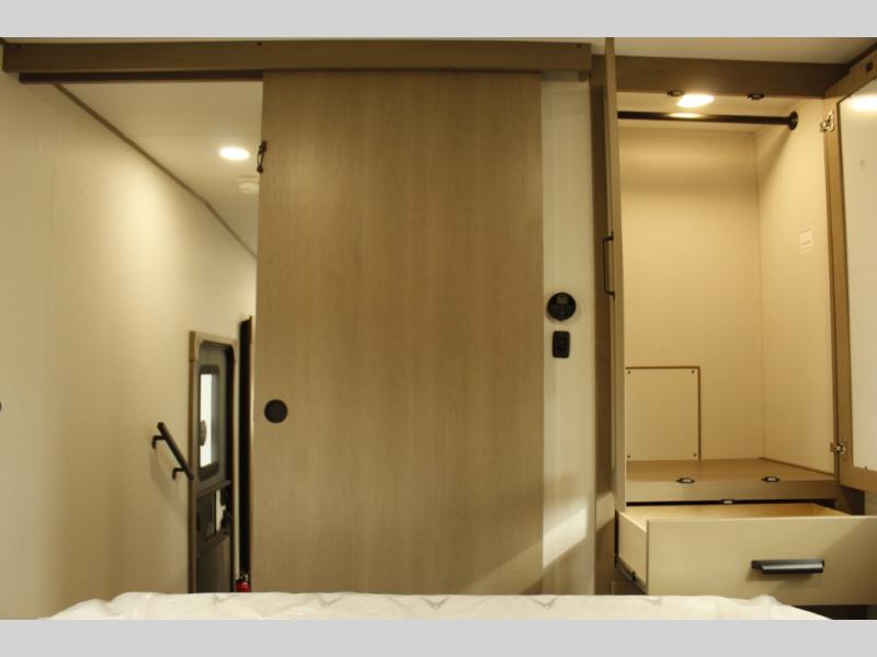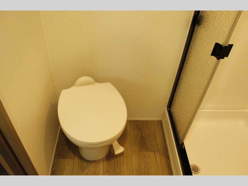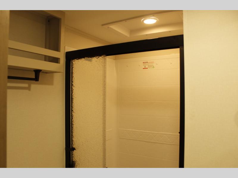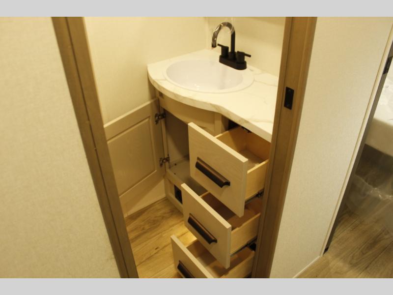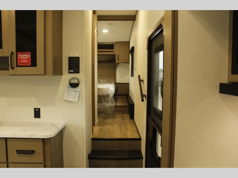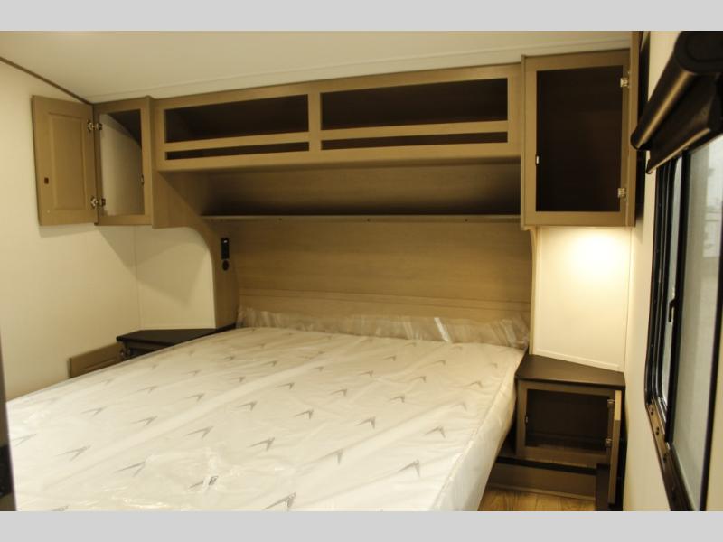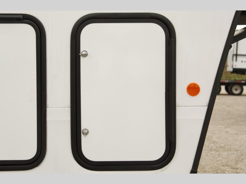 You'll love the amount of space you have in this fifth wheel thanks to the dual opposing slides in the rear living area/kitchen. Your friends and family can relax on the tri-fold sofa or theater seating across from the high-definition 40" LED TV. There is also a booth dinette or you can choose the optional swivel dinette if you prefer that seating. The chef of your group will appreciate having a kitchen island that will provide more counter space, plus there is a hutch with overhead cabinets for nice dishes. A full bath onboard lets you clean up each day and the front private bedroom includes a queen bed just like at home. You'll also love spending time outdoors under the electric awning, and there is an unobstructed pass-thru storage for fishing poles, hiking gear, and camp chairs!