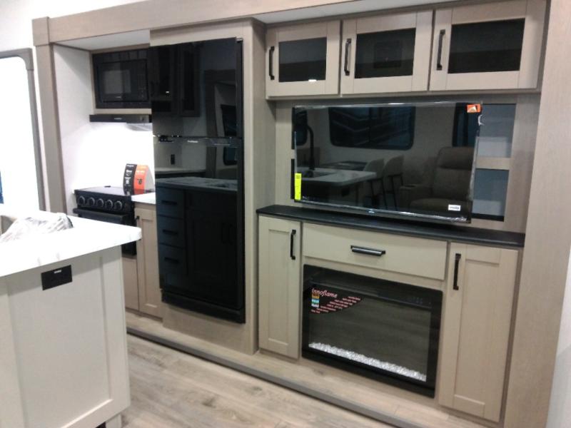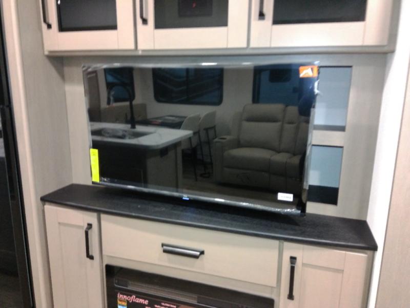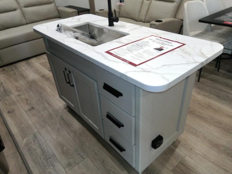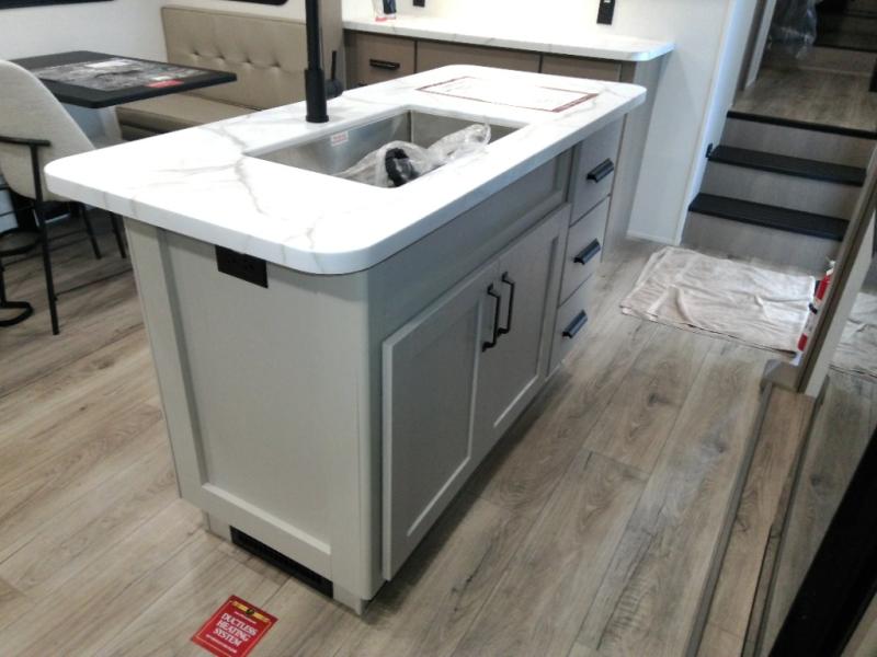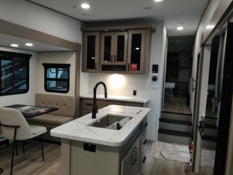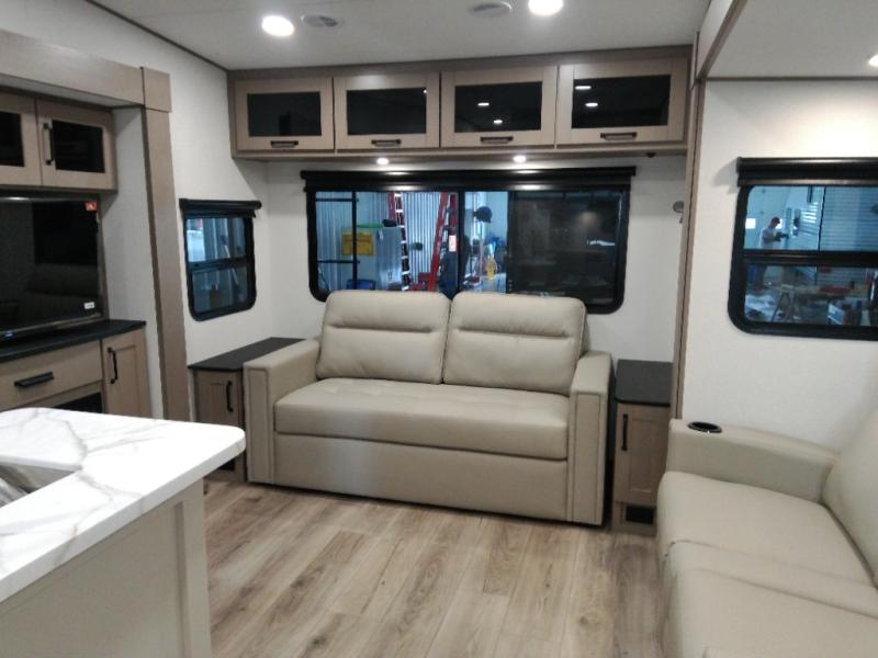 You'll love the amount of space you have in this fifth wheel thanks to the dual opposing slides in the rear living area/kitchen. Your friends and family can relax on the tri-fold sofa or theater seating across from the high-definition 40" LED TV. There is also a booth dinette or you can choose the optional swivel dinette if you prefer that seating. The chef of your group will appreciate having a kitchen island that will provide more counter space, plus there is a hutch with overhead cabinets for nice dishes. A full bath onboard lets you clean up each day and the front private bedroom includes a queen bed just like at home. You'll also love spending time outdoors under the electric awning, and there is an unobstructed pass-thru storage for fishing poles, hiking gear, and camp chairs!