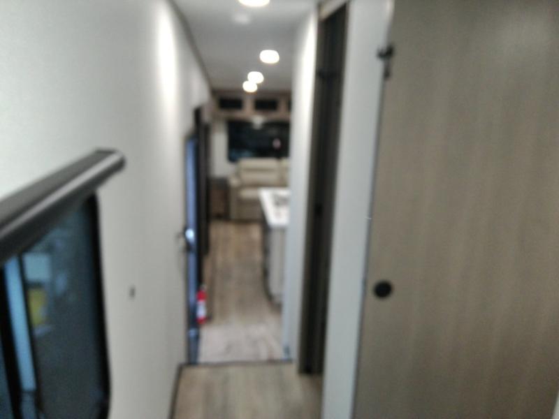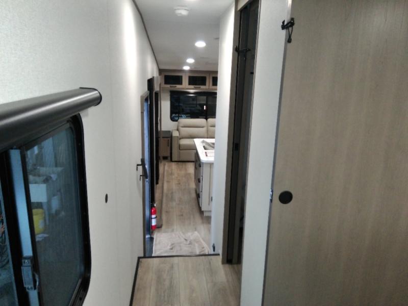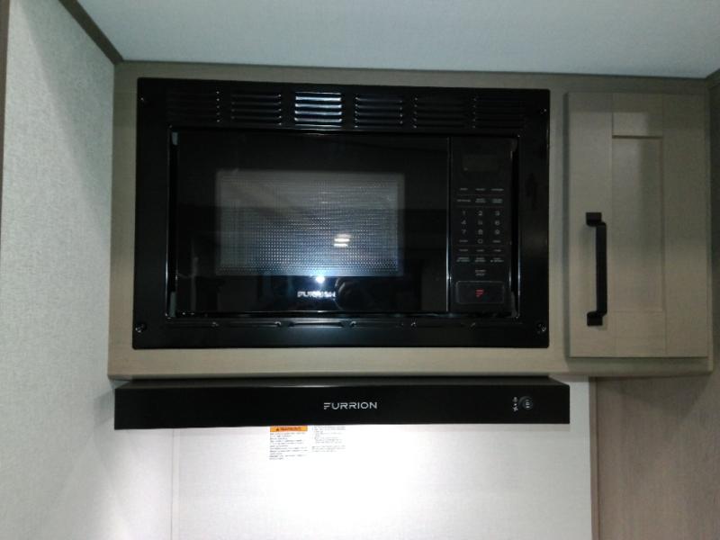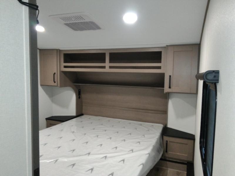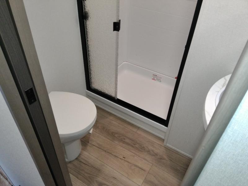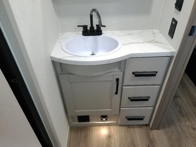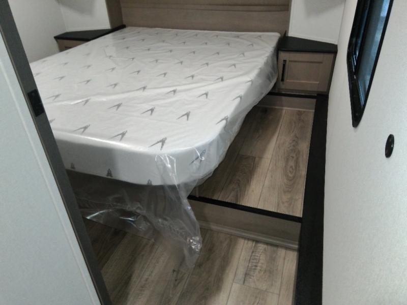 You'll love the amount of space you have in this fifth wheel thanks to the dual opposing slides in the rear living area/kitchen. Your friends and family can relax on the tri-fold sofa or theater seating across from the high-definition 40" LED TV. There is also a booth dinette or you can choose the optional swivel dinette if you prefer that seating. The chef of your group will appreciate having a kitchen island that will provide more counter space, plus there is a hutch with overhead cabinets for nice dishes. A full bath onboard lets you clean up each day and the front private bedroom includes a queen bed just like at home. You'll also love spending time outdoors under the electric awning, and there is an unobstructed pass-thru storage for fishing poles, hiking gear, and camp chairs!