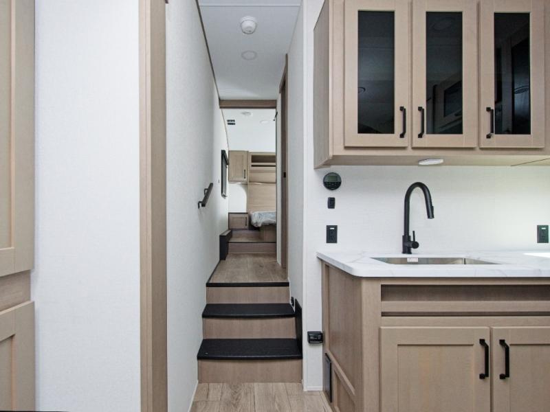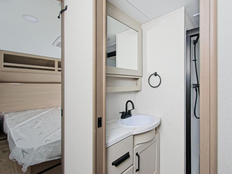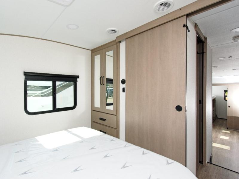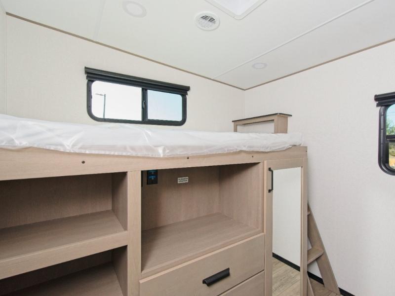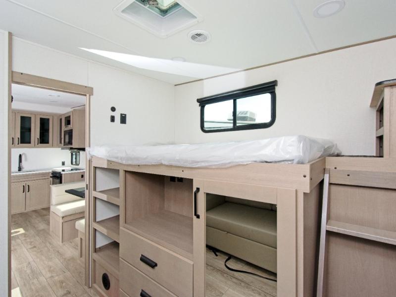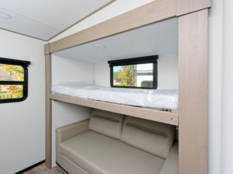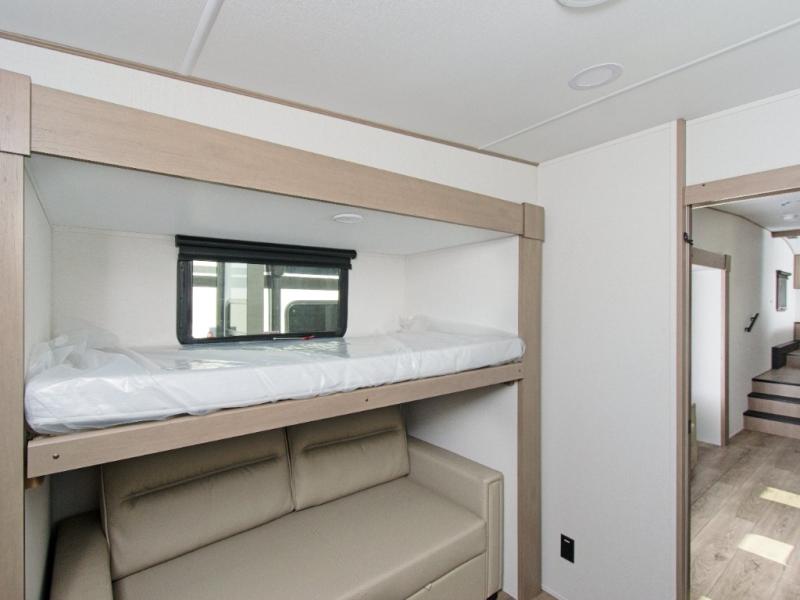 The Reflection 32BH is built for families and adventurers who crave comfort and flexibility. The rear bunkhouse features a 36” flip-top bunk, a cozy trundle bed, and a 44” bunk with a window—perfect for kids, guests, or extra storage. The private front bedroom includes a plush queen bed, offering a peaceful retreat after a day of exploring.