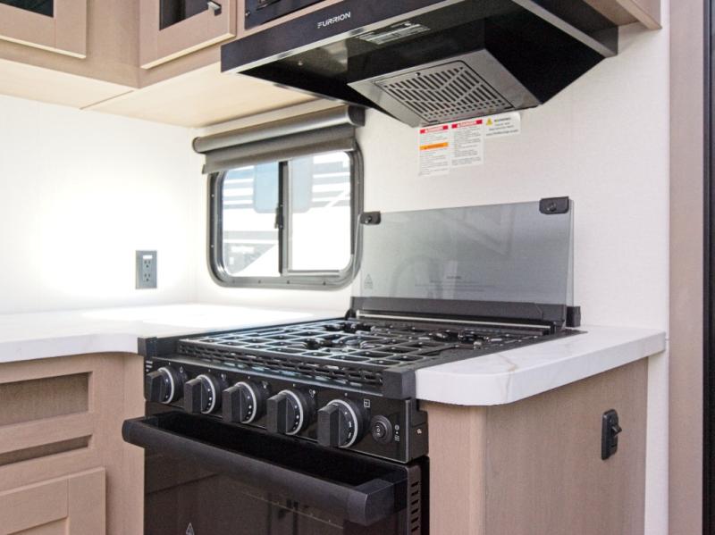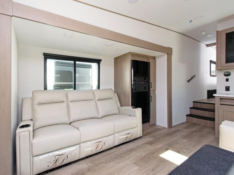 In the heart of the RV, the living area invites relaxation with theater seating, a 40” LED TV, and a warm dining space ideal for meals and conversation. The fully equipped kitchen includes a 10 cu. ft. refrigerator, pantry, microwave, and a three-burner cooktop—everything you need to prepare delicious meals on the go.