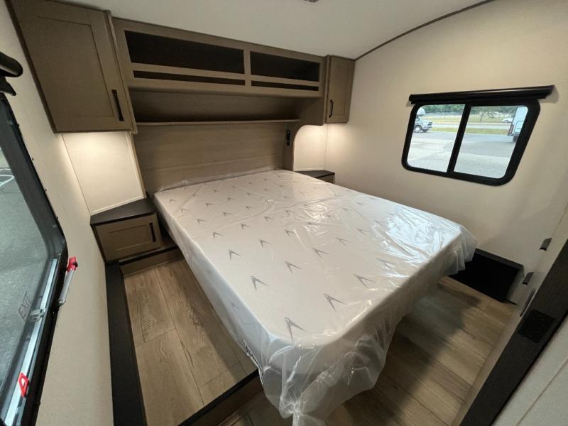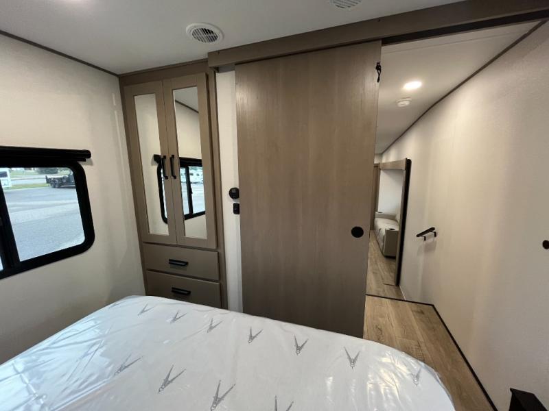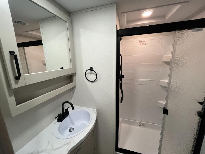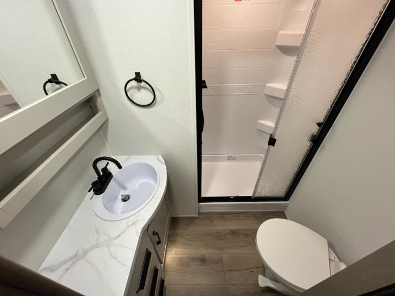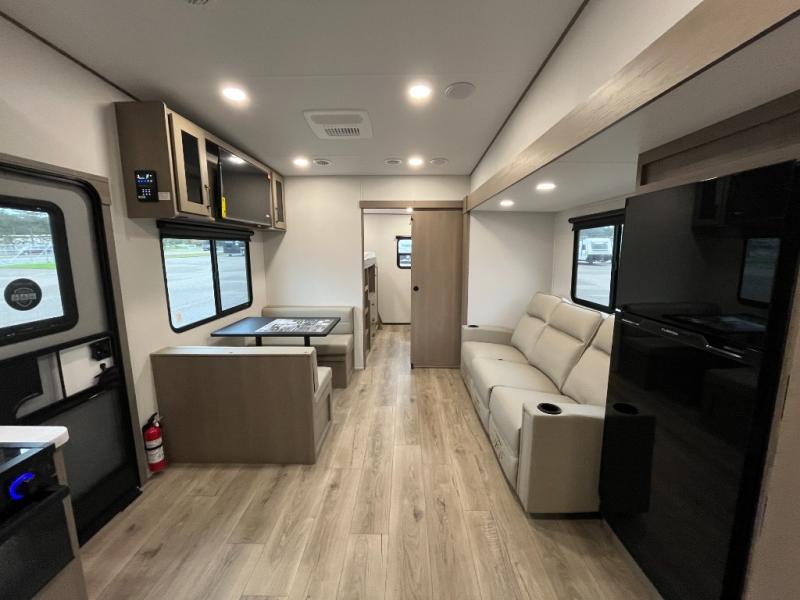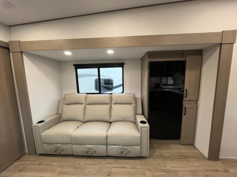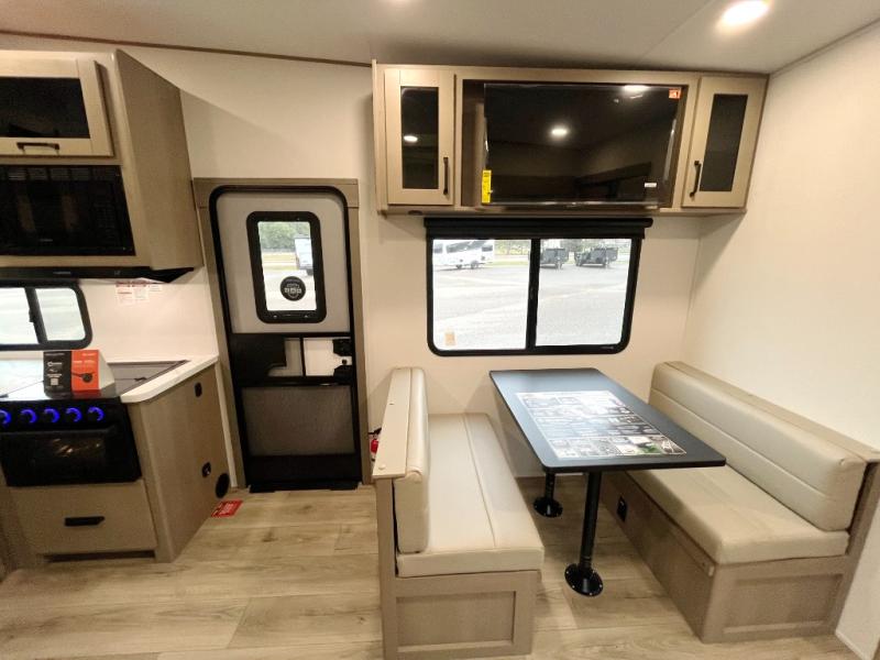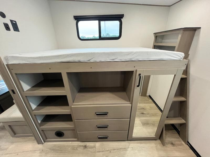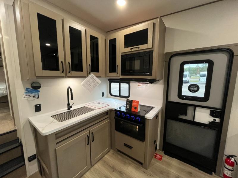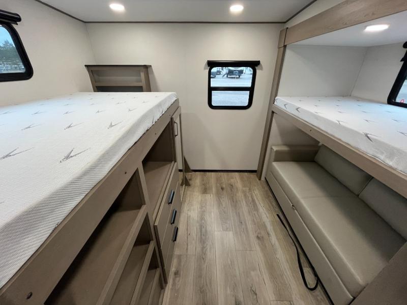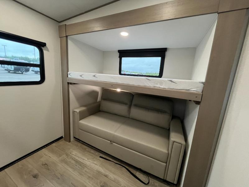You will love this fifth wheel’s multiple sleeping spaces, such as the 36” flip top bunk offers flexible sleeping options for added capacity and comfort. A trundle bed provides an additional cozy sleeping space, ideal for guests or family members, and the 44” bunk bed with window features a comfortable sleeping area with natural light, ideal for kids or relaxation. Plus, the front bedroom boasts a queen bed, creating a peaceful retreat for rest and rejuvenation. In the living area, you will find a space that creates a warm and intimate spot for meals and conversation. The 40” TV delivers entertainment for relaxation and enjoyment, a theater seating provides immersive comfort for an exceptional viewing experience, and the well-appointed kitchen features a 10 cu ft refrigerator that ensures ample storage for fresh ingredients and beverages, a pantry, microwave, and a three-burner cooktop allows for versatile meal preparation. Finally, the full bathroom will complete the at-home experience, adding convenience to this model.