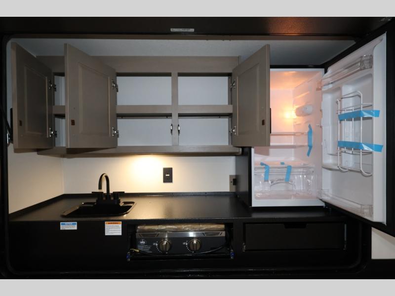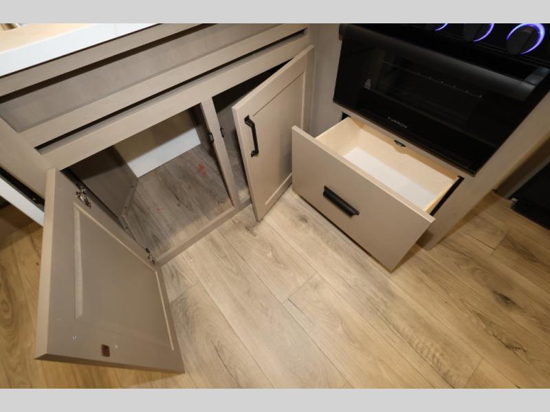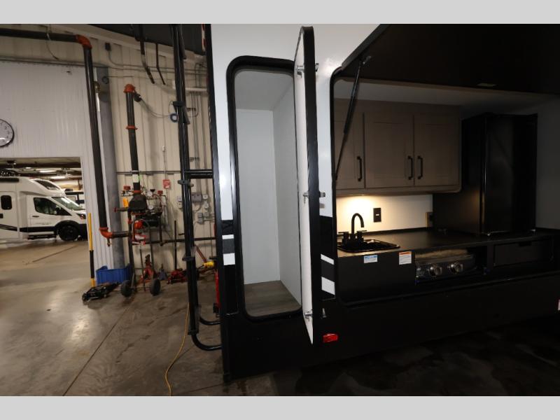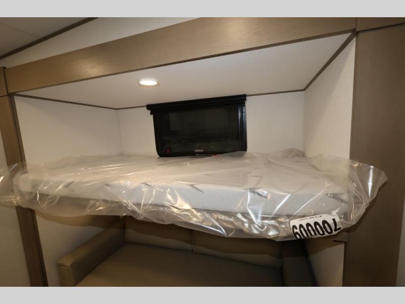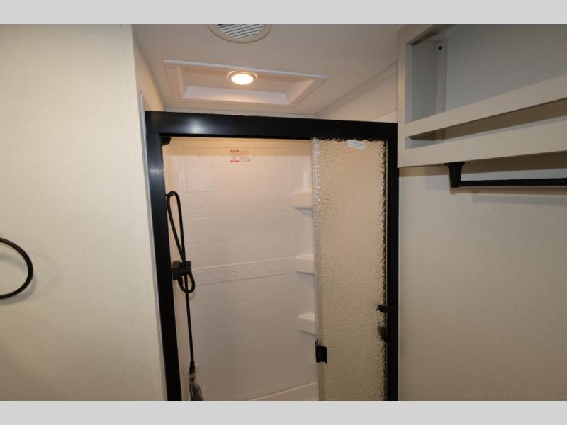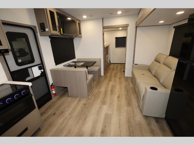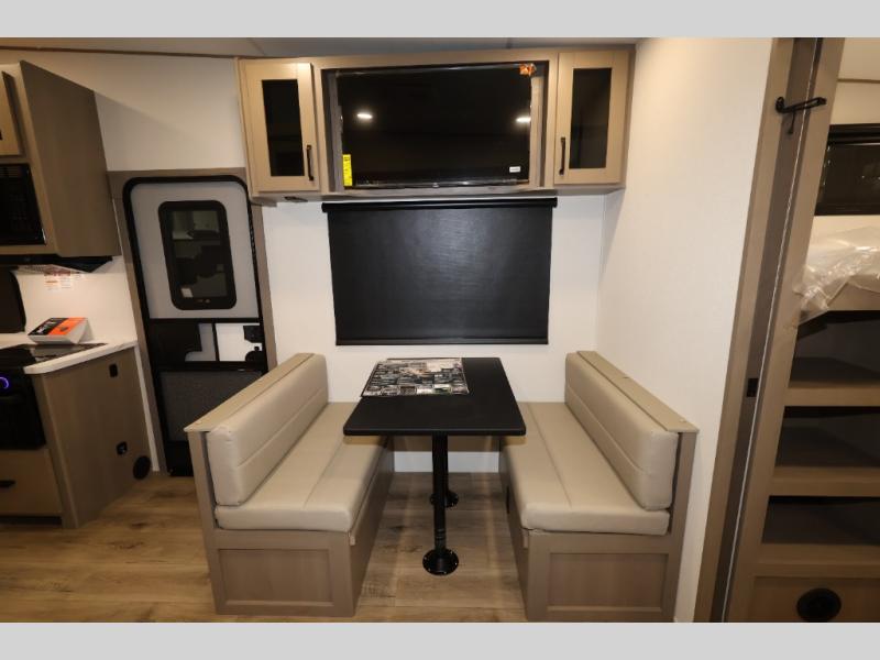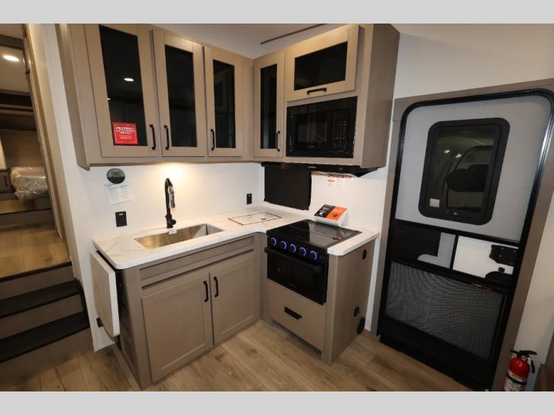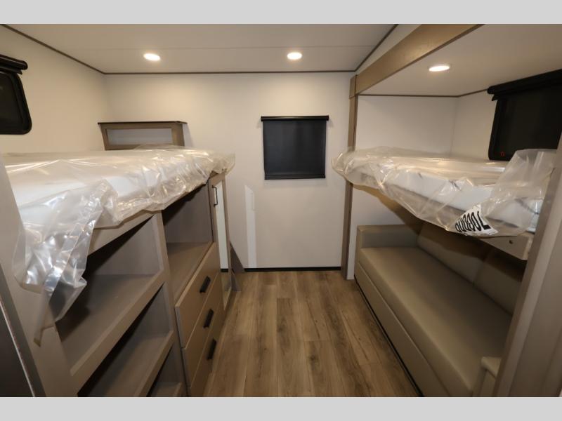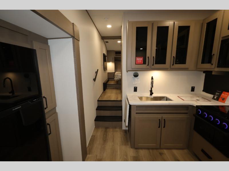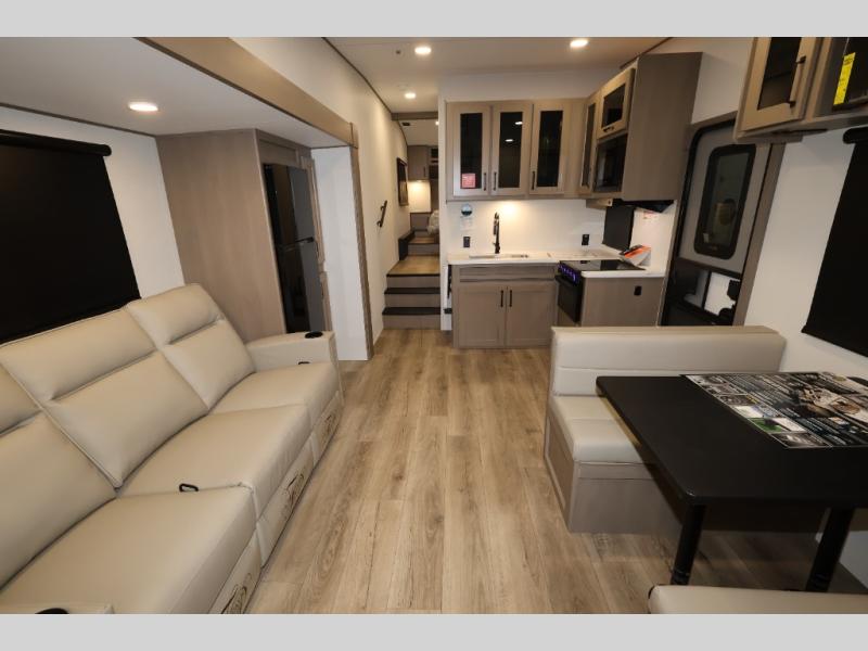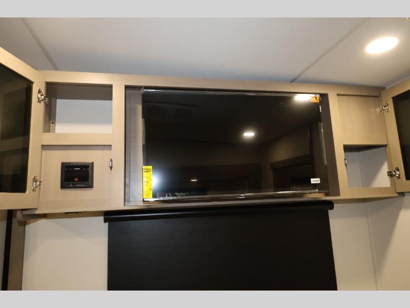 You will love this fifth wheel’s multiple sleeping spaces, such as the 36” flip top bunk offers flexible sleeping options for added capacity and comfort. A trundle bed provides an additional cozy sleeping space, ideal for guests or family members, and the 44” bunk bed with window features a comfortable sleeping area with natural light, ideal for kids or relaxation. Plus, the front bedroom boasts a queen bed, creating a peaceful retreat for rest and rejuvenation. In the living area, you will find a space that creates a warm and intimate spot for meals and conversation. The 40” TV delivers entertainment for relaxation and enjoyment, a theater seating provides immersive comfort for an exceptional viewing experience, and the well-appointed kitchen features a 10 cu ft refrigerator that ensures ample storage for fresh ingredients and beverages, a pantry, microwave, and a three-burner cooktop allows for versatile meal preparation. Finally, the full bathroom will complete the at-home experience, adding convenience to this model.