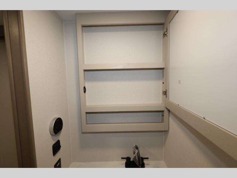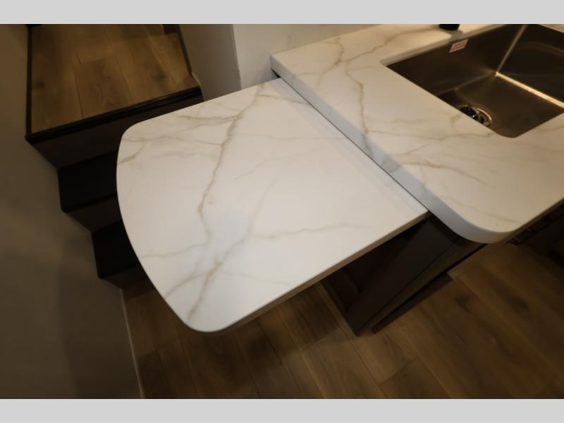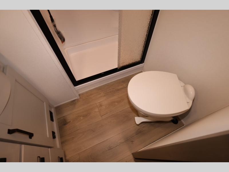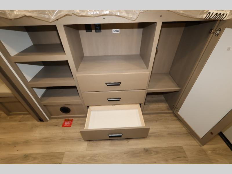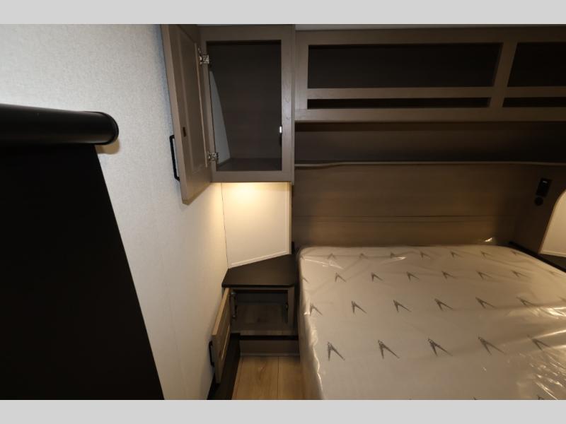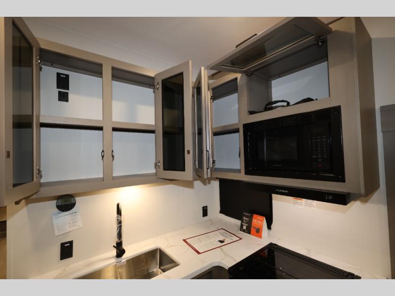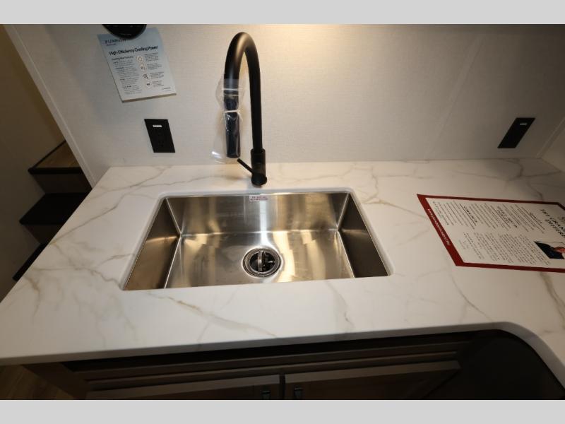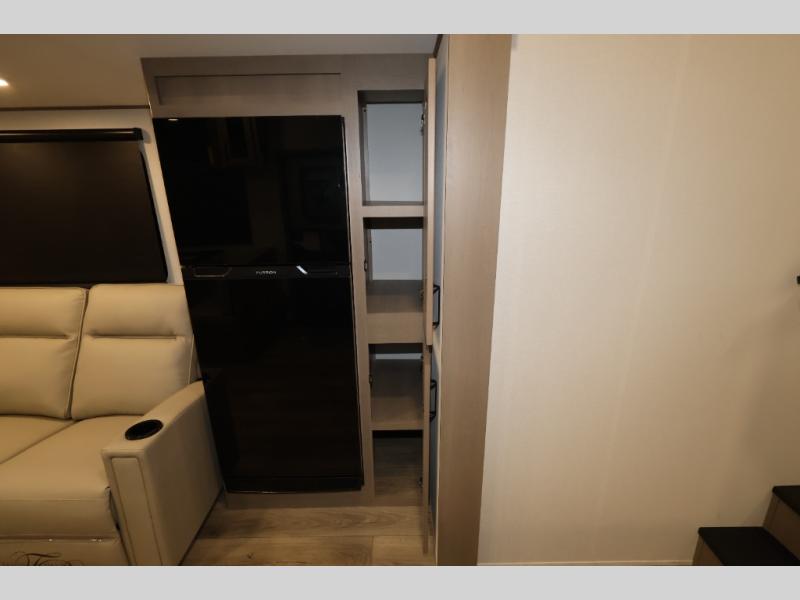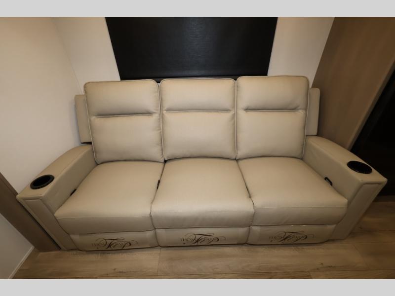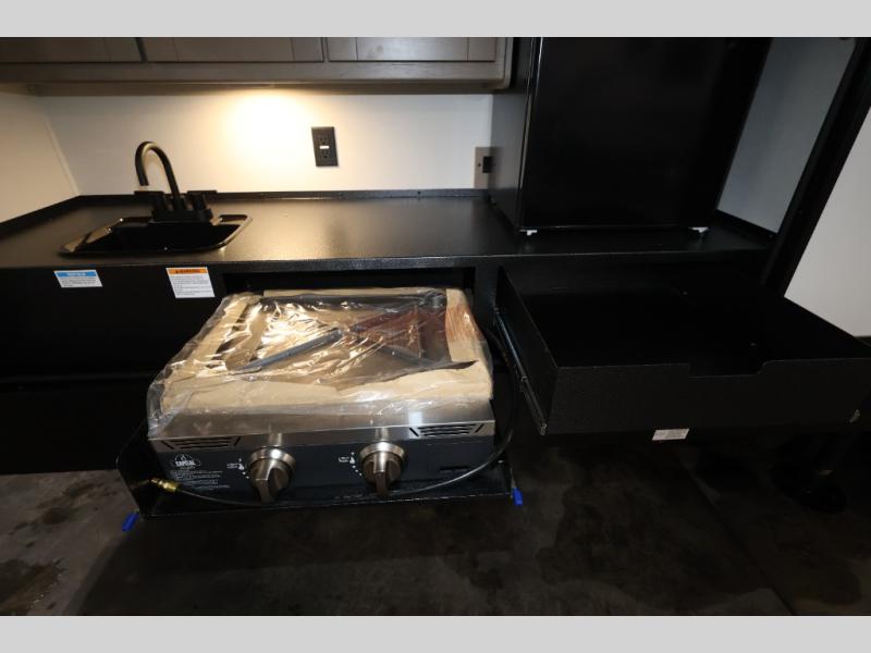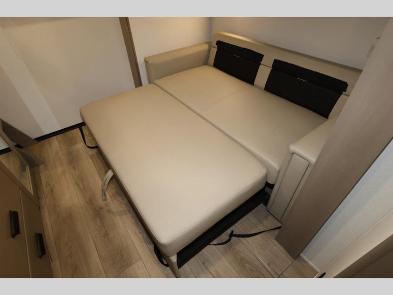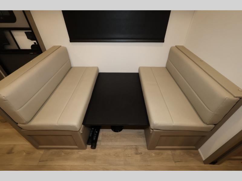 You will love this fifth wheel’s multiple sleeping spaces, such as the 36” flip top bunk offers flexible sleeping options for added capacity and comfort. A trundle bed provides an additional cozy sleeping space, ideal for guests or family members, and the 44” bunk bed with window features a comfortable sleeping area with natural light, ideal for kids or relaxation. Plus, the front bedroom boasts a queen bed, creating a peaceful retreat for rest and rejuvenation. In the living area, you will find a space that creates a warm and intimate spot for meals and conversation. The 40” TV delivers entertainment for relaxation and enjoyment, a theater seating provides immersive comfort for an exceptional viewing experience, and the well-appointed kitchen features a 10 cu ft refrigerator that ensures ample storage for fresh ingredients and beverages, a pantry, microwave, and a three-burner cooktop allows for versatile meal preparation. Finally, the full bathroom will complete the at-home experience, adding convenience to this model.