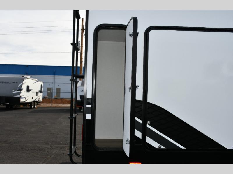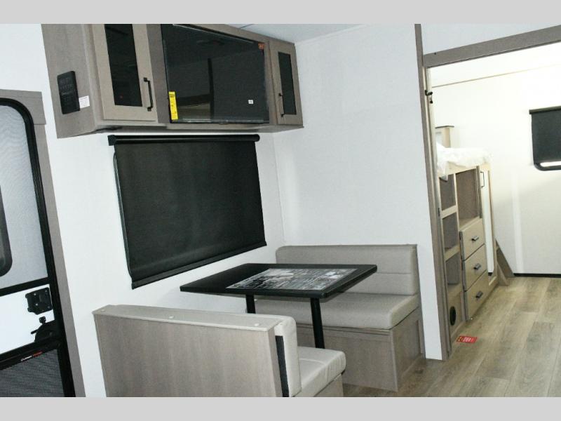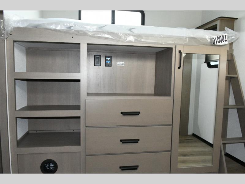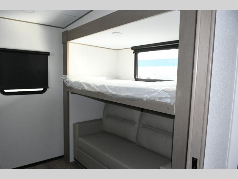 • Rear bunkhouse with versatile sleeping options, including a 36" flip-top bunk, trundle bed, and a 44" bunk with window for natural light