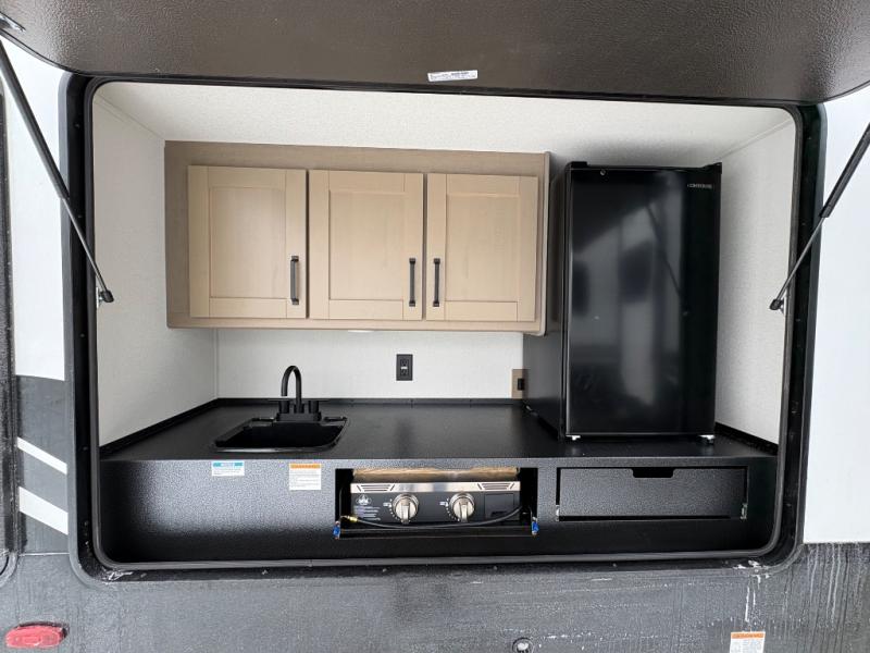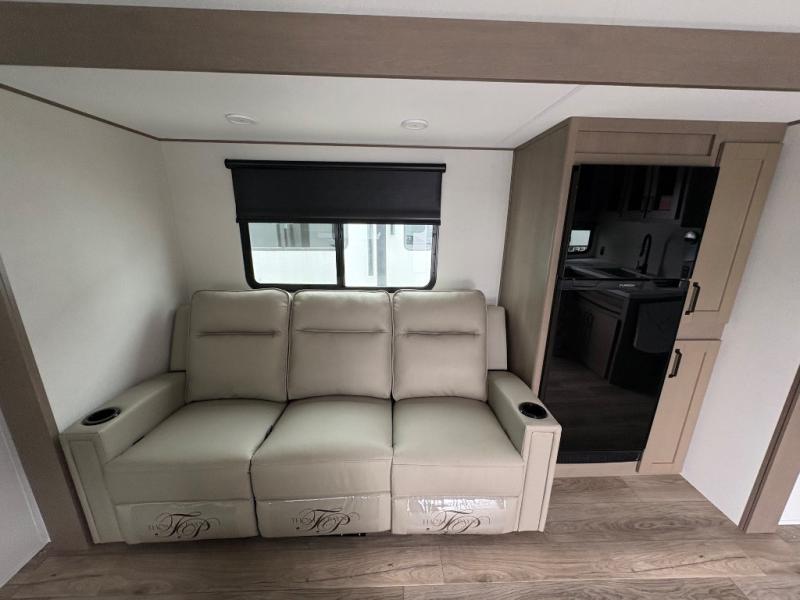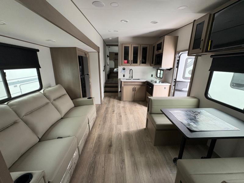You will love this fifth wheel’s multiple sleeping spaces, such as the 36” flip top bunk offers flexible sleeping options for added capacity and comfort. A trundle bed provides an additional cozy sleeping space, ideal for guests or family members, and the 44” bunk bed with window features a comfortable sleeping area with natural light, ideal for kids or relaxation. Plus, the front bedroom boasts a queen bed, creating a peaceful retreat for rest and rejuvenation. In the living area, you will find a space that creates a warm and intimate spot for meals and conversation. The 40” TV delivers entertainment for relaxation and enjoyment, a theater seating provides immersive comfort for an exceptional viewing experience, and the well-appointed kitchen features a 10 cu ft refrigerator that ensures ample storage for fresh ingredients and beverages, a pantry, microwave, and a three-burner cooktop allows for versatile meal preparation. Finally, the full bathroom will complete the at-home experience, adding convenience to this model.