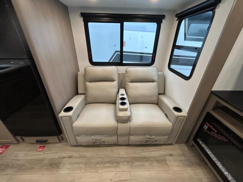 At the front of this fifth wheel, a private bedroom offers a walk-around 60" x 80" queen bed for restful comfort, complemented by dual wardrobes for convenient clothing storage. Down the hall, the full bathroom includes a 30" x 36" residential walk-in shower, a large, mirrored medicine cabinet, and linen storage for towels and toiletries. The middle living area features a cozy fireplace and booth dinette with a TV above perfect for dining while enjoying your favorite shows. Opposite, a slide-out holds the 62" theater seating for relaxing after a day of adventure, alongside a 10-cu. ft. refrigerator and pantry for all your groceries and dry goods. At the rear, an L-shaped kitchen provides generous counter space, a deep-seated stainless-steel sink, and a 30" microwave, allowing you to prepare meals comfortably without relying on campground facilities.
