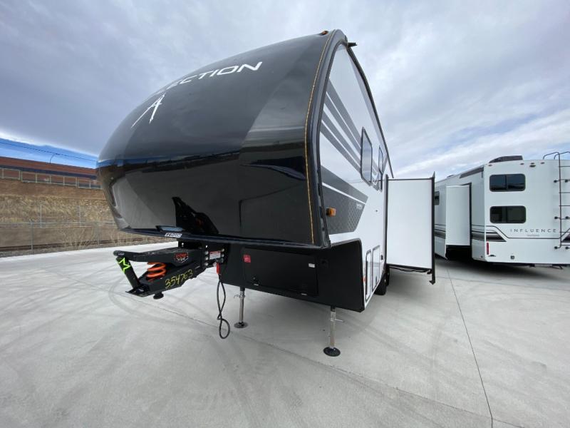 With any Reflection 150 Series fifth wheel by Grand Design, there is more available payload capacity and a broader range of half-ton trucks capable of towing this fifth wheel, and no slider hitch is needed thanks to the 90-degree turning radius which makes them short bed friendly and easier to tow. The mandatory Ultimate Power package provides a "One-Touch" automatic leveling system and a detachable power cord with LED light for easy setup, plus motion sensor pass-through lighting and entry lighting, and the Tire Linc TPMS will help you stay safe on the road. The interior offers residential luxury from the cabinetry and premium Congoleum flooring, to the booth dinette and residential-style window treatment. Make your refined decision today!