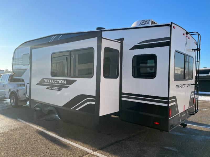 Feel right at home in this Reflection 150 Series with a private bedroom that includes a walk-around queen bed with storage on each side, windows, and a space savings sliding door. The full bathroom offers a walk-in shower, storage for your linens and a sliding door for easy access. When you get hungry, the cook will have an L-shaped kitchen area to make meals, plus full amenities including a 30" microwave, a flip-up counter extension, a pantry for your dry goods and a 16 cu. ft. refrigerator to store lots of food and cold beverages. You can dine at the rear U-shaped dinette lounge and enjoy the view out of all the windows or outside under the 18' electric awning. And the 78" theatre seating will be a nice place to relax and watch the 40" LED HDTV.