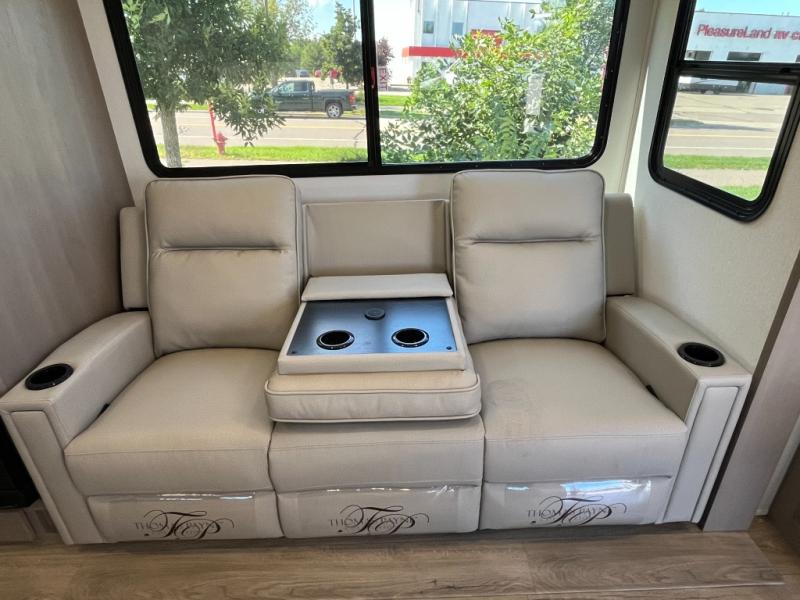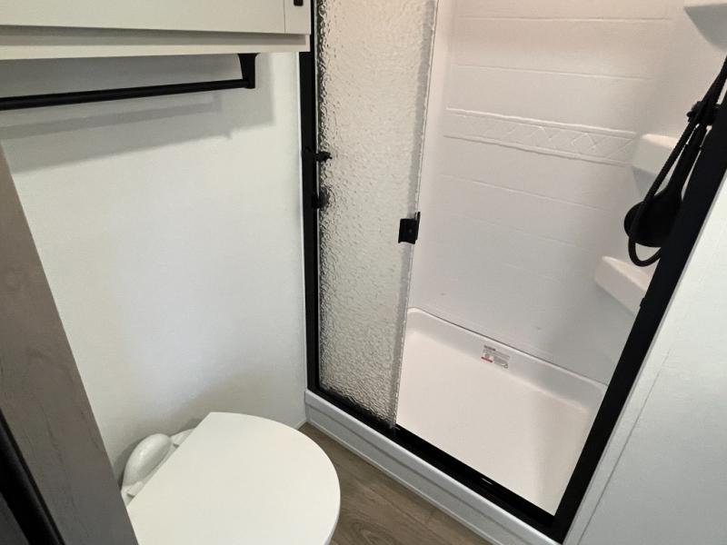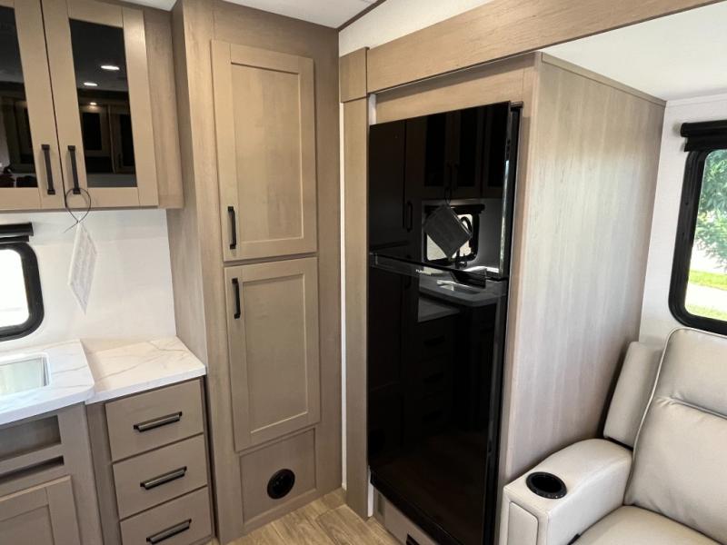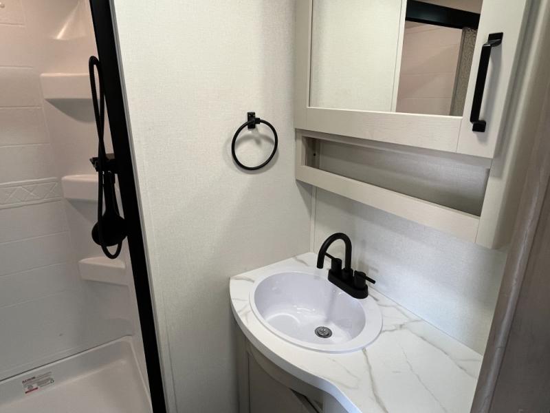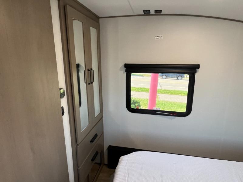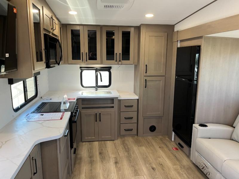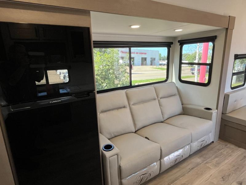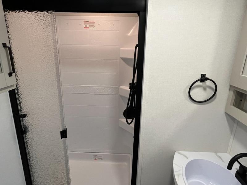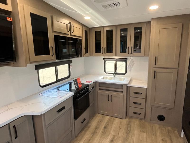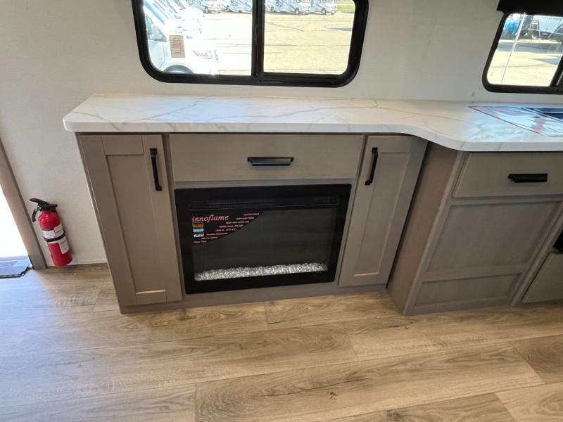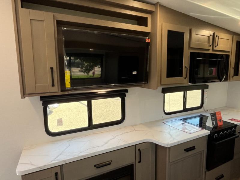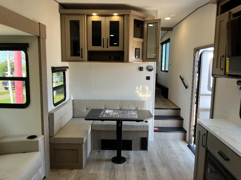 You will love this fifth wheel featuring a single slide for added interior living space and all the comforts and conveniences it provides you while you travel. The slide features a 78" theater seat plus there is a breakfast nook for more seating. Both can easily view the entertainment center with 40" TV. A rear kitchen indoors provides everything you need to create meals like home while on the road, and if you want to spend as much time outside as possible, then the outdoor griddle will certainly accommodate you for meals. Up front, a cozy private bedroom with queen bed, wardrobe, and overhead cabinets. Right next door, you will find a large walk-in shower, as well as a toilet, and a vanity with sink and linen cabinet for your towels and toiletries. You will also love the full unobstructed pass-through compartment for all of your gear, plus so much more!