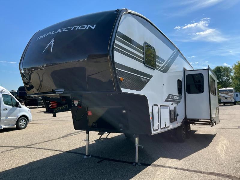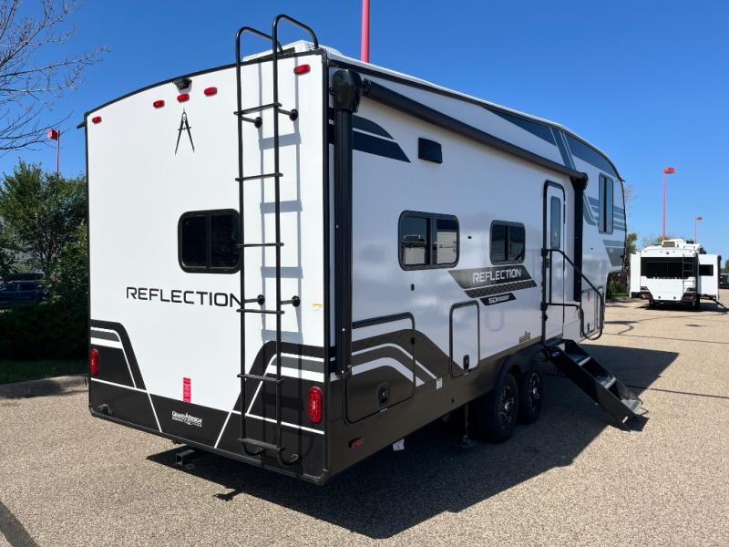With any Reflection 150 Series fifth wheel by Grand Design, there is more available payload capacity and a broader range of half-ton trucks capable of towing this fifth wheel, and no slider hitch is needed thanks to the 90-degree turning radius which makes them short bed friendly and easier to tow. The mandatory Ultimate Power package provides a "One-Touch" automatic leveling system and a detachable power cord with LED light for easy setup, plus motion sensor pass-through lighting and entry lighting, and the Tire Linc TPMS will help you stay safe on the road. The interior offers residential luxury from the cabinetry and premium Congoleum flooring, to the booth dinette and residential-style window treatment. Make your refined decision today!