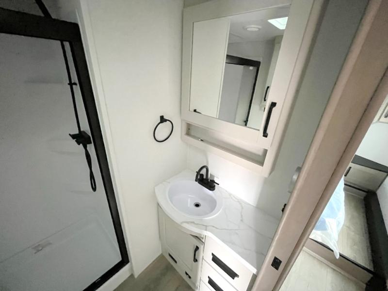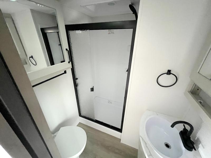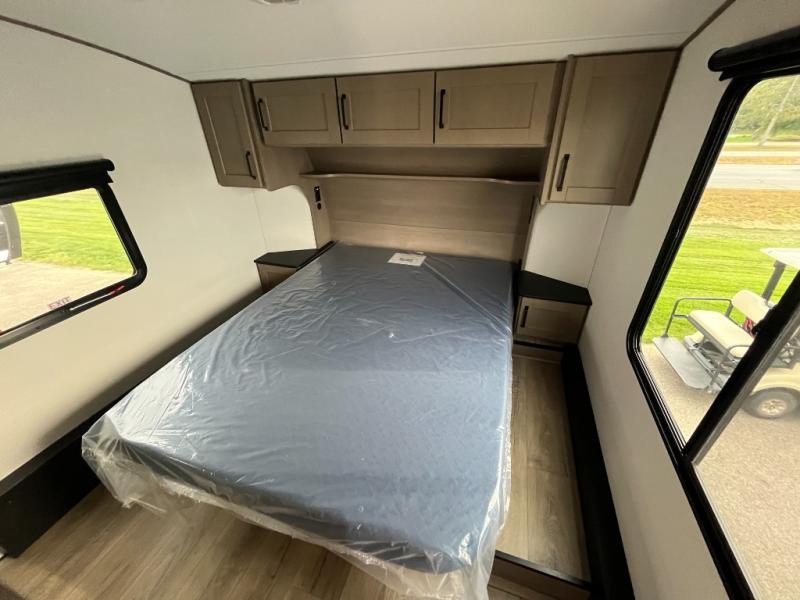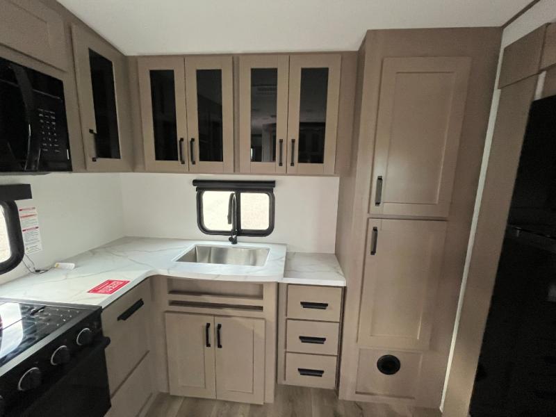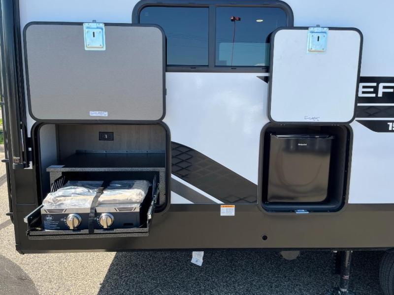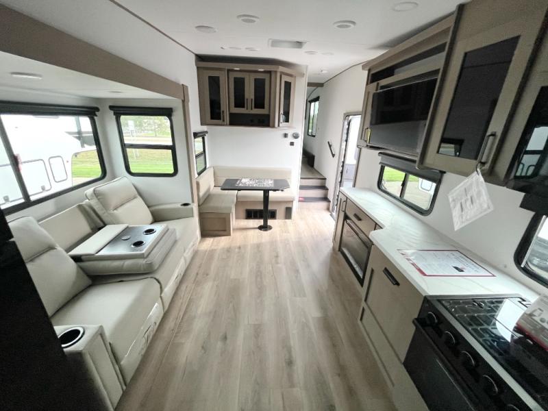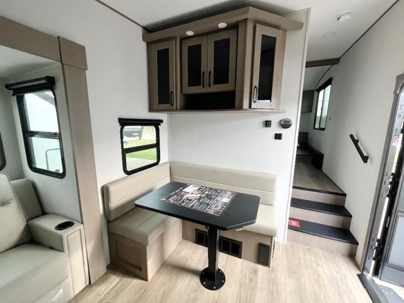 You will love this fifth wheel featuring a single slide for added interior living space and all the comforts and conveniences it provides you while you travel. The slide features a 78" theater seat plus there is a breakfast nook for more seating. Both can easily view the entertainment center with 40" TV. A rear kitchen indoors provides everything you need to create meals like home while on the road, and if you want to spend as much time outside as possible, then the outdoor griddle will certainly accommodate you for meals. Up front, a cozy private bedroom with queen bed, wardrobe, and overhead cabinets. Right next door, you will find a large walk-in shower, as well as a toilet, and a vanity with sink and linen cabinet for your towels and toiletries. You will also love the full unobstructed pass-through compartment for all of your gear, plus so much more!