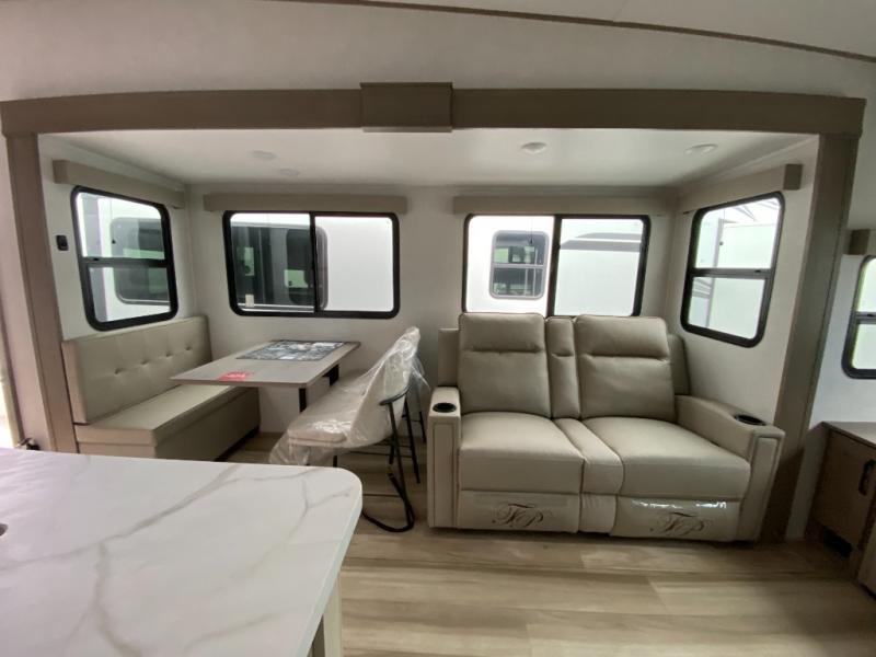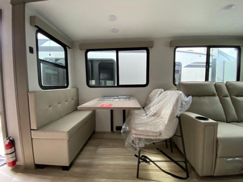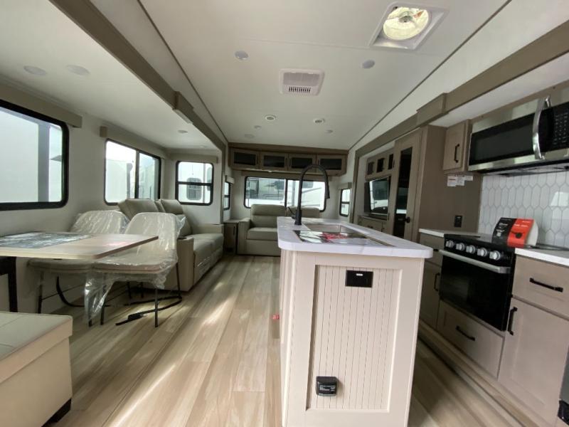 Get ready to enjoy everything the campgrounds and surrounding area has to offer when you are setup to camp in this fifth wheel! The two electric awnings offer protected areas creating outdoor living spaces; just grab your camping chairs from the unobstructed pass-through storage. And the interior offers a spacious living area and kitchen combination with dual opposing slides for maximum space. You can sit on the tri-fold sofa or the booth dinette with an option for a swivel dinette. The hutch and kitchen island offer counter space to prepare and serve meals, and there is a large pantry for goodies. The 40" LED HDTV with a fireplace below provides entertainment before bedtime or on a rainy day. And the front bedroom offers privacy, a walk-around queen bed, and plenty of storage!