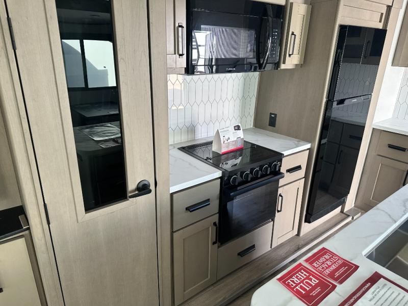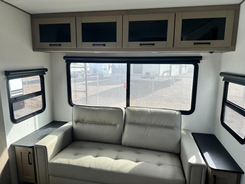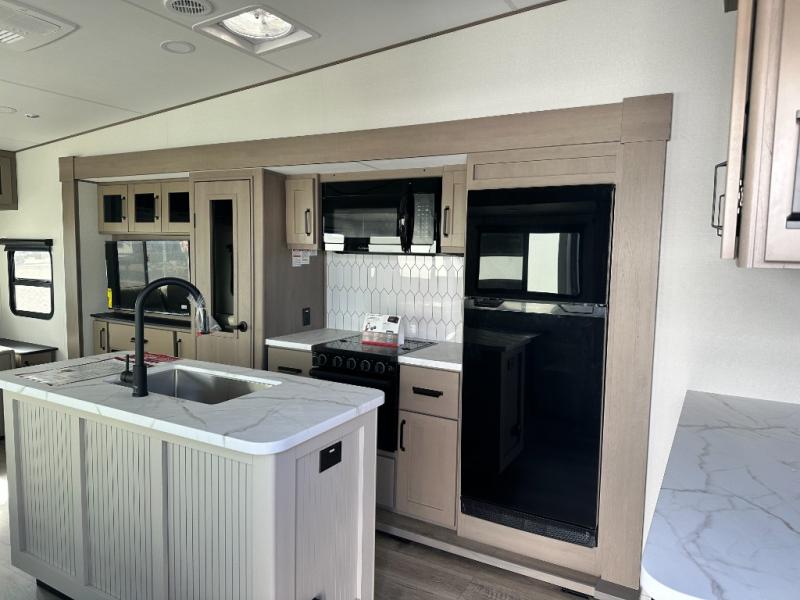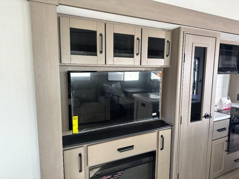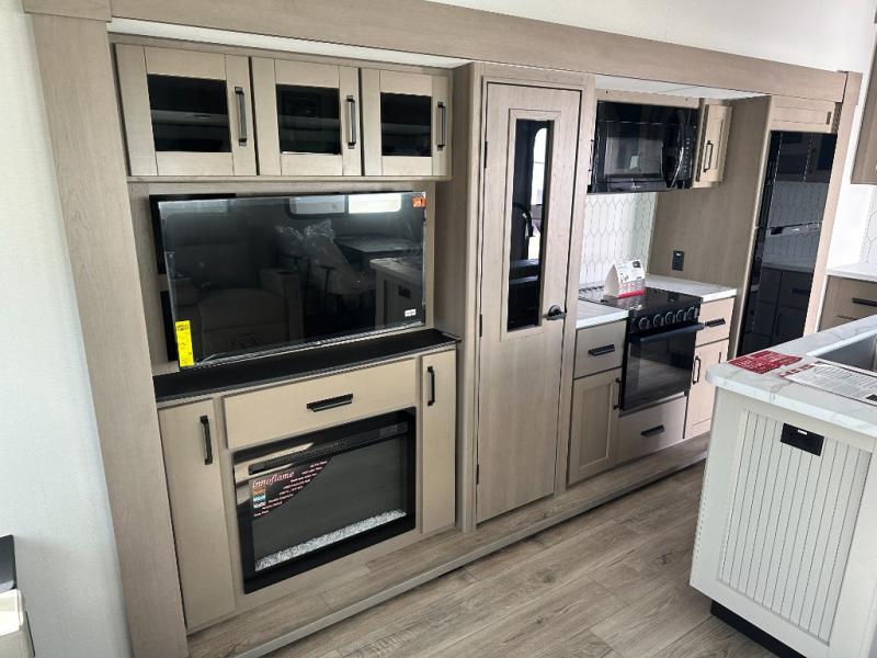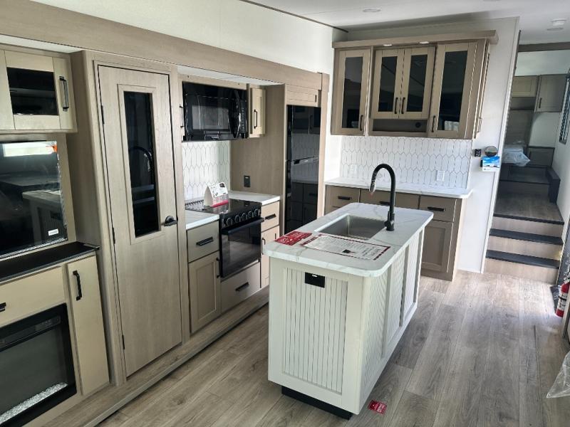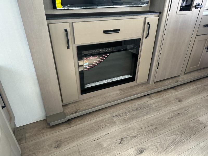 Get ready to enjoy everything the campgrounds and surrounding area has to offer when you are setup to camp in this fifth wheel! The two electric awnings offer protected areas creating outdoor living spaces; just grab your camping chairs from the unobstructed pass-through storage. And the interior offers a spacious living area and kitchen combination with dual opposing slides for maximum space. You can sit on the tri-fold sofa or the dinette to lounge back and rest after a day of adventure. The hutch and kitchen island offer counter space to prepare and serve meals, and there is a large pantry for goodies. The 40" LED HDTV with a fireplace below provides entertainment before bedtime or on a rainy day. And the front bedroom offers privacy, a walk-around queen bed, and plenty of storage!