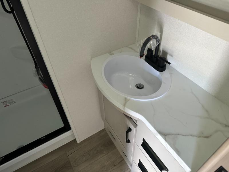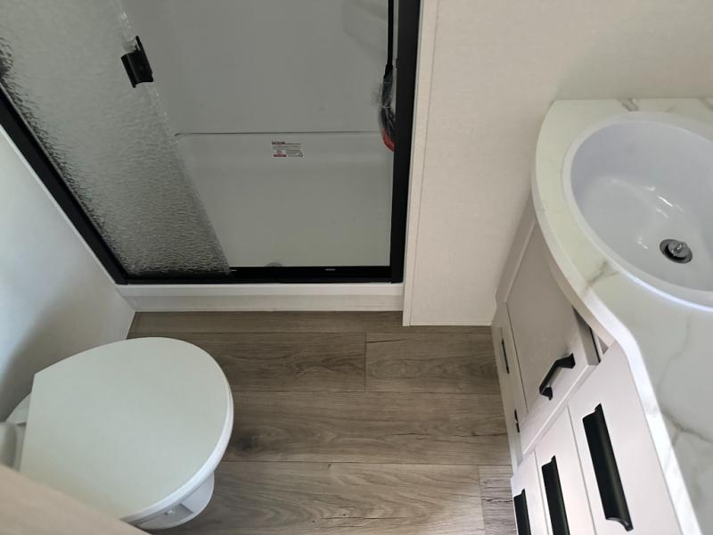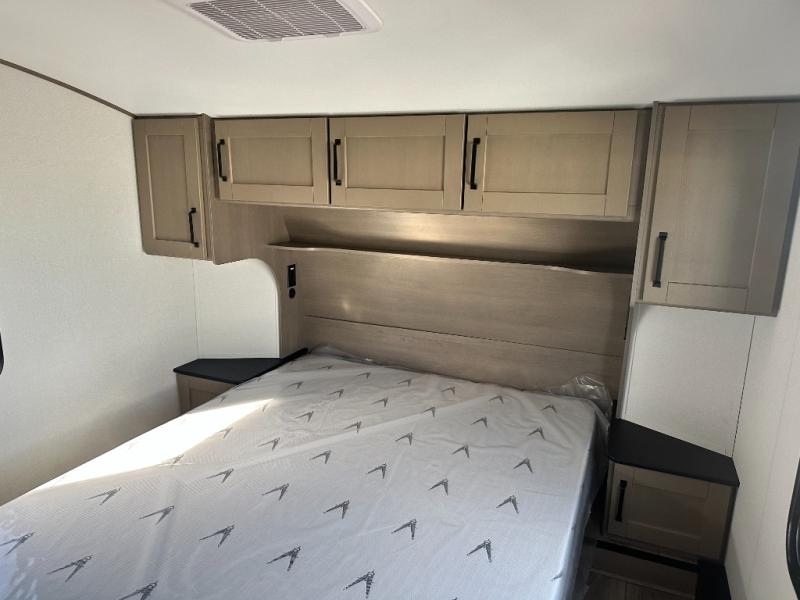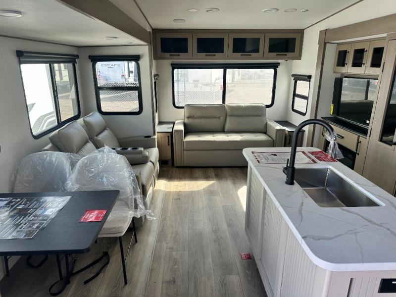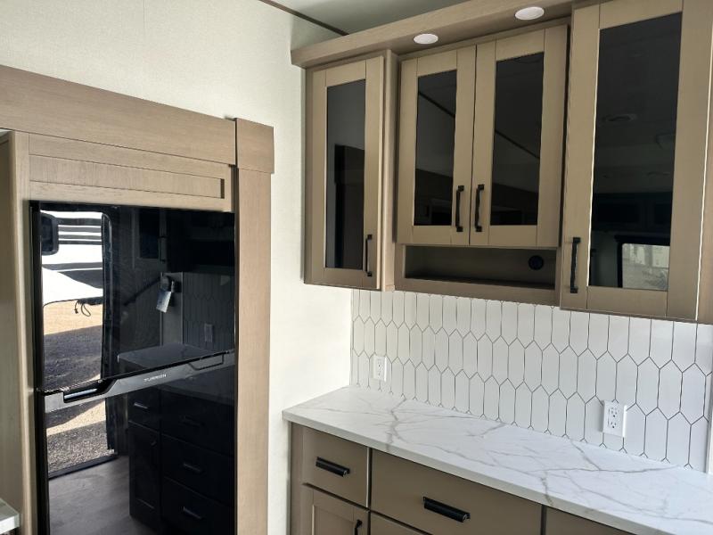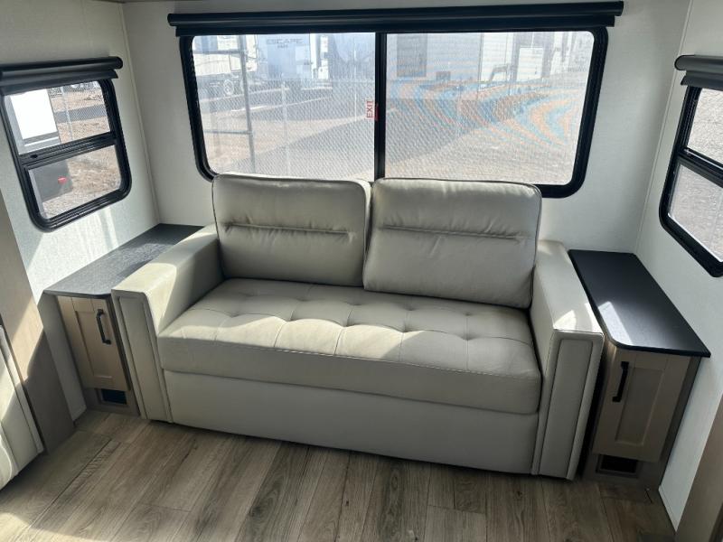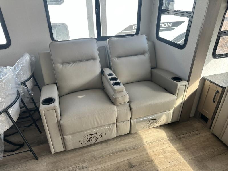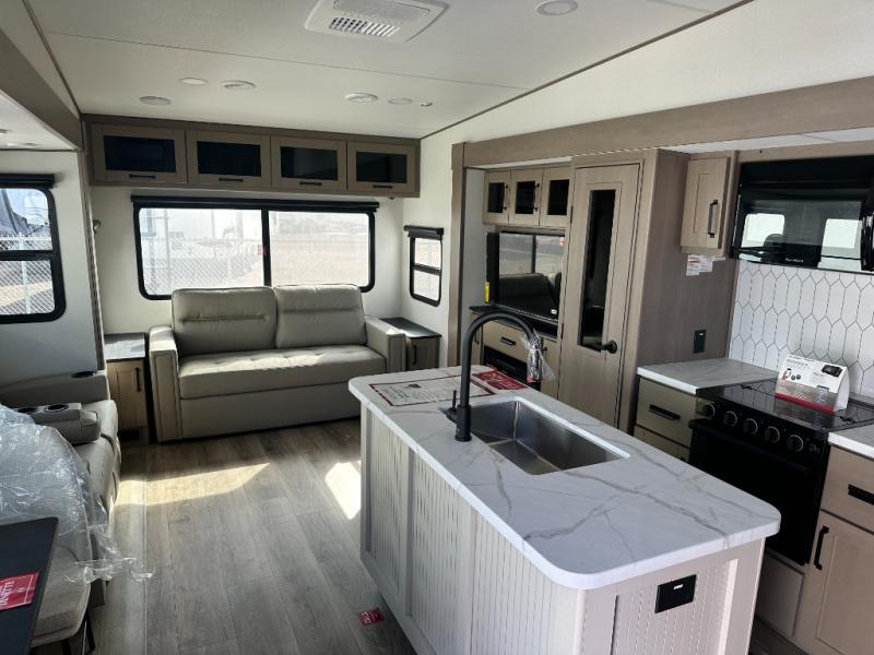 Get ready to enjoy everything the campgrounds and surrounding area has to offer when you are setup to camp in this fifth wheel! The two electric awnings offer protected areas creating outdoor living spaces; just grab your camping chairs from the unobstructed pass-through storage. And the interior offers a spacious living area and kitchen combination with dual opposing slides for maximum space. You can sit on the tri-fold sofa or the dinette to lounge back and rest after a day of adventure. The hutch and kitchen island offer counter space to prepare and serve meals, and there is a large pantry for goodies. The 40" LED HDTV with a fireplace below provides entertainment before bedtime or on a rainy day. And the front bedroom offers privacy, a walk-around queen bed, and plenty of storage!
