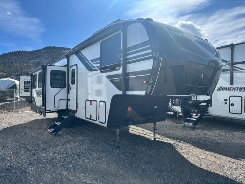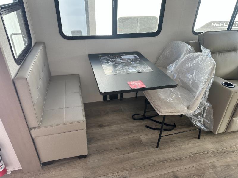 With any Reflection 150 Series fifth wheel by Grand Design, there is more available payload capacity and a broader range of half-ton trucks capable of towing this fifth wheel, and no slider hitch is needed thanks to the 90-degree turning radius which makes them short bed friendly and easier to tow. The mandatory Ultimate Power package provides a "One-Touch" automatic leveling system and a detachable power cord with LED light for easy setup, plus motion sensor pass-through lighting and entry lighting, and the Tire Linc TPMS will help you stay safe on the road. The interior offers residential cabinetry and premium Congoleum flooring, to the booth dinette and residential-style window treatment. Make your refined decision today!