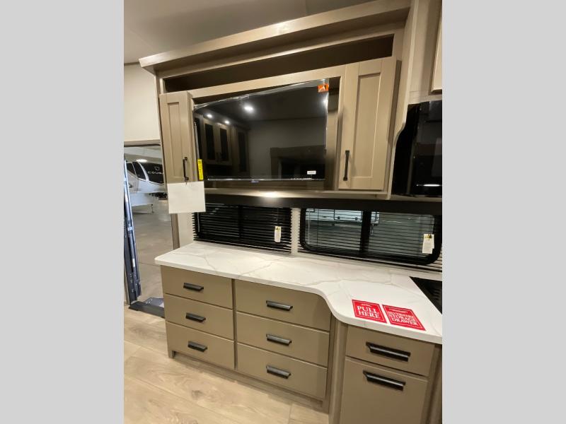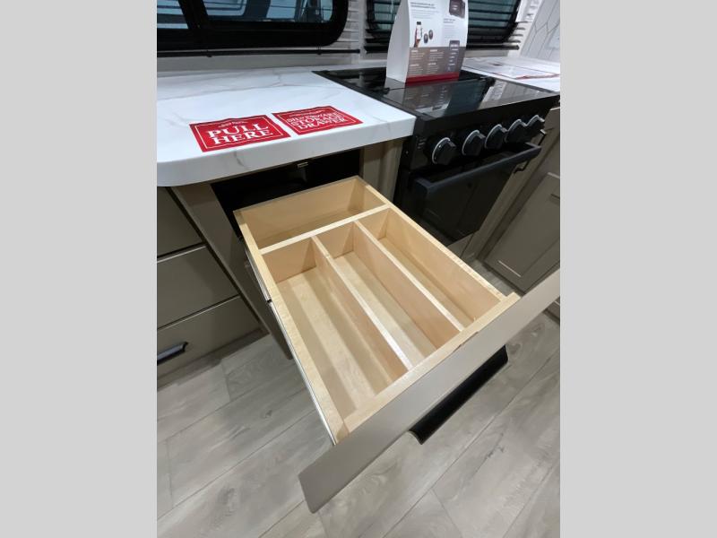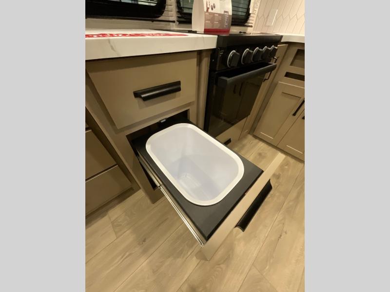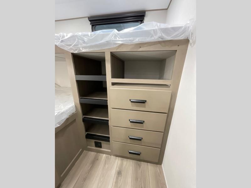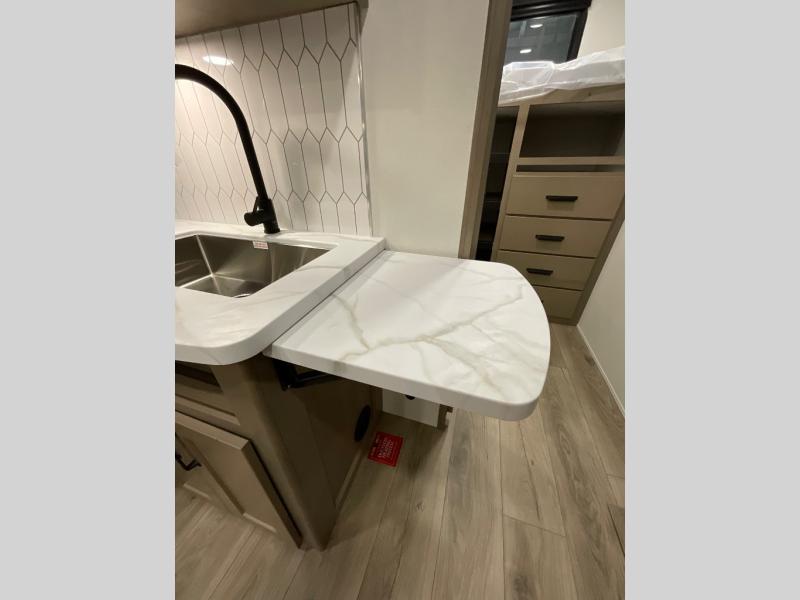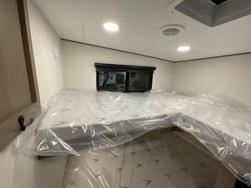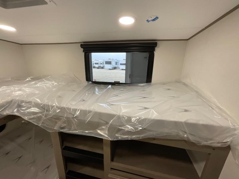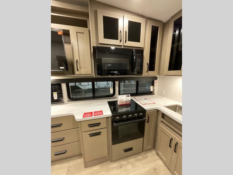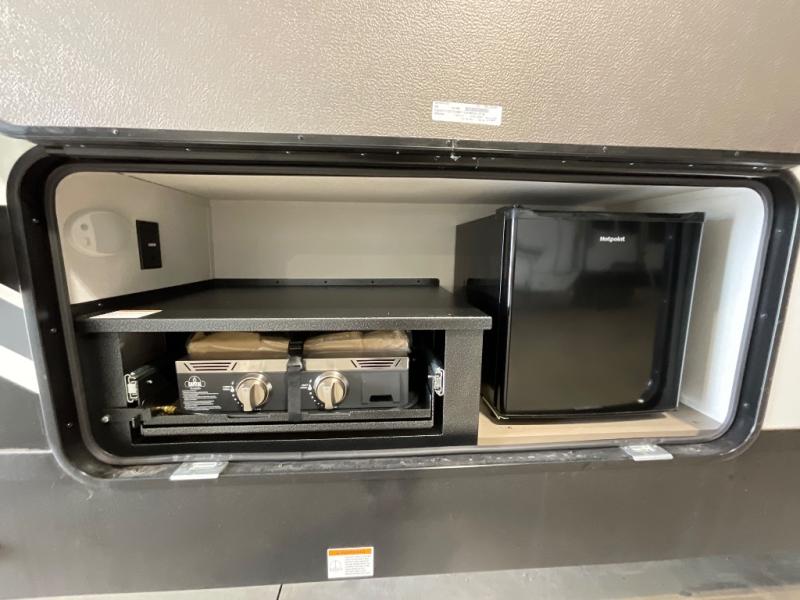 The whole family will enjoy camping in this fifth wheel! The kiddos will love having their own privacy with the rear private bunkhouse that has a 30" top bunk above a set of drawers, a 34" top bunk above a 48" lower bunk, and a TV prep area. You will enjoy having your own private retreat too with a front private bedroom that has a queen bed for a good night's rest and a wardrobe for your hang up clothes. You could even transform the U-shaped dinette and tri-fold sofa into extra sleeping spaces, and the dinette could be switched out for the optional 78" theater seating. The chef will have an easy time preparing their best dishes with the three burner cooktop and flip-up countertop or they can breathe in some fresh air while they cook on the outside griddle and 1.6 cu. ft. refrigerator for a cold beverage!