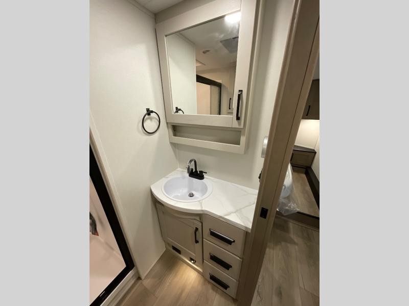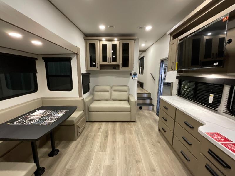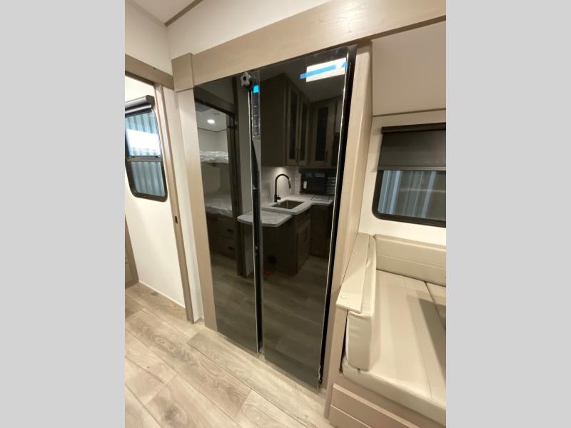 With any Reflection 150 Series fifth wheel by Grand Design, there is more available payload capacity and a broader range of half-ton trucks capable of towing this fifth wheel, and no slider hitch is needed thanks to the 90-degree turning radius which makes them short bed friendly and easier to tow. The mandatory Ultimate Power package provides a "One-Touch" automatic leveling system and a detachable power cord with LED light for easy setup, plus motion sensor pass-through lighting and entry lighting, and the Tire Linc TPMS will help you stay safe on the road. The interior offers residential cabinetry and premium Congoleum flooring, to the booth dinette and residential-style window treatment. Make your refined decision today!