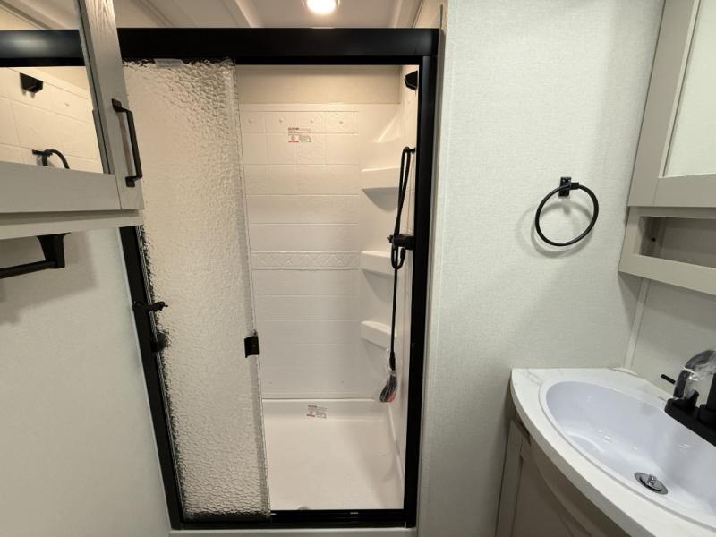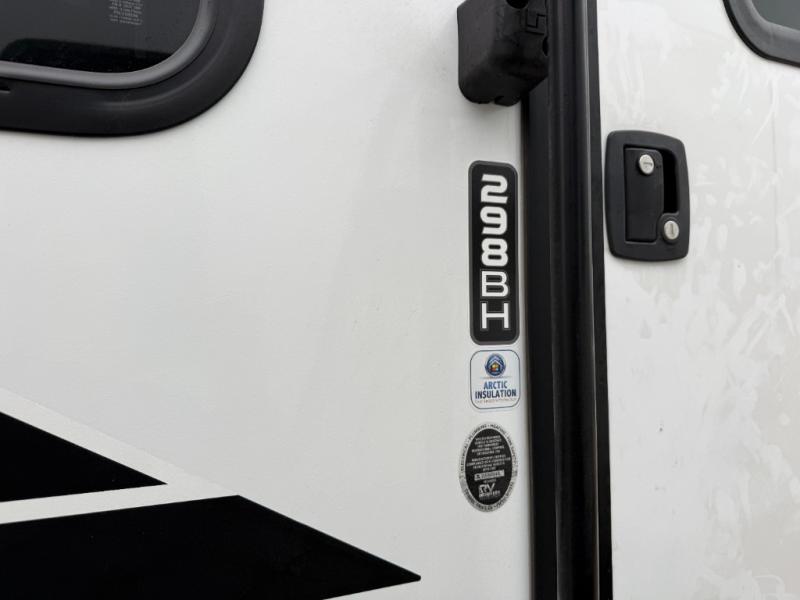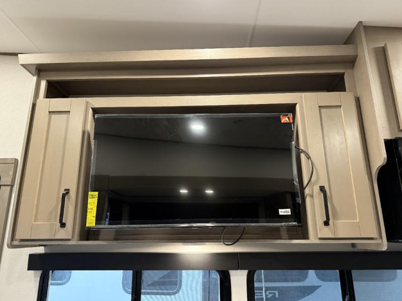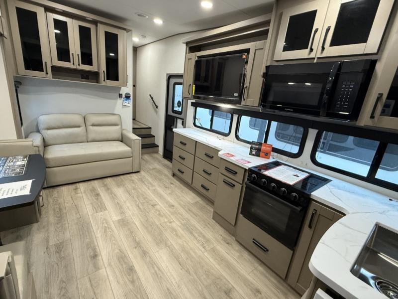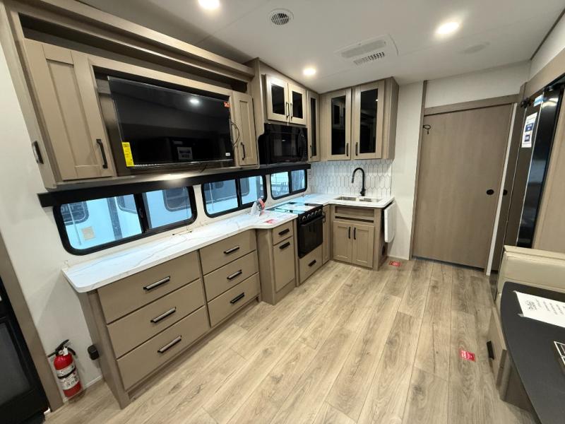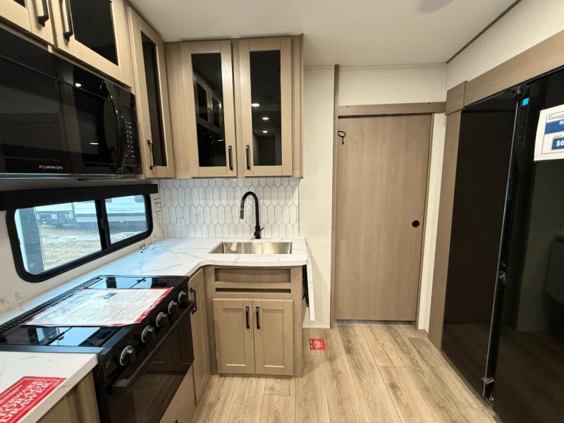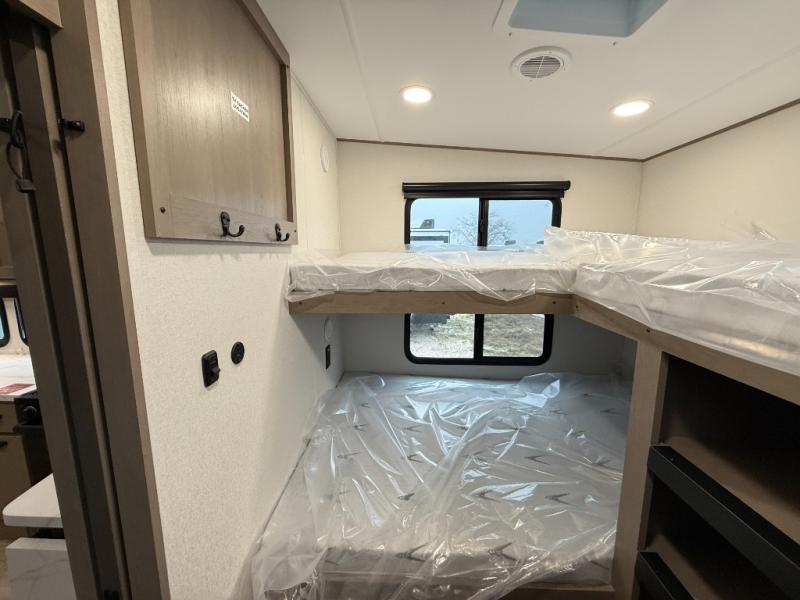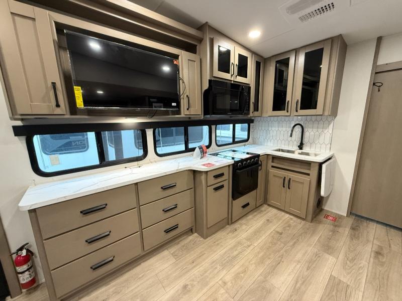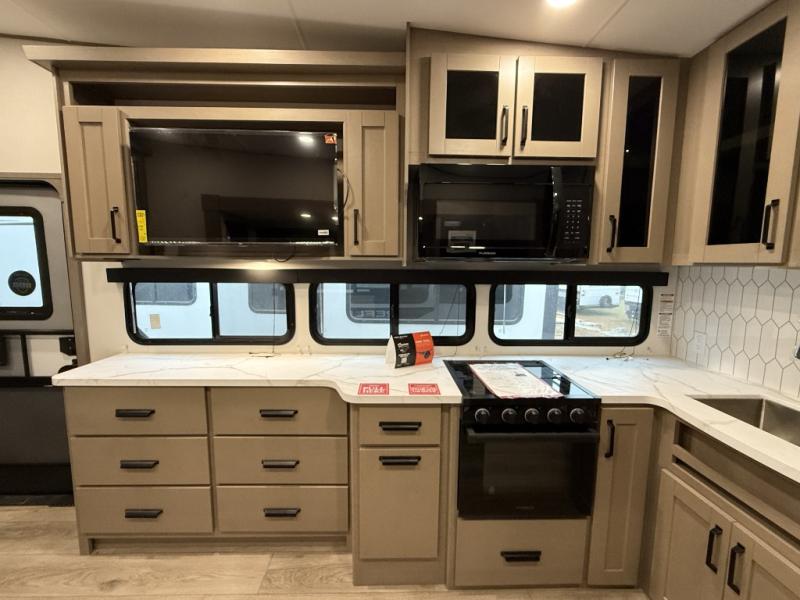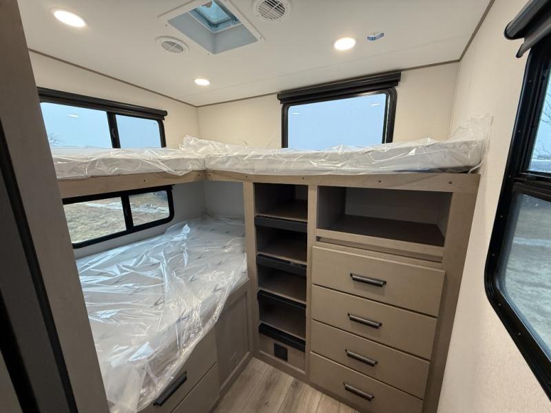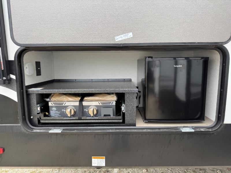 The whole family will enjoy camping in this fifth wheel! The kiddos will love having their own privacy with the rear private bunkhouse that has a 30" top bunk above a set of drawers, a 34" top bunk above a 48" lower bunk, and a TV prep area. You will enjoy having your own private retreat too with a front private bedroom that has a queen bed for a good night's rest and a wardrobe for your hang up clothes. You could even transform the U-shaped dinette and tri-fold sofa into extra sleeping spaces, and the dinette could be switched out for the optional 78" theater seating. The chef will have an easy time preparing their best dishes with the three burner cooktop and flip-up countertop or they can breathe in some fresh air while they cook on the outside griddle and 1.6 cu. ft. refrigerator for a cold beverage!