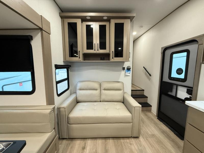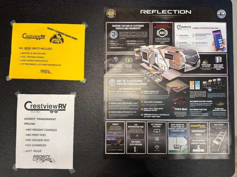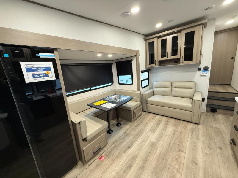 With any Reflection 150 Series fifth wheel by Grand Design, there is more available payload capacity and a broader range of half-ton trucks capable of towing this fifth wheel, and no slider hitch is needed thanks to the 90-degree turning radius which makes them short bed friendly and easier to tow. The mandatory Ultimate Power package provides a "One-Touch" automatic leveling system and a detachable power cord with LED light for easy setup, plus motion sensor pass-through lighting and entry lighting, and the Tire Linc TPMS will help you stay safe on the road. The interior offers residential cabinetry and premium Congoleum flooring, to the booth dinette and residential-style window treatment. Make your refined decision today!