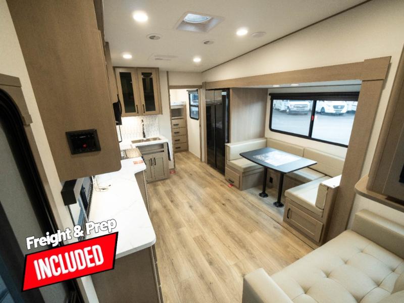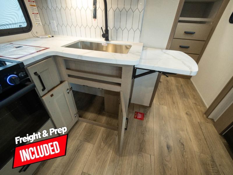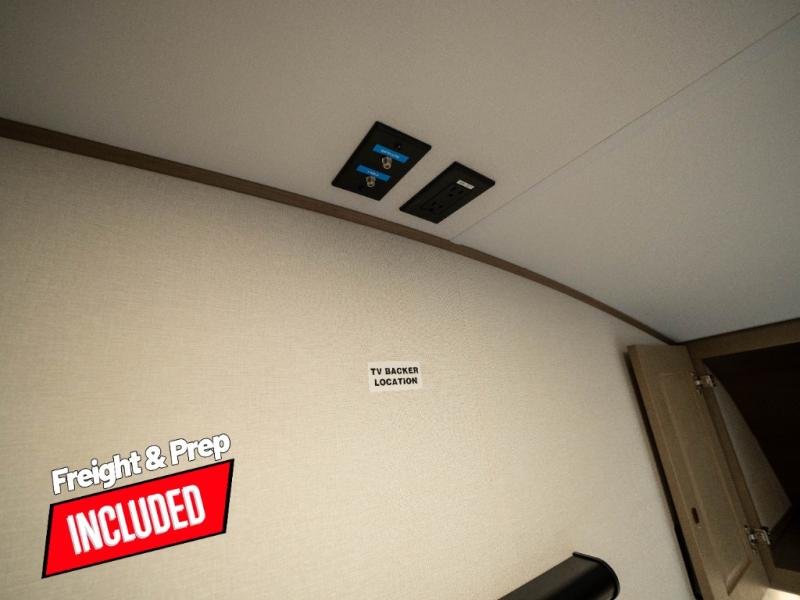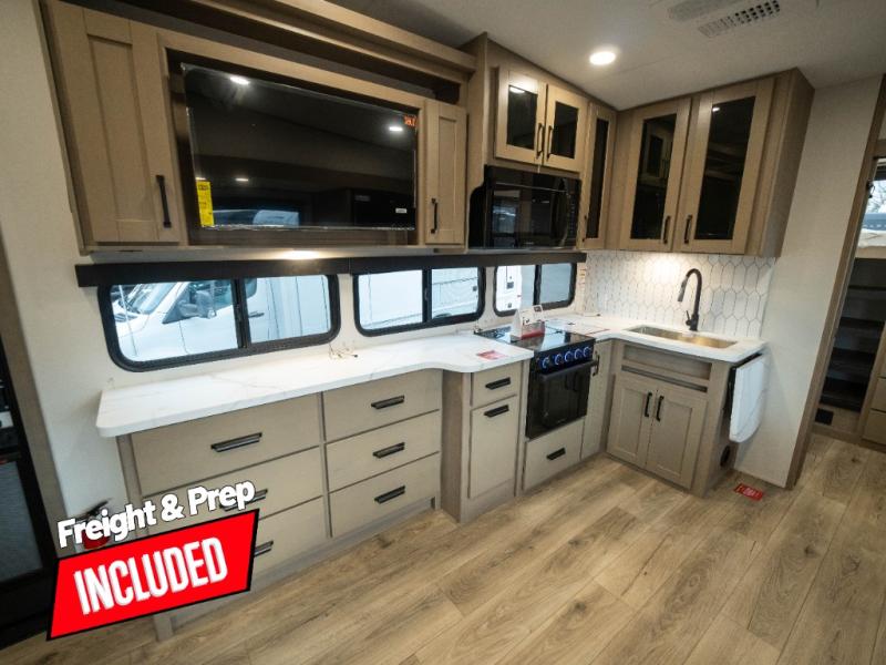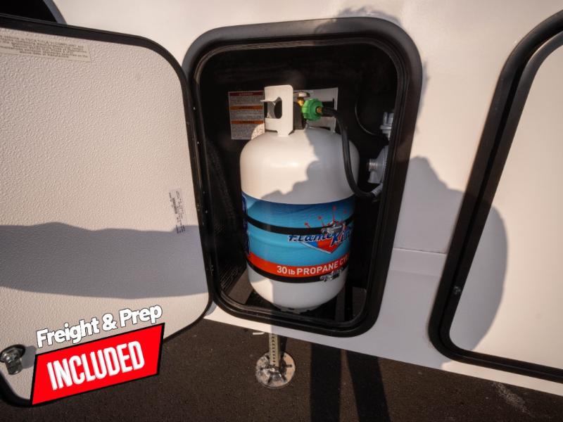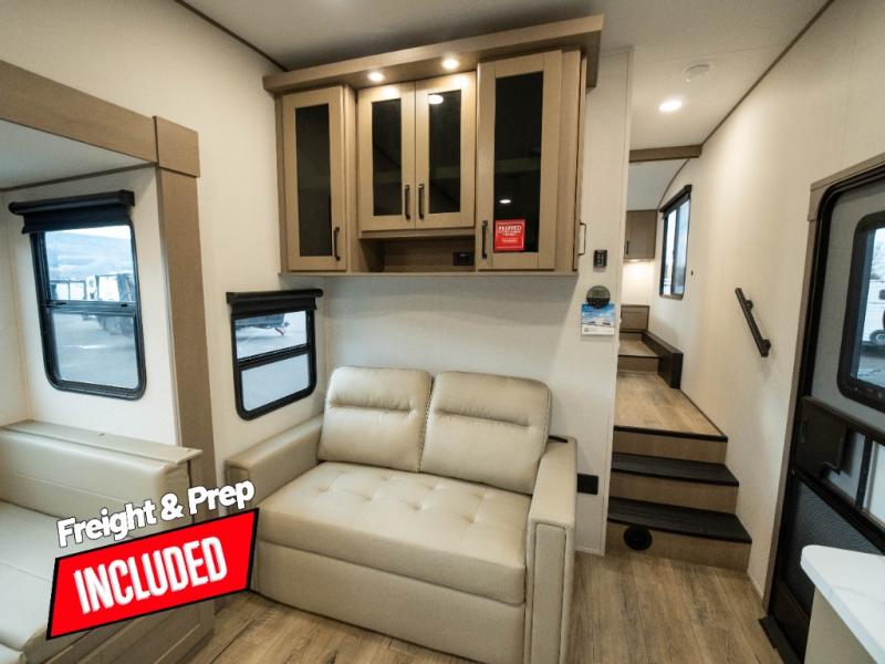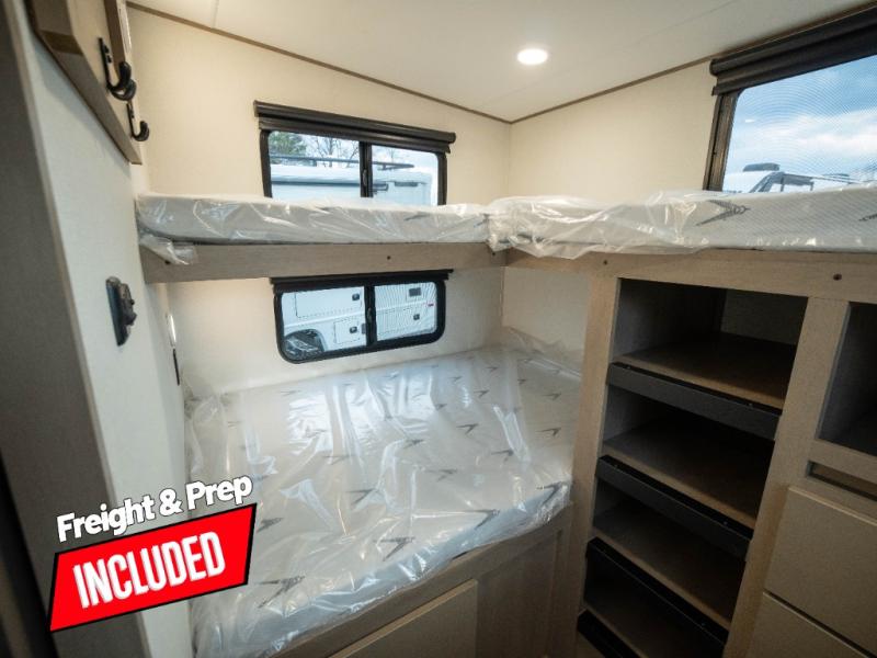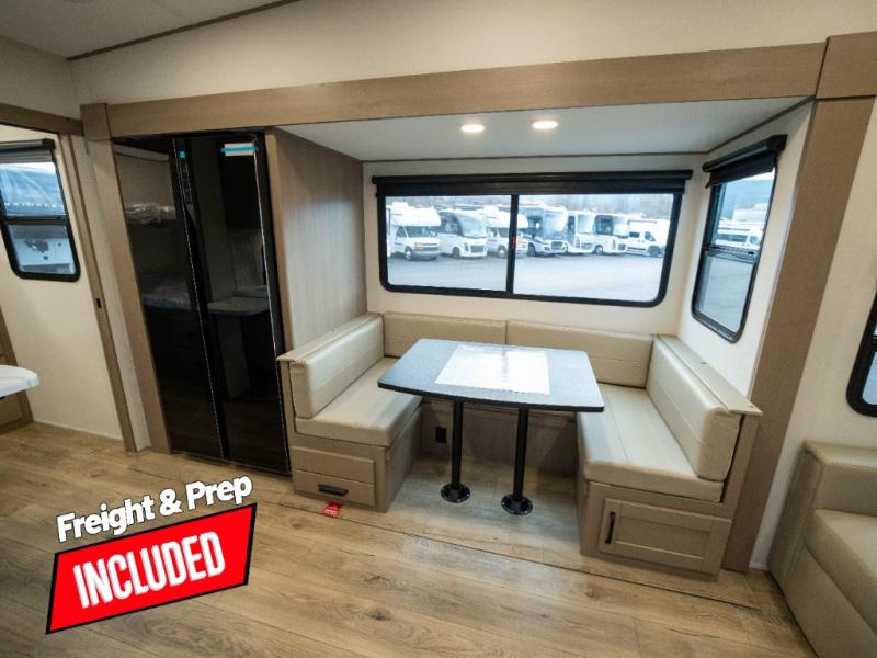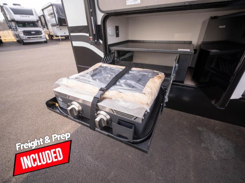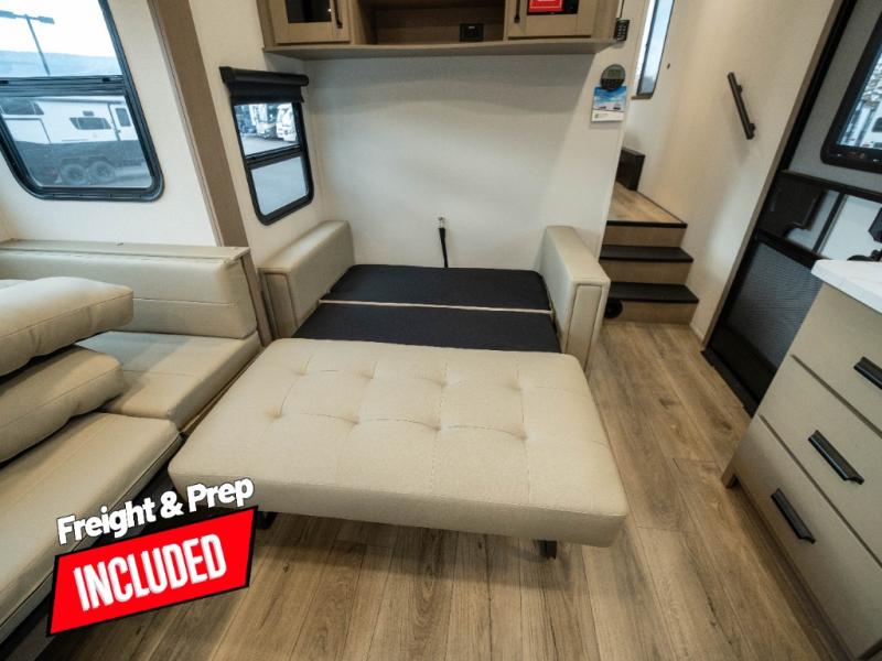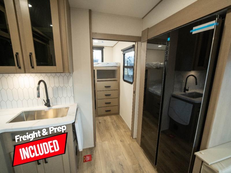 The whole family will enjoy camping in this fifth wheel! The kiddos will love having their own privacy with the rear private bunkhouse that has a 30" top bunk above a set of drawers, a 34" top bunk above a 48" lower bunk, and a TV prep area. You will enjoy having your own private retreat too with a front private bedroom that has a queen bed for a good night's rest and a wardrobe for your hang up clothes. You could even transform the U-shaped dinette and tri-fold sofa into extra sleeping spaces, and the dinette could be switched out for the optional 78" theater seating. The chef will have an easy time preparing their best dishes with the three-burner cooktop and flip-up countertop or they can breathe in some fresh air while they cook on the outside griddle and refrigerator for a cold beverage!