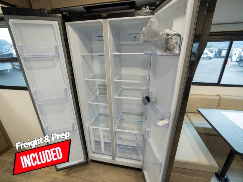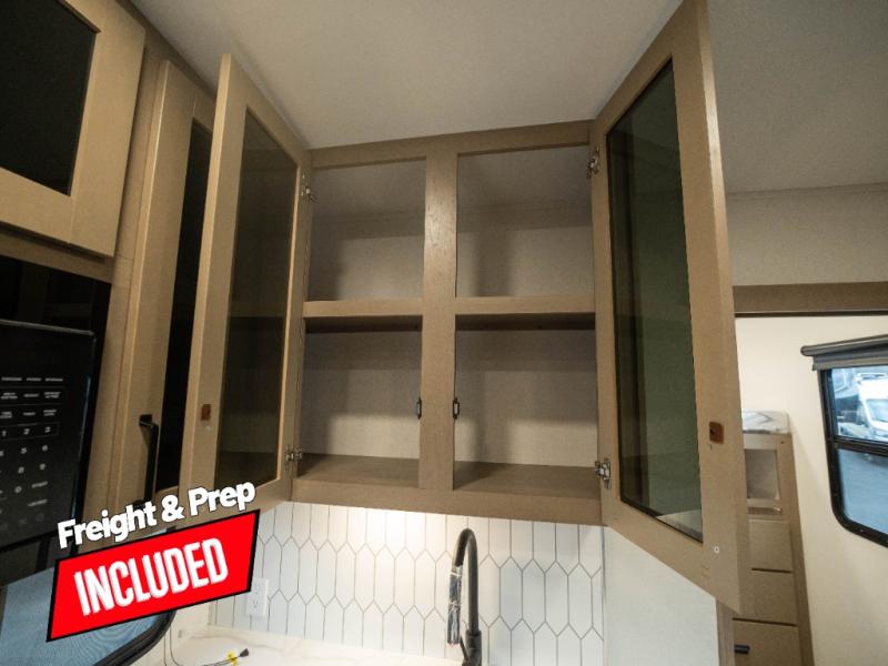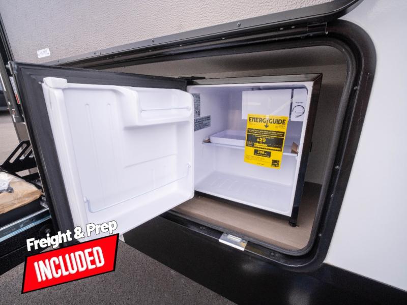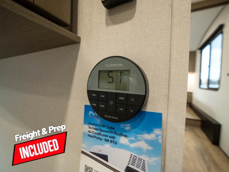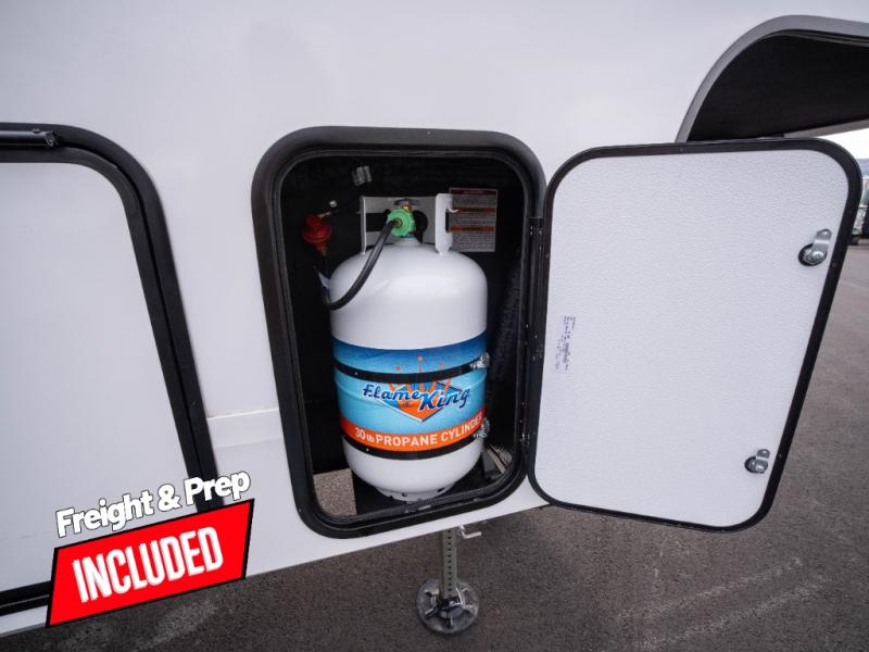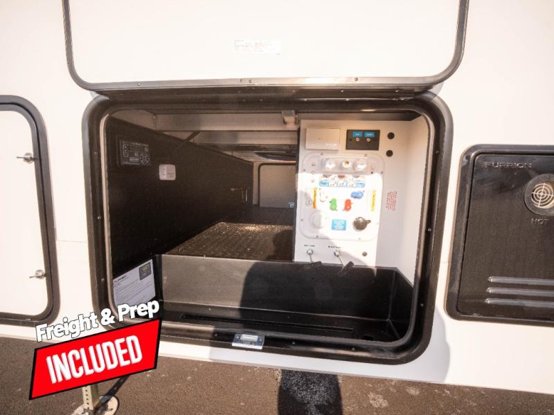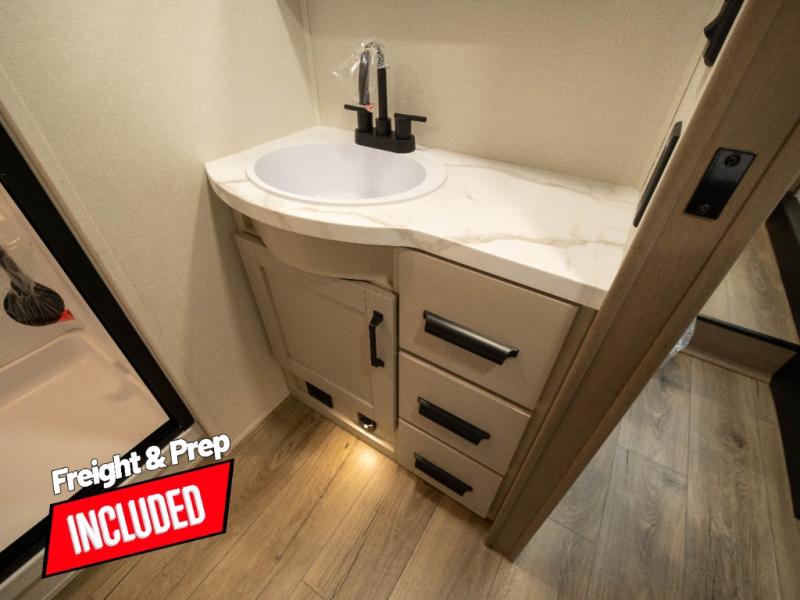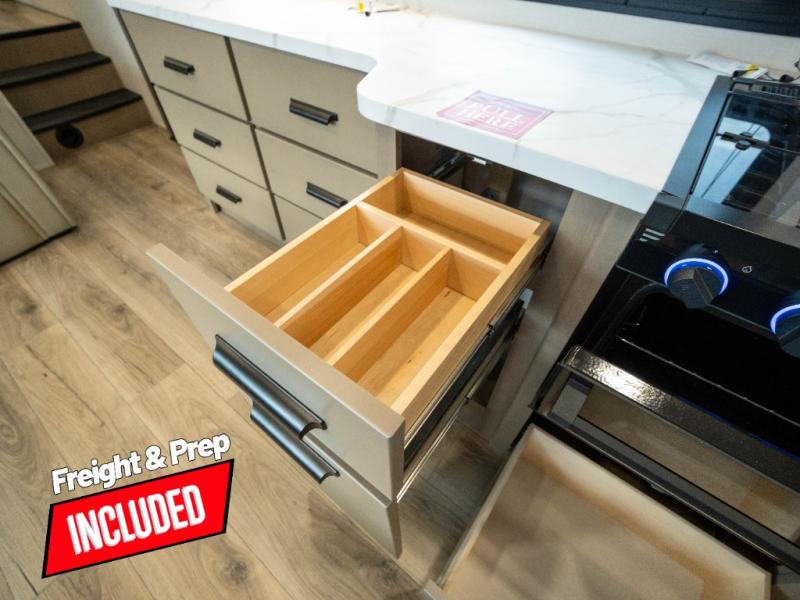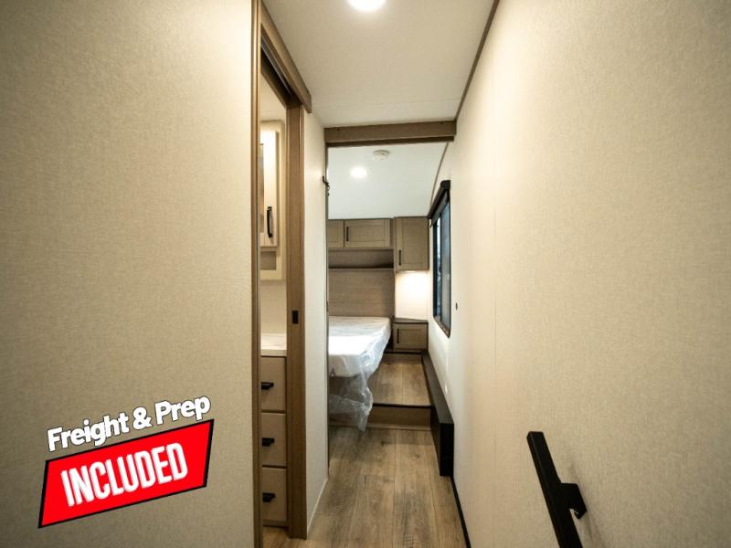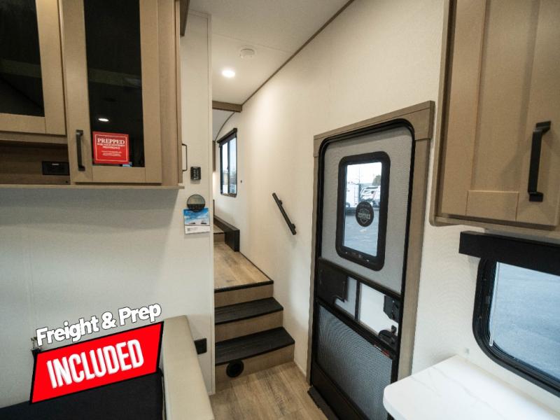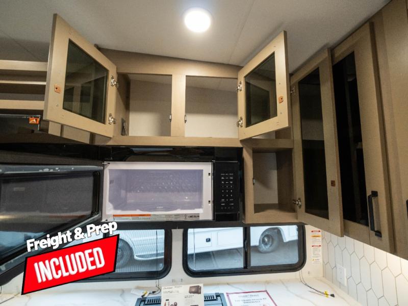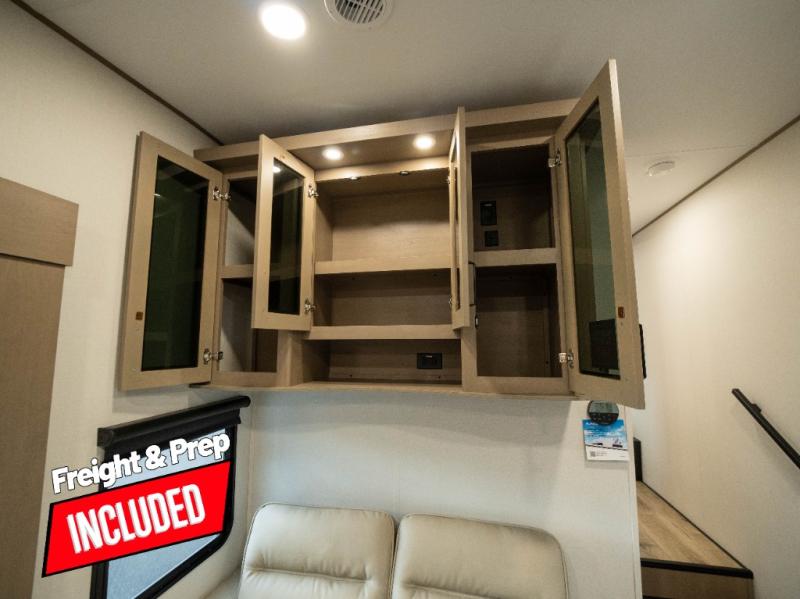 The whole family will enjoy camping in this fifth wheel! The kiddos will love having their own privacy with the rear private bunkhouse that has a 30" top bunk above a set of drawers, a 34" top bunk above a 48" lower bunk, and a TV prep area. You will enjoy having your own private retreat too with a front private bedroom that has a queen bed for a good night's rest and a wardrobe for your hang up clothes. You could even transform the U-shaped dinette and tri-fold sofa into extra sleeping spaces, and the dinette could be switched out for the optional 78" theater seating. The chef will have an easy time preparing their best dishes with the three-burner cooktop and flip-up countertop or they can breathe in some fresh air while they cook on the outside griddle and refrigerator for a cold beverage!