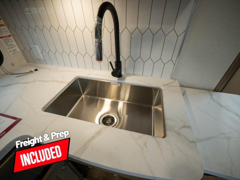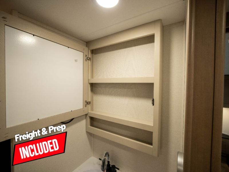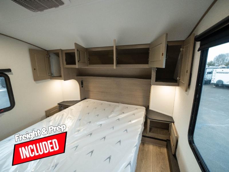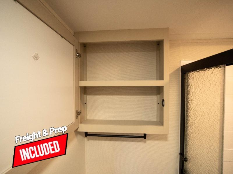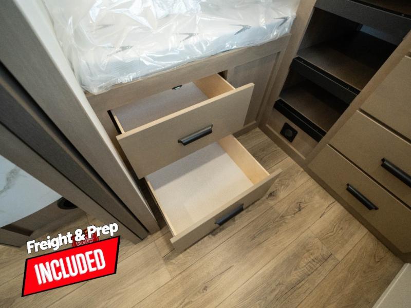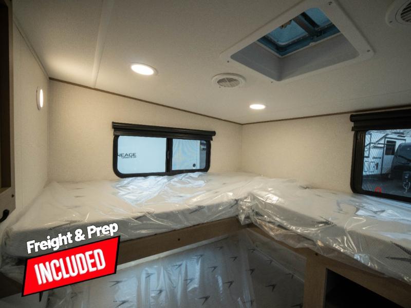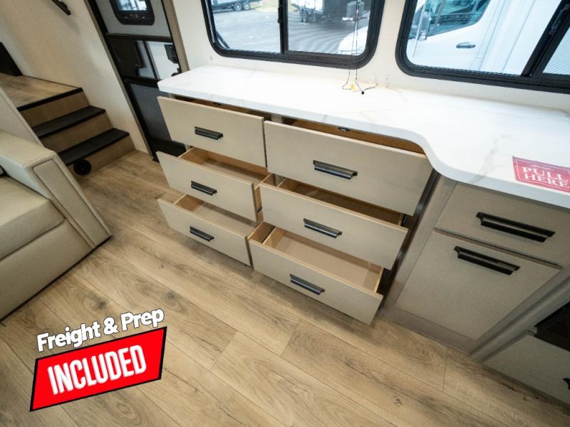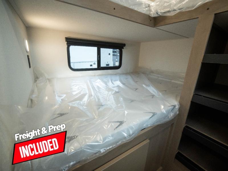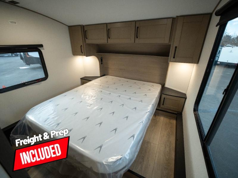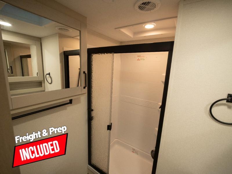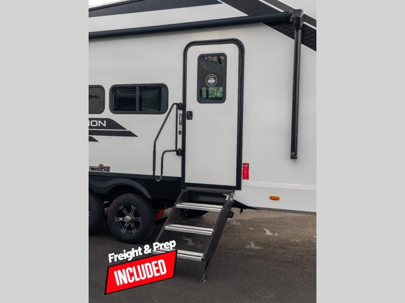 The whole family will enjoy camping in this fifth wheel! The kiddos will love having their own privacy with the rear private bunkhouse that has a 30" top bunk above a set of drawers, a 34" top bunk above a 48" lower bunk, and a TV prep area. You will enjoy having your own private retreat too with a front private bedroom that has a queen bed for a good night's rest and a wardrobe for your hang up clothes. You could even transform the U-shaped dinette and tri-fold sofa into extra sleeping spaces, and the dinette could be switched out for the optional 78" theater seating. The chef will have an easy time preparing their best dishes with the three-burner cooktop and flip-up countertop or they can breathe in some fresh air while they cook on the outside griddle and refrigerator for a cold beverage!