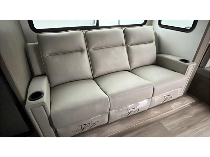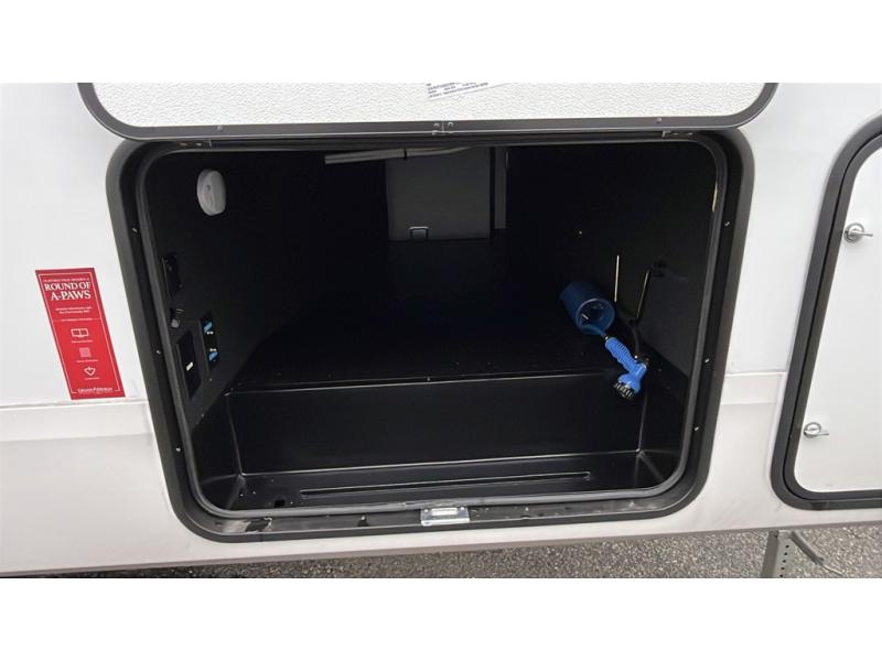 You will love this fifth wheel featuring a single slide for added interior living space and all the comforts and conveniences it provides you while you travel. The slide features a 78" theater seat plus there is a breakfast nook for more seating. Both can easily view the entertainment center with 40" TV. A rear kitchen indoors provides everything you need to create meals like home while on the road, and if you want to spend as much time outside as possible, then the outdoor griddle will certainly accommodate you for meals. Up front, a cozy private bedroom with queen bed, wardrobe, and overhead cabinets. Right next door, you will find a large walk-in shower, as well as a toilet, and a vanity with sink and linen cabinet for your towels and toiletries. You will also love the full unobstructed pass-through compartment for all of your gear, plus so much more!