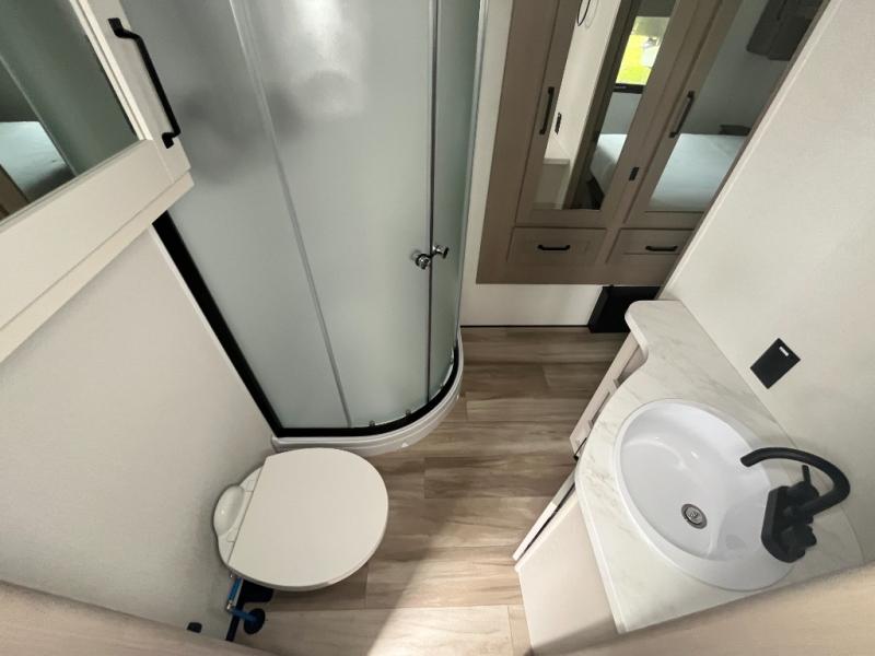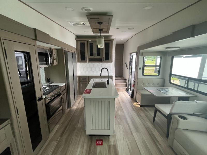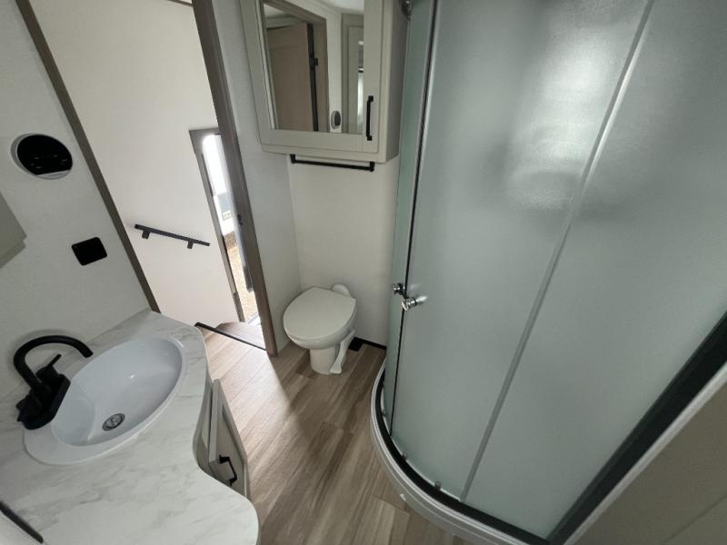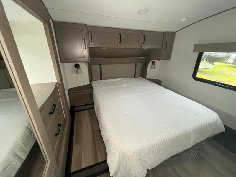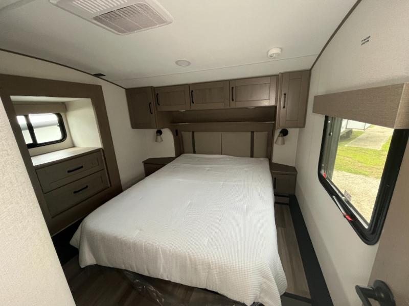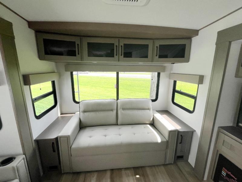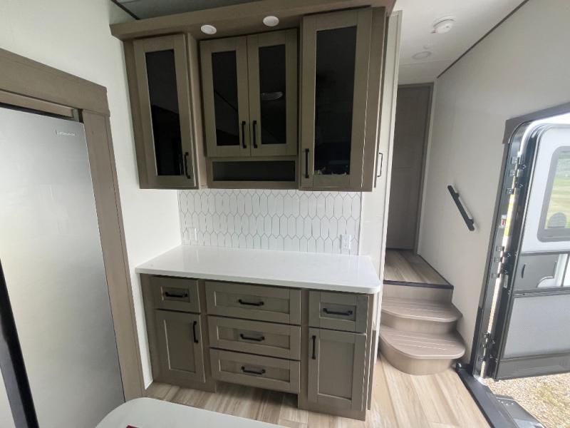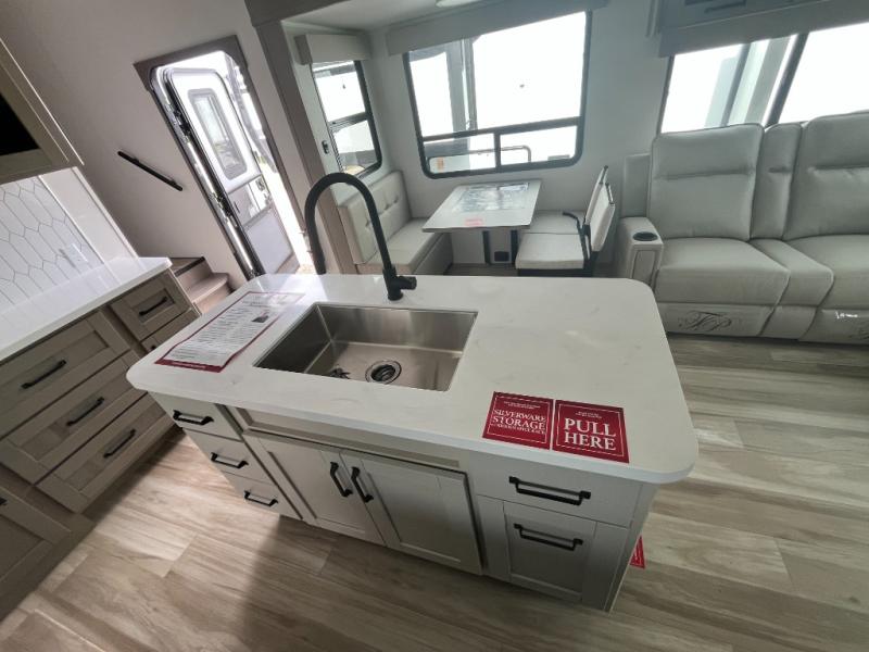 Whether you travel for pleasure or work, you will love the spacious main living and kitchen area with a rear tri-fold sofa that doubles as extra sleeping space, and the theater seating directly across from the entertainment center with a 40" LED HDTV and a fireplace below. The kitchen island will make meal prepping and drying the dishes easier and the hutch is the perfect place to place your picture frames, nice dishes, and extra cooking items. There is even a pantry that is big enough to store all of your favorite snacks, dry ingredients and such. Outside you can enjoy two electric awnings that provide protection from the elements as you relax and visit with other RVers, and your camping chairs can easily be stored in the pass-through compartment. The double entry bathroom is convenient especially at night when you can slide the door to enter from the front master bedroom. You will find plenty of storage for your clothing and gear, plus the bedroom slide out gives you drawers and linen storage that stretches into the full bathroom.