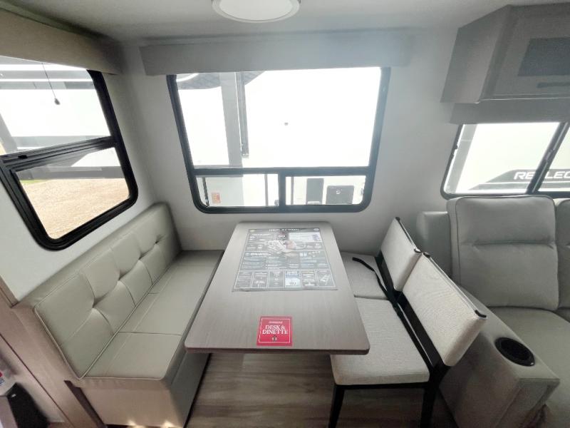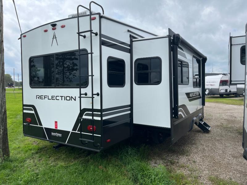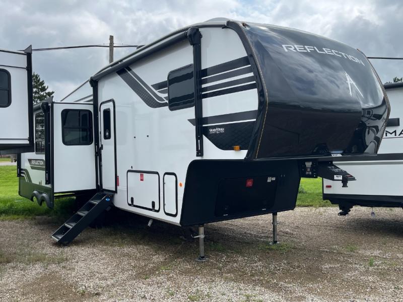 With any Reflection fifth wheel by Grand Design, you will have a solar panel for off-grid camping and a 60 amp charge controller and inverter prep, a Universal All-In-One docking station, unobstructed pass-through storage, and Goodyear Endurance tires. Each is constructed of gel coat exterior sidewalls, residential 5" truss rafters, walk-on roof decking, a fiberglass and radiant foil roof and front cap insulation plus laminated aluminum framed side walls, roof and end walls in slide rooms. Head inside to enjoy residential hardwood cabinet doors, premium Congoleum flooring, a spacious shower with a glass door, and many more comforts!