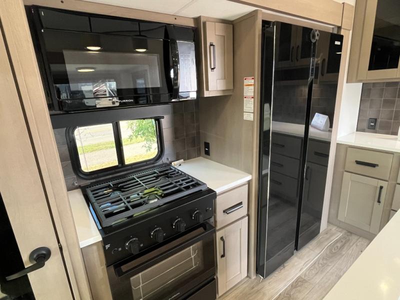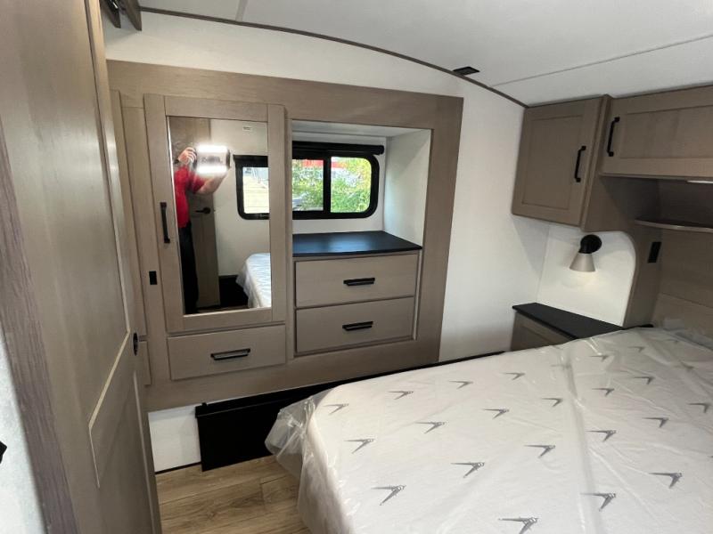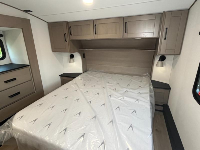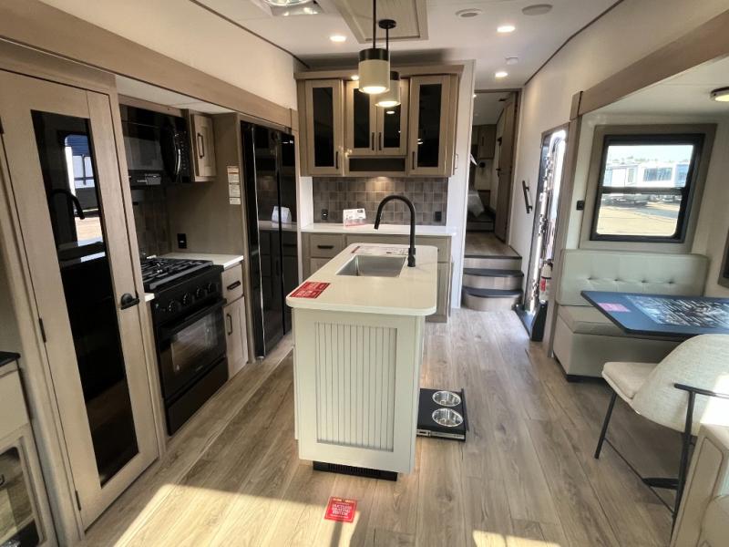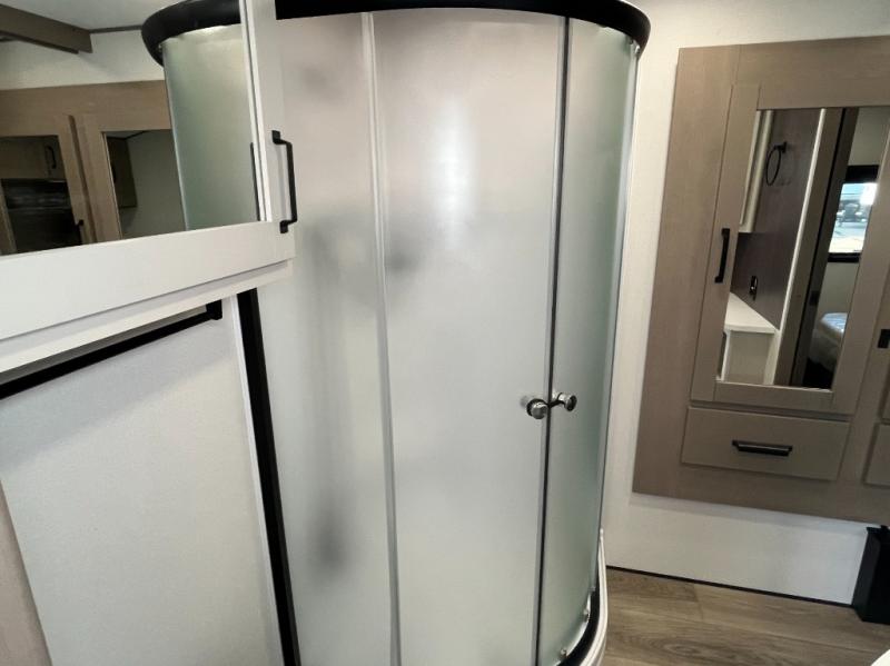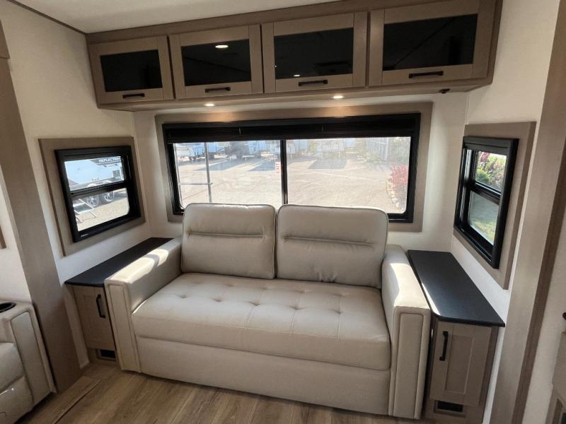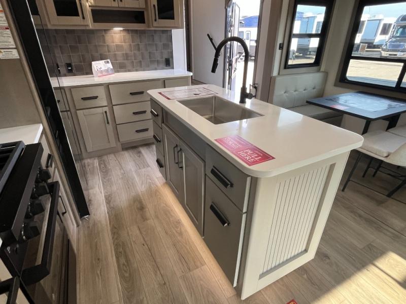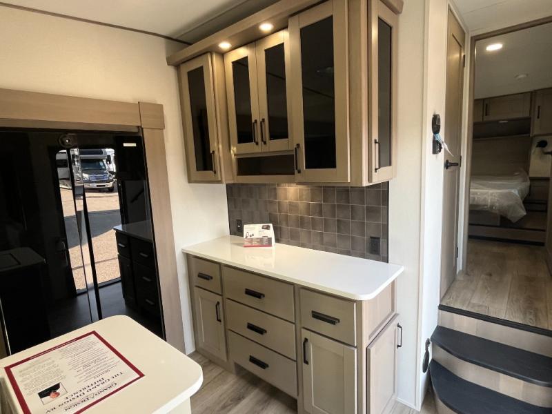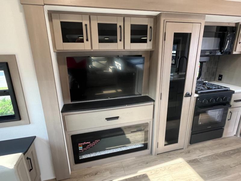 Whether you travel for pleasure or work, you will love the spacious main living and kitchen area with a rear tri-fold sofa that doubles as extra sleeping space, and the theater seating directly across from the entertainment center with a 40" LED HDTV and a fireplace below. The kitchen island will make meal prepping and drying the dishes easier and the hutch is the perfect place to place your picture frames, nice dishes, and extra cooking items. There is even a pantry that is big enough to store all of your favorite snacks, dry ingredients and such. Outside you can enjoy two electric awnings that provide protection from the elements as you relax and visit with other RVers, and your camping chairs can easily be stored in the pass-through compartment. The double entry bathroom is convenient especially at night when you can slide the door to enter from the front master bedroom. You will find plenty of storage for your clothing and gear, plus the bedroom slide out gives you drawers and linen storage that stretches into the full bathroom.