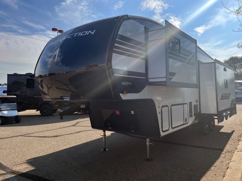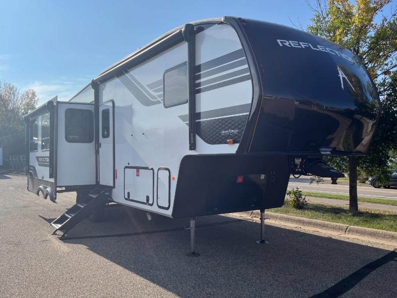 With any Reflection fifth wheel by Grand Design, you will have a solar panel for off-grid camping and a 60 amp charge controller and inverter prep, a Universal All-In-One docking station, unobstructed pass-through storage, and Goodyear Endurance tires. Each is constructed of gel coat exterior sidewalls, residential 5" truss rafters, walk-on roof decking, a fiberglass and radiant foil roof and front cap insulation plus laminated aluminum framed side walls, roof and end walls in slide rooms. Head inside to enjoy residential hardwood cabinet doors, premium Congoleum flooring, a spacious shower with a glass door, and many more comforts!