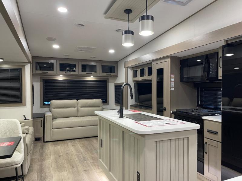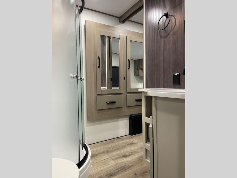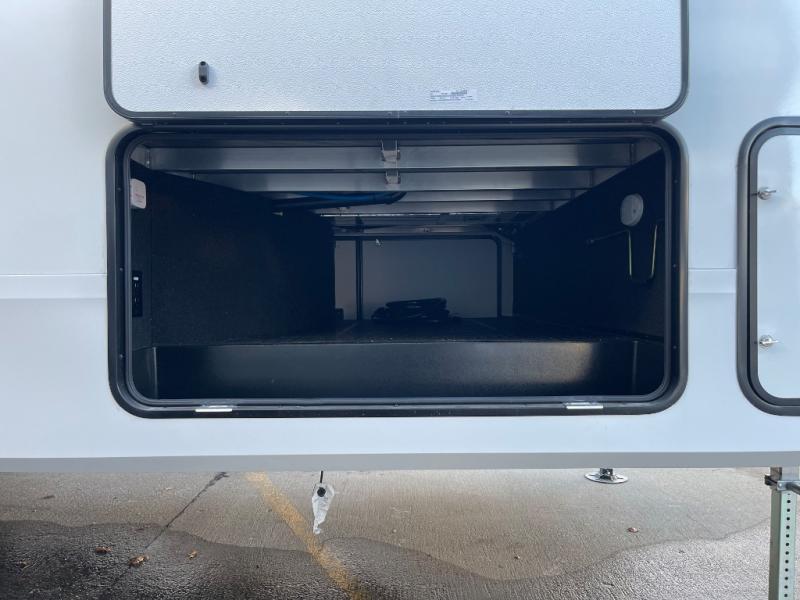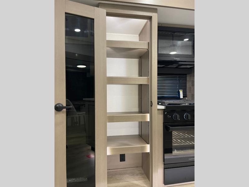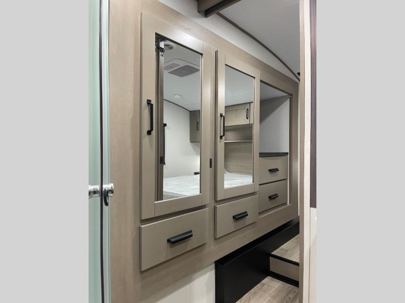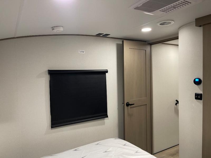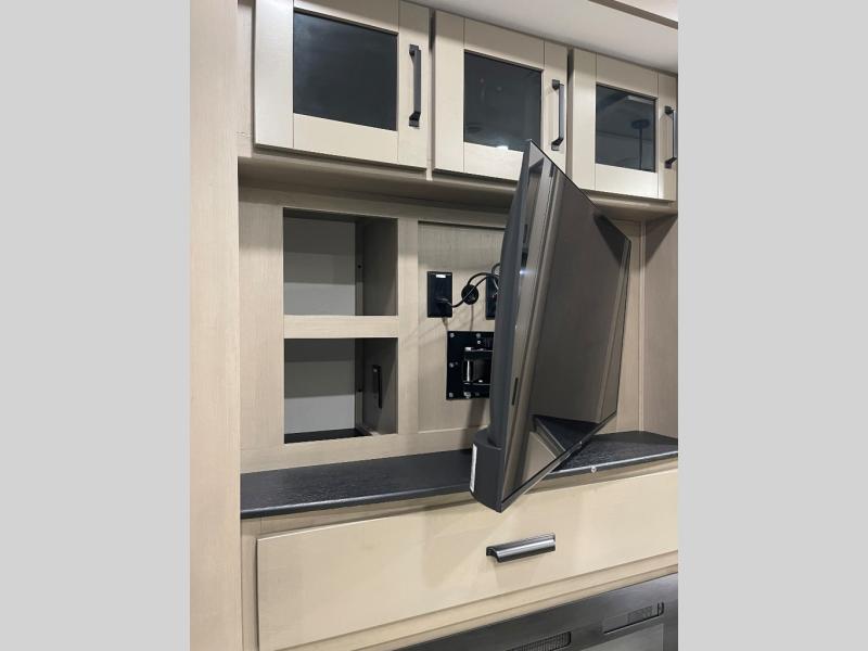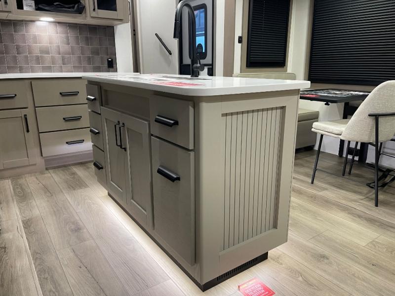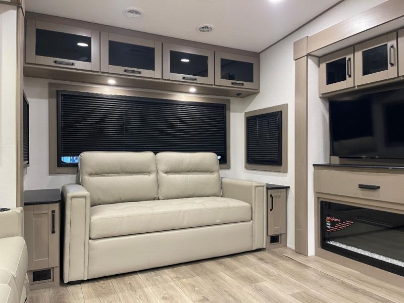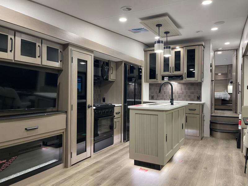 Whether you travel for pleasure or work, you will love the spacious main living and kitchen area with a rear tri-fold sofa that doubles as extra sleeping space, and the theater seating directly across from the entertainment center with a 40" LED HDTV and a fireplace below. The kitchen island will make meal prepping and drying the dishes easier and the hutch is the perfect place to place your picture frames, nice dishes, and extra cooking items. There is even a pantry that is big enough to store all of your favorite snacks, dry ingredients and such. Outside you can enjoy two electric awnings that provide protection from the elements as you relax and visit with other RVers, and your camping chairs can easily be stored in the pass-through compartment. The double entry bathroom is convenient especially at night when you can slide the door to enter from the front master bedroom. You will find plenty of storage for your clothing and gear, plus the bedroom slide out gives you drawers and linen storage that stretches into the full bathroom.