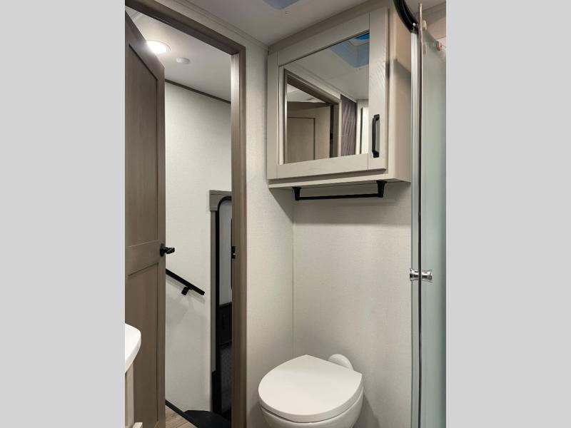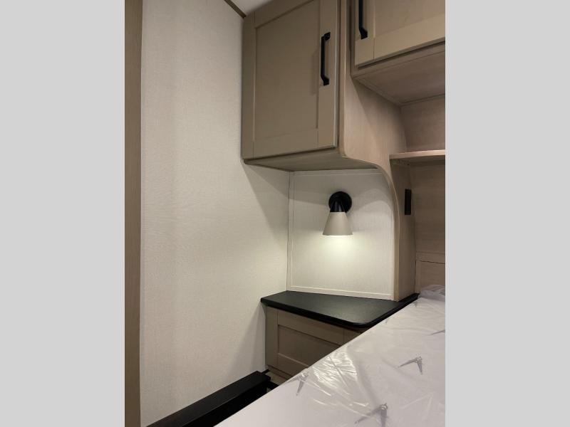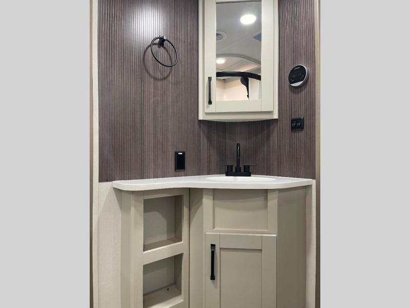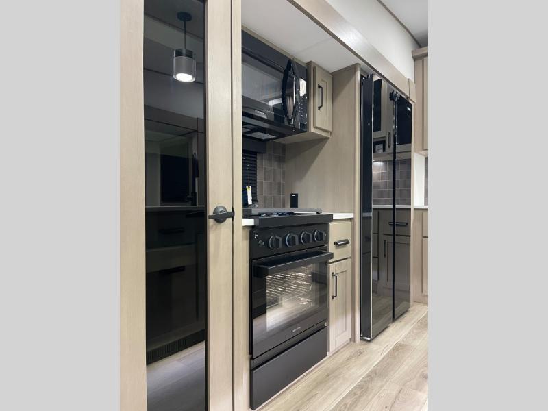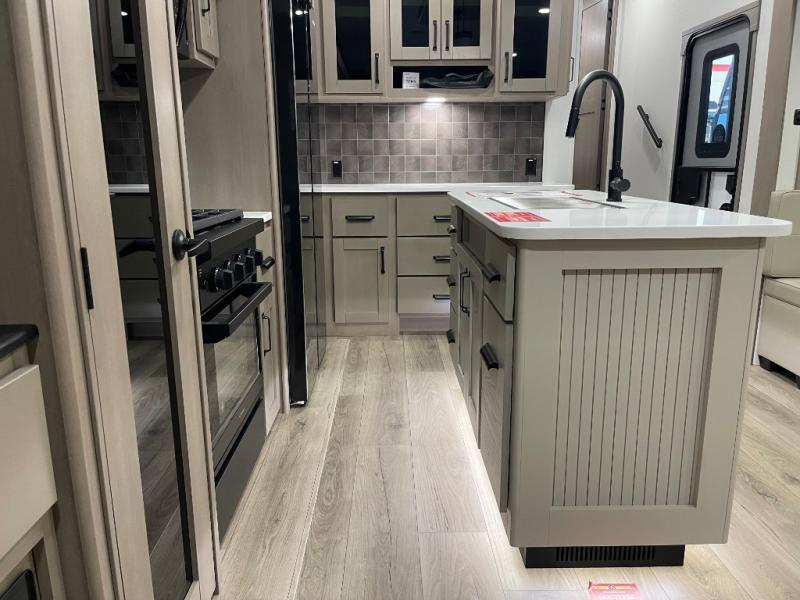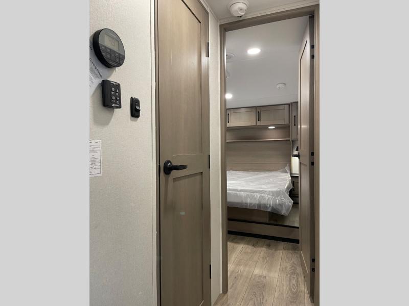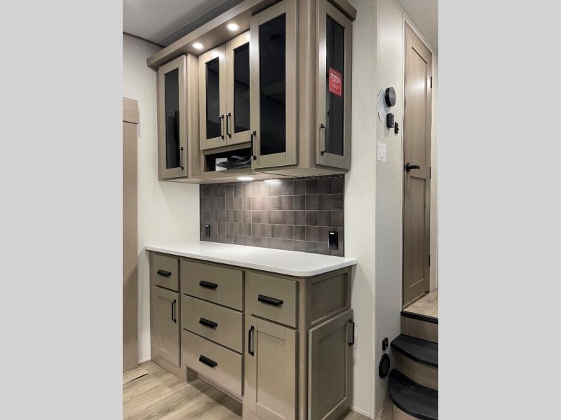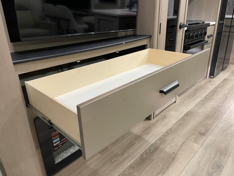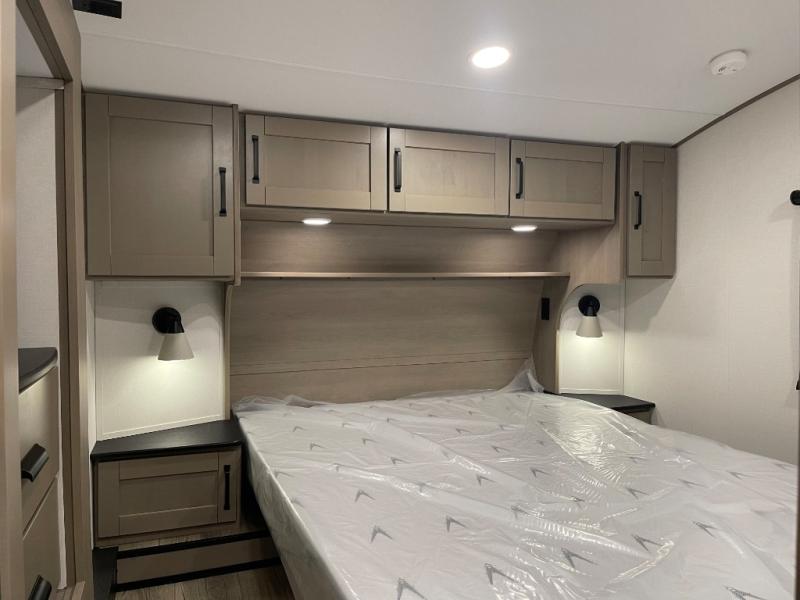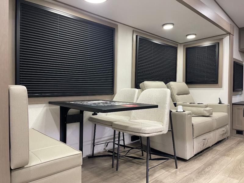 Whether you travel for pleasure or work, you will love the spacious main living and kitchen area with a rear tri-fold sofa that doubles as extra sleeping space, and the theater seating directly across from the entertainment center with a 40" LED HDTV and a fireplace below. The kitchen island will make meal prepping and drying the dishes easier and the hutch is the perfect place to place your picture frames, nice dishes, and extra cooking items. There is even a pantry that is big enough to store all of your favorite snacks, dry ingredients and such. Outside you can enjoy two electric awnings that provide protection from the elements as you relax and visit with other RVers, and your camping chairs can easily be stored in the pass-through compartment. The double entry bathroom is convenient especially at night when you can slide the door to enter from the front master bedroom. You will find plenty of storage for your clothing and gear, plus the bedroom slide out gives you drawers and linen storage that stretches into the full bathroom.